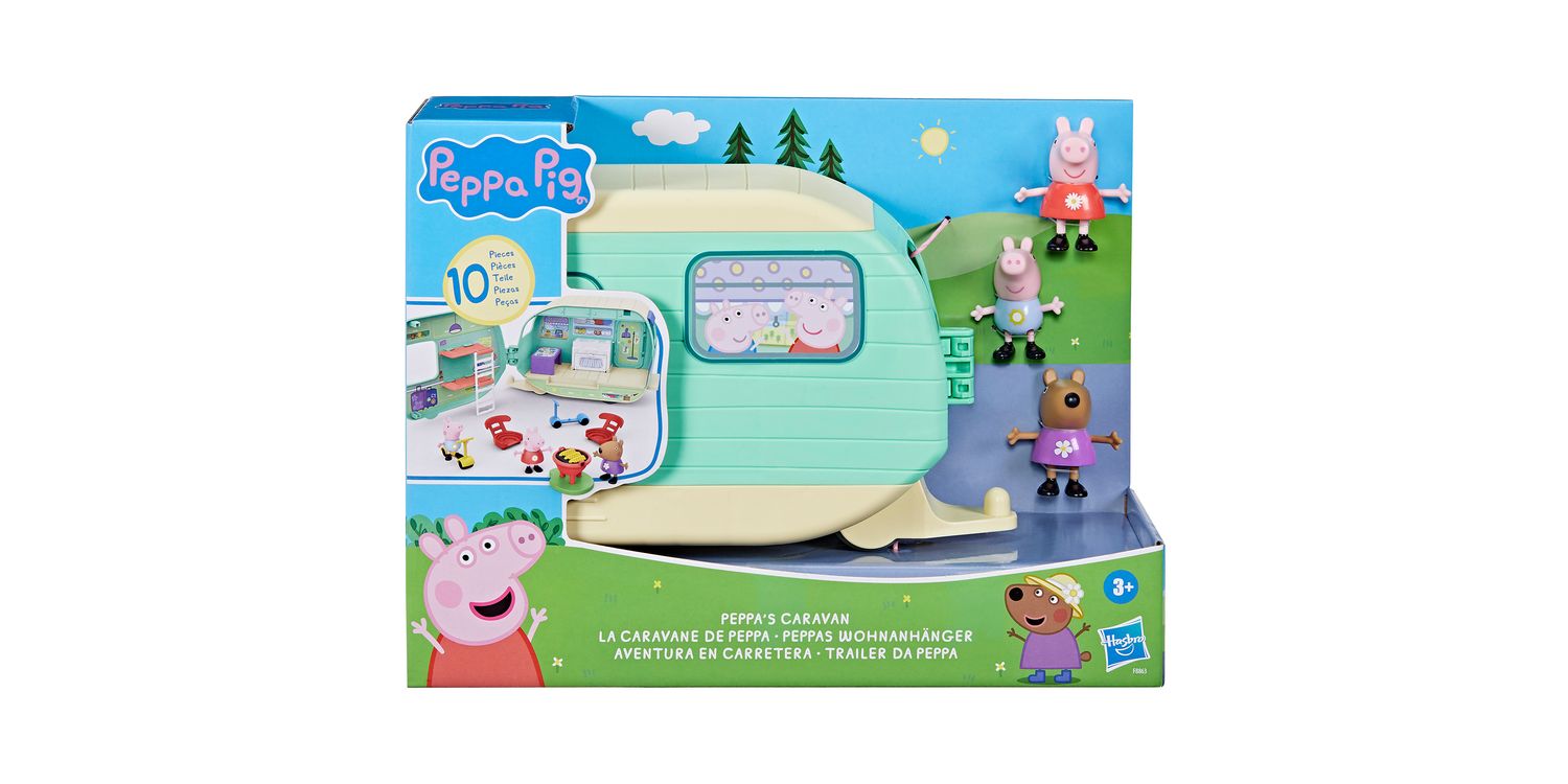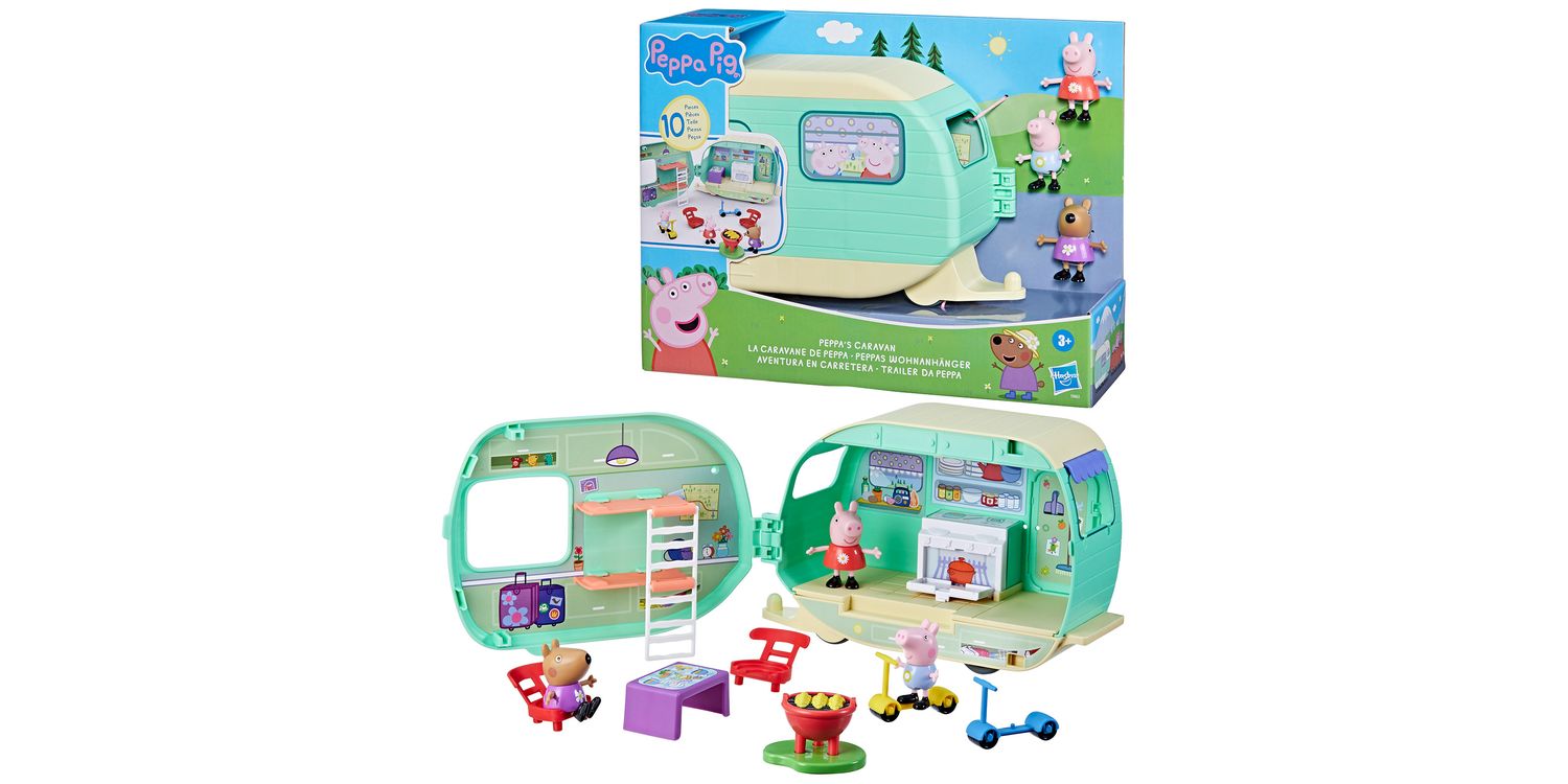 Get ready for camping trip fun with Peppa's Caravan toy set! This Peppa Pig camper van playset can be closed and towed behind Peppa's Family Red Car toy (sold separately, subject to availability), or it can be opened up so kids can imagine lots of activities, like cooking in the kitchen, sleeping in bunk beds, and more. Comes with 6 themed accessories so kids can set up their campsite as well as 3 figures based on favourite Peppa Pig characters, including George Pig, Birgit Bear, and Peppa herself! Peppa toys like Peppa's Caravan make great gifts for girls and boys ages 3 and up.