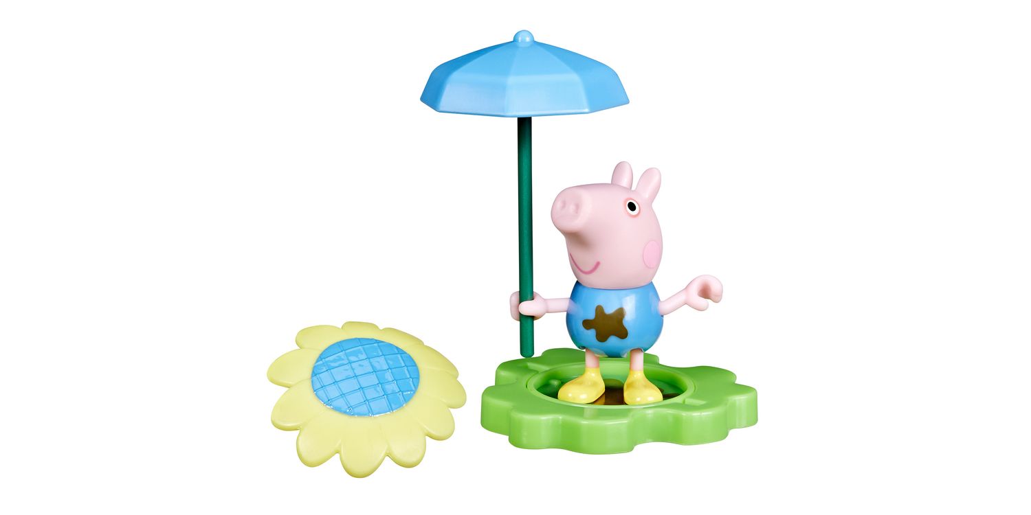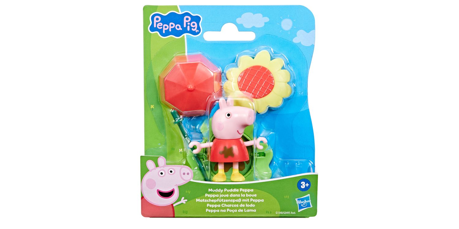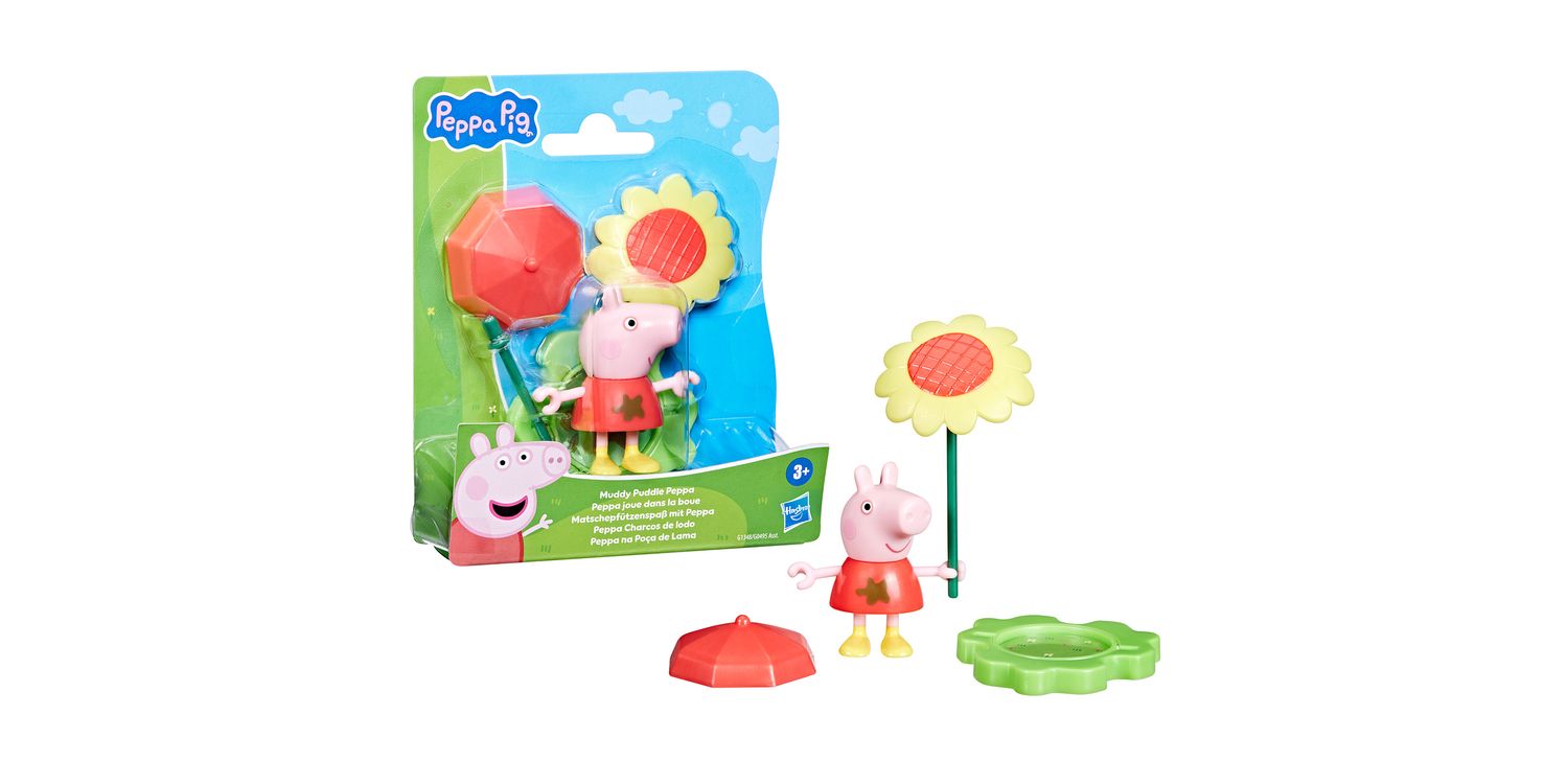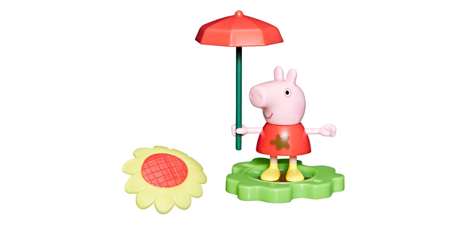 Rain or shine, it’s Peppa playtime with the Muddy Puddle Friends figures! Adorable 3-inch (7.5 cm) poseable figure can hold the included stick that becomes an umbrella for rainy days and a big sunflower for sunny days! The base piece can be flipped to show grass or a muddy puddle, paving the way for everyday adventures. Look for more Muddy Puddle Friends figures (each sold separately, subject to availability) and connect the bases for even more pretend play! Preschool toys like these make great party favours for a Peppa Pig birthday or small gifts for 3 year old girls and boys and up.