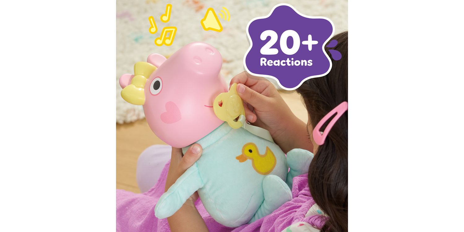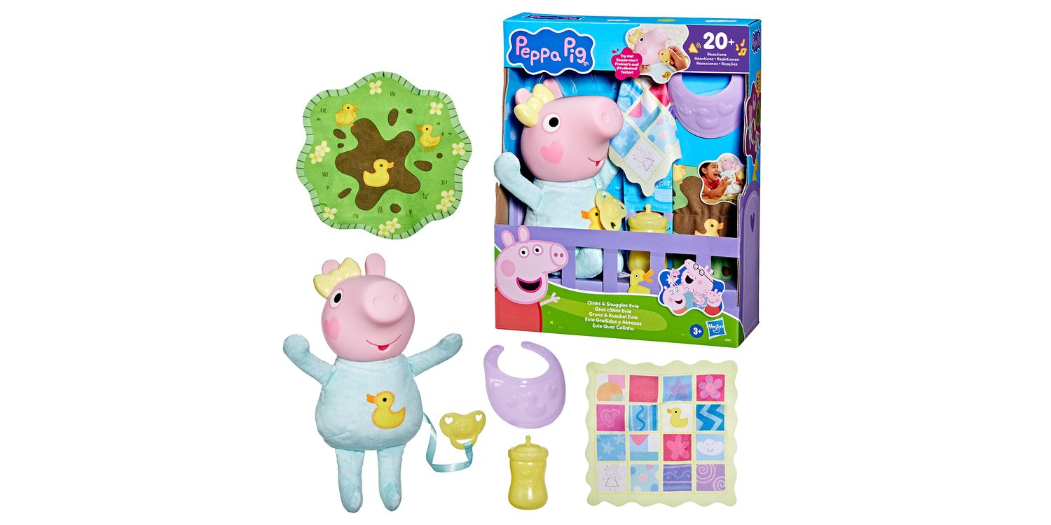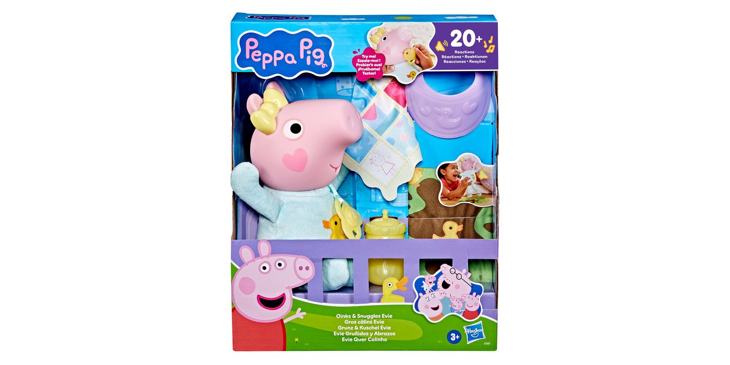 Peppa Pig's baby sister Evie is here! Kids can recreate their favourite scenes from the show with the Oinks & Snuggles Evie interactive baby doll with accessories. Activate over 20 different sound effects by giving her the pretend dummy (pacifier) or bottle, bouncing her up and down, or laying her down for pretend naptime. Cute accessories like a playmat, bib, and baby blanket add to the nurturing play. Peppa Pig toys like Oinks & Snuggles Evie make great gifts for girls and boys 3 years and up who love the animated series or who are becoming an older sibling. Look for more Peppa Pig figures and playsets featuring Baby Evie (each sold separately, subject to availability) for more Peppa Pig family fun!
