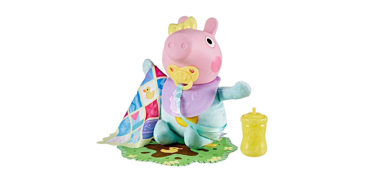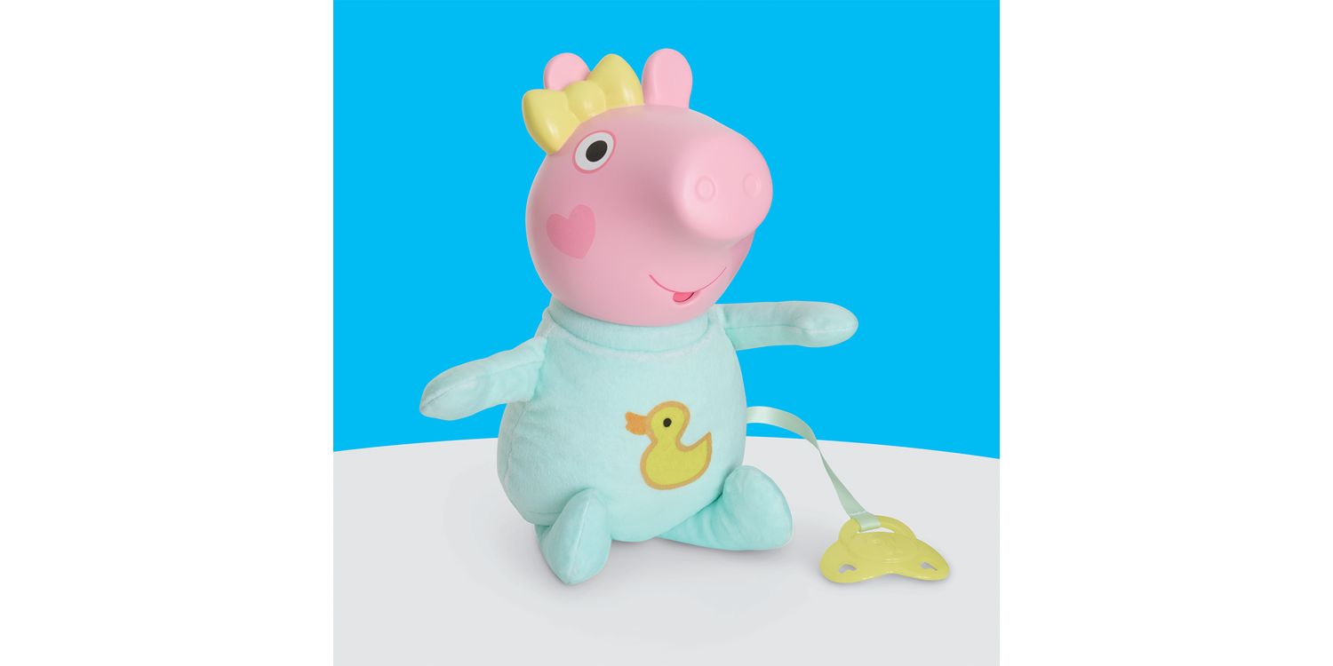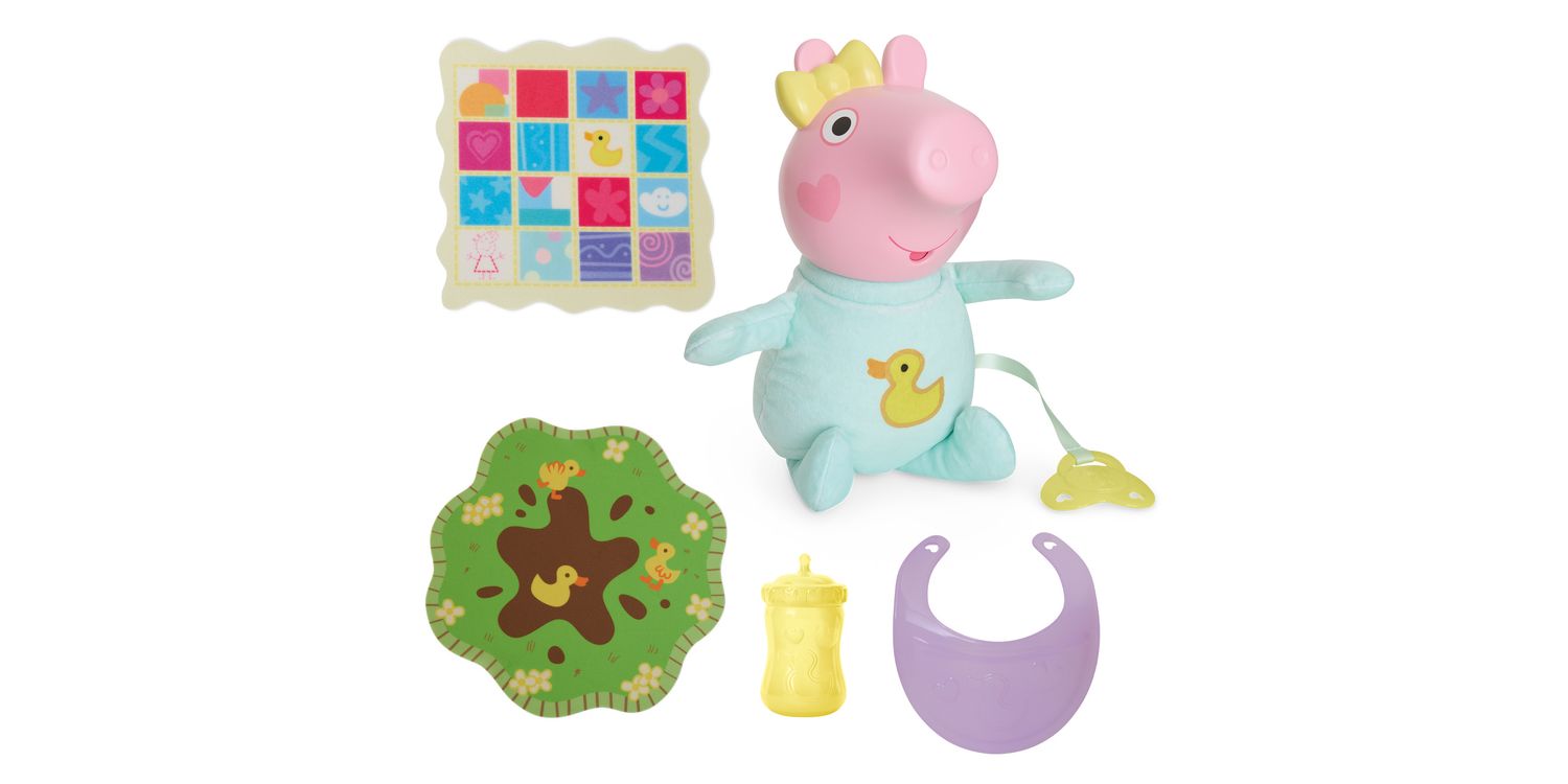 Peppa Pig's baby sister Evie is here! Kids can recreate their favourite scenes from the show with the Oinks & Snuggles Evie interactive baby doll with accessories. Activate over 20 different sound effects by giving her the pretend dummy (pacifier) or bottle, bouncing her up and down, or laying her down for pretend naptime. Cute accessories like a playmat, bib, and baby blanket add to the nurturing play. Peppa Pig toys like Oinks & Snuggles Evie make great gifts for girls and boys 3 years and up who love the animated series or who are becoming an older sibling. Look for more Peppa Pig figures and playsets featuring Baby Evie (each sold separately, subject to availability) for more Peppa Pig family fun!