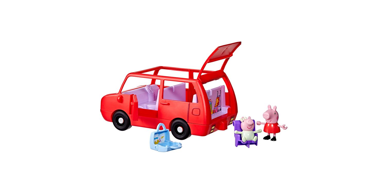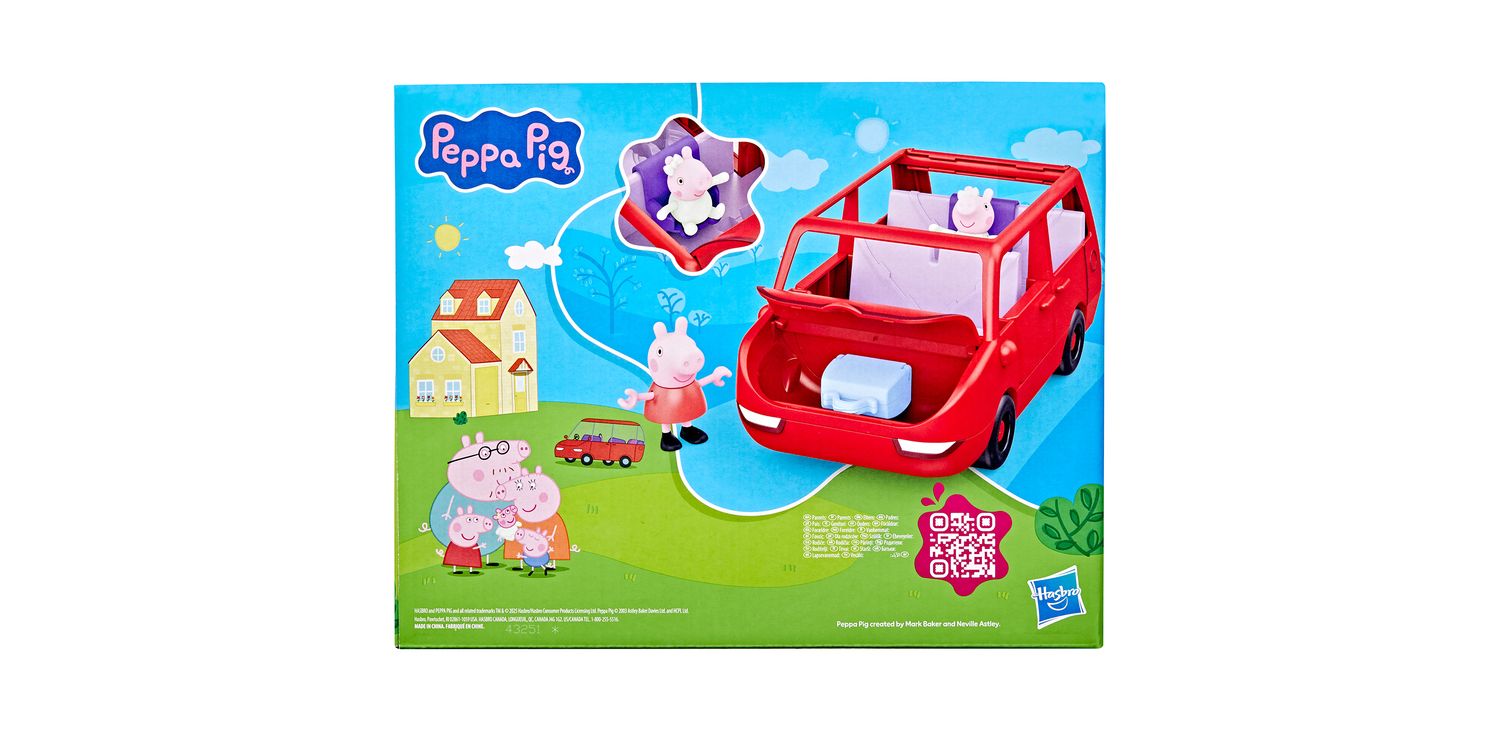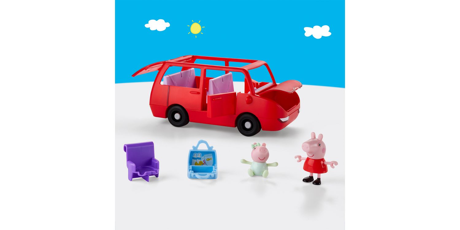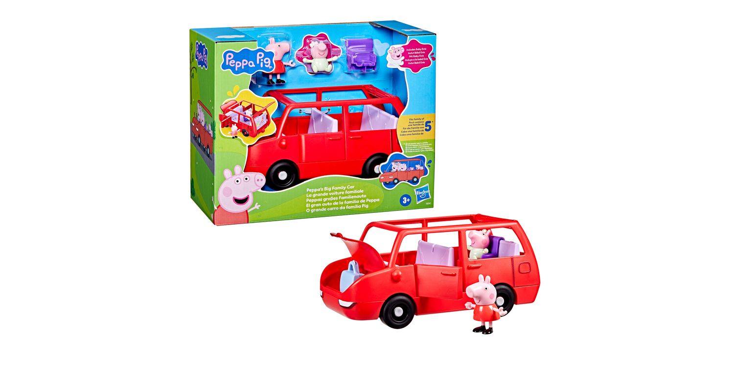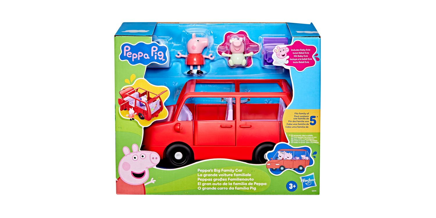 Roll into adventure with Peppa's Big Family Car! This Peppa Pig toy car comes with two 3-inch-scale (7.5 cm) figures, Peppa and her adorable baby sister Evie! Kids can open and close the boot (trunk), bonnet (hood), and doors, and the car's open top makes it easy to put figures in the seats. Ready for a road trip? Pop the suitcase in the boot and install the car seat for Baby Evie! The car can fit up to 5 figures (sold separately, subject to availability) so there's room for the whole Pig family! Toy sets like this make fun gifts for 3 year old girls and boys and up who love Peppa Pig playsets.