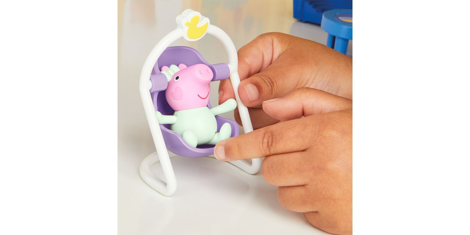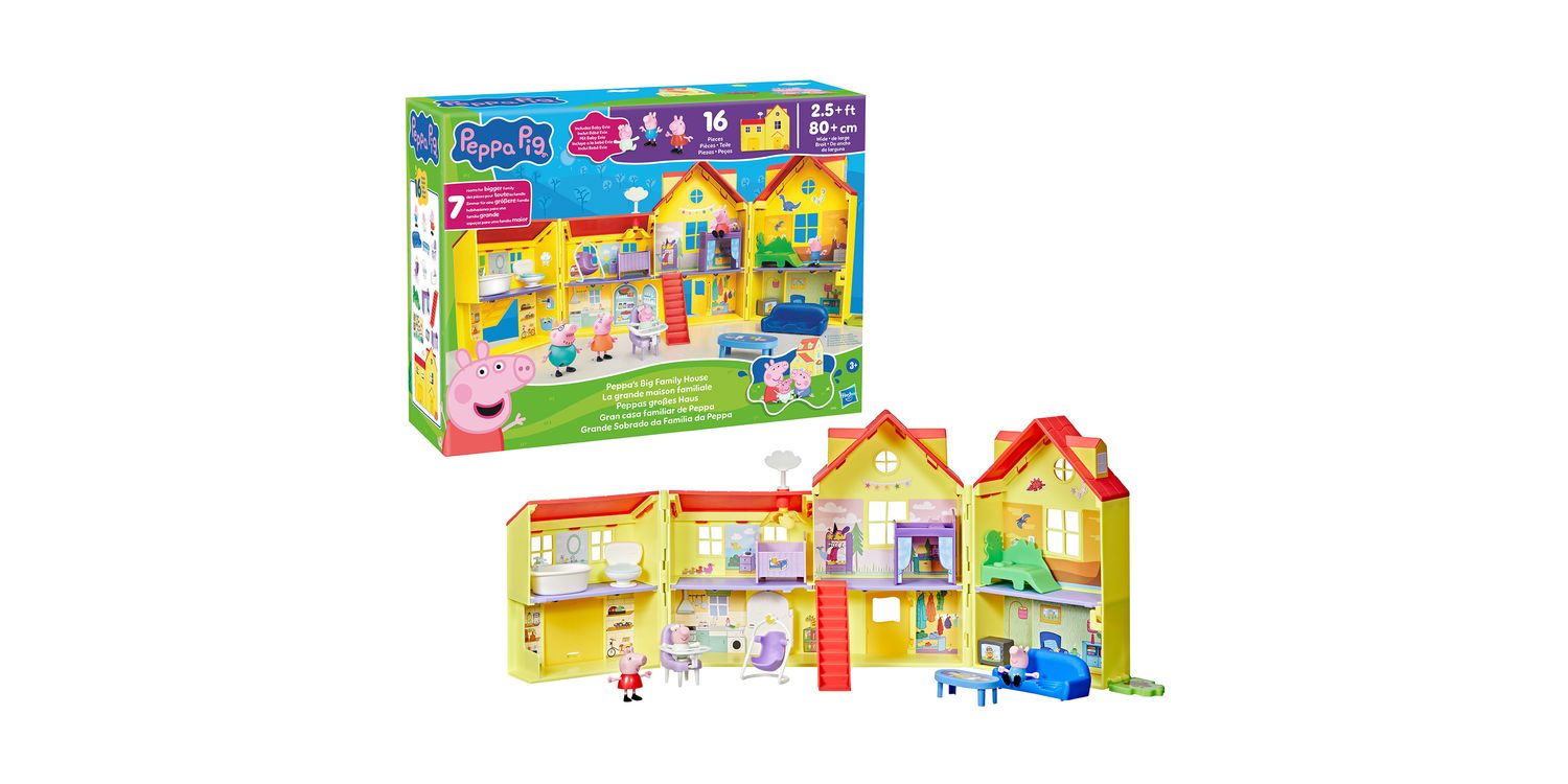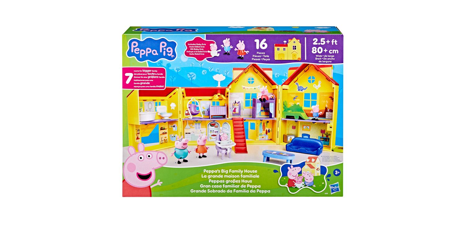 The arrival of Peppa's baby sister Evie means the Pig family is growing—and so is their house! With Peppa's Big Family House playset, kids can recreate favorite scenes from the show and imagine new adventures with Peppa, George, and Baby Evie. This large, 2-story, 7-room house playset opens up to be over 2.5 feet (80 cm) wide and is packed with accessories that kids can use to decorate and set up the house however they like, including a rainbow loft bed for Peppa, a dino bed for George, a bathtub, and a sofa! Baby Evie can play in her bouncer, sit in her high chair, or take a pretend nap in her cradle. This Peppa Pig toy set includes Baby Evie, George, and Peppa figures; look for additional figure sets inspired by favorite Peppa Pig characters (sold separately, subject to availability) to add to the family fun! Preschool toys like Peppa's Big Family House make great gifts for 3 year old girls and boys and up.