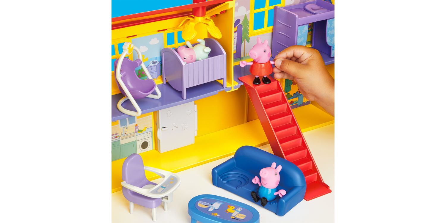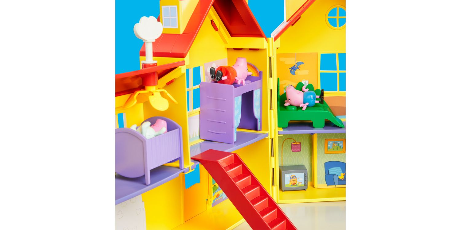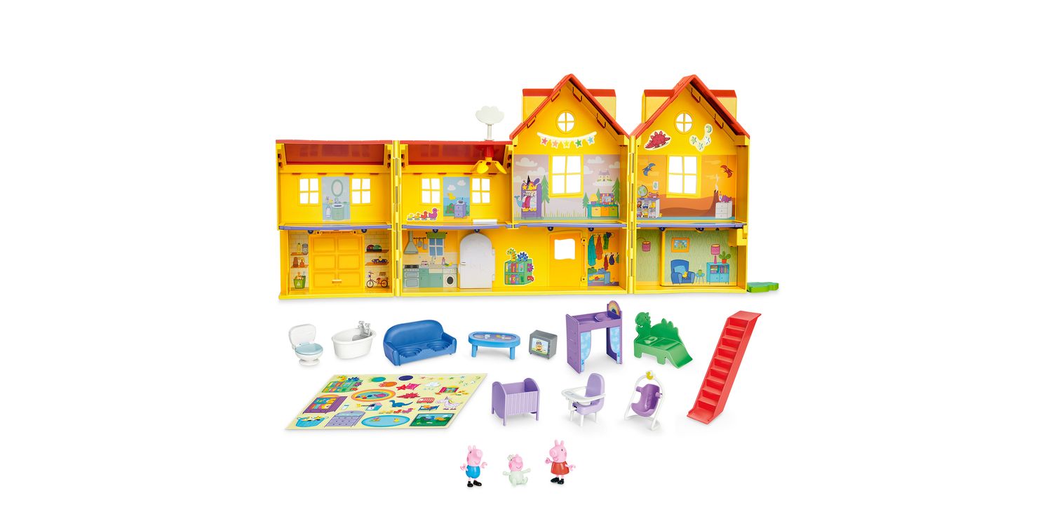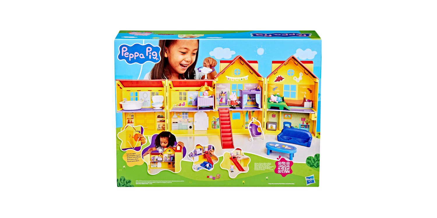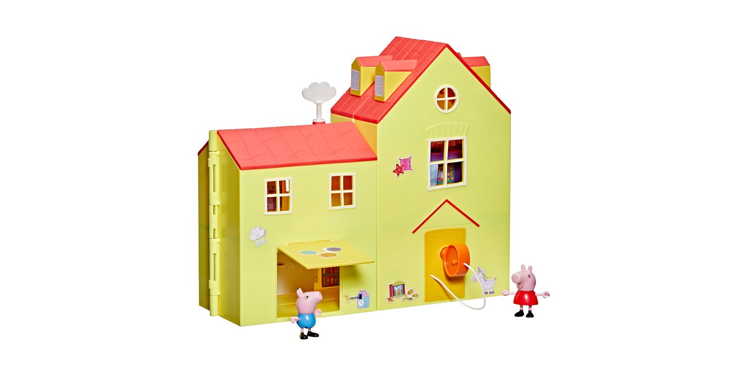 BIG PEPPA PIG HOUSE PLAYSET WITH 16 PIECES: Turn the key to open up this huge, 2.5-foot (80 cm)-wide Peppa Pig playhouse with 3 figures, 11 accessories, and a sticker sheet