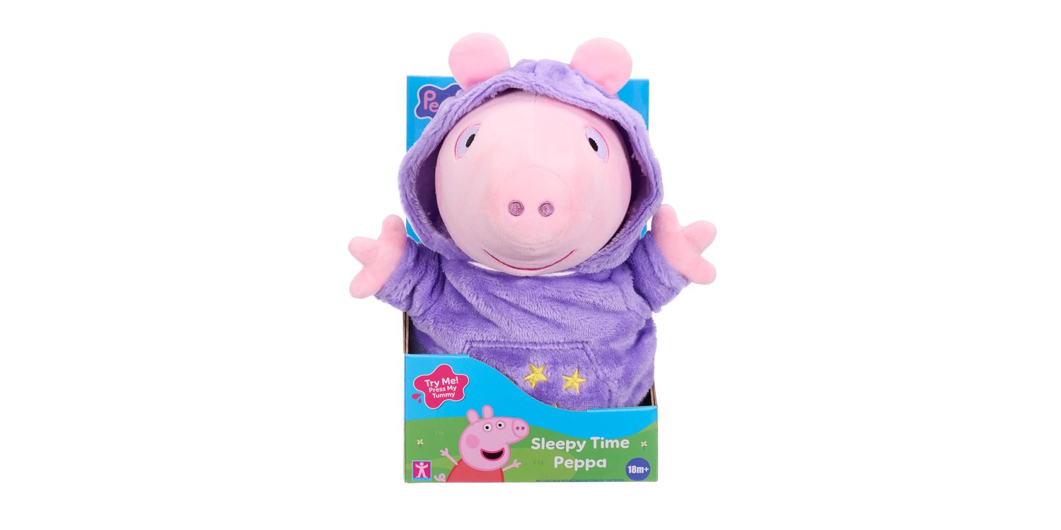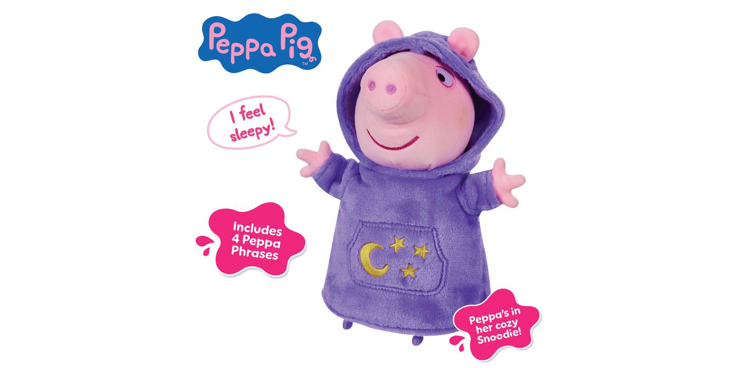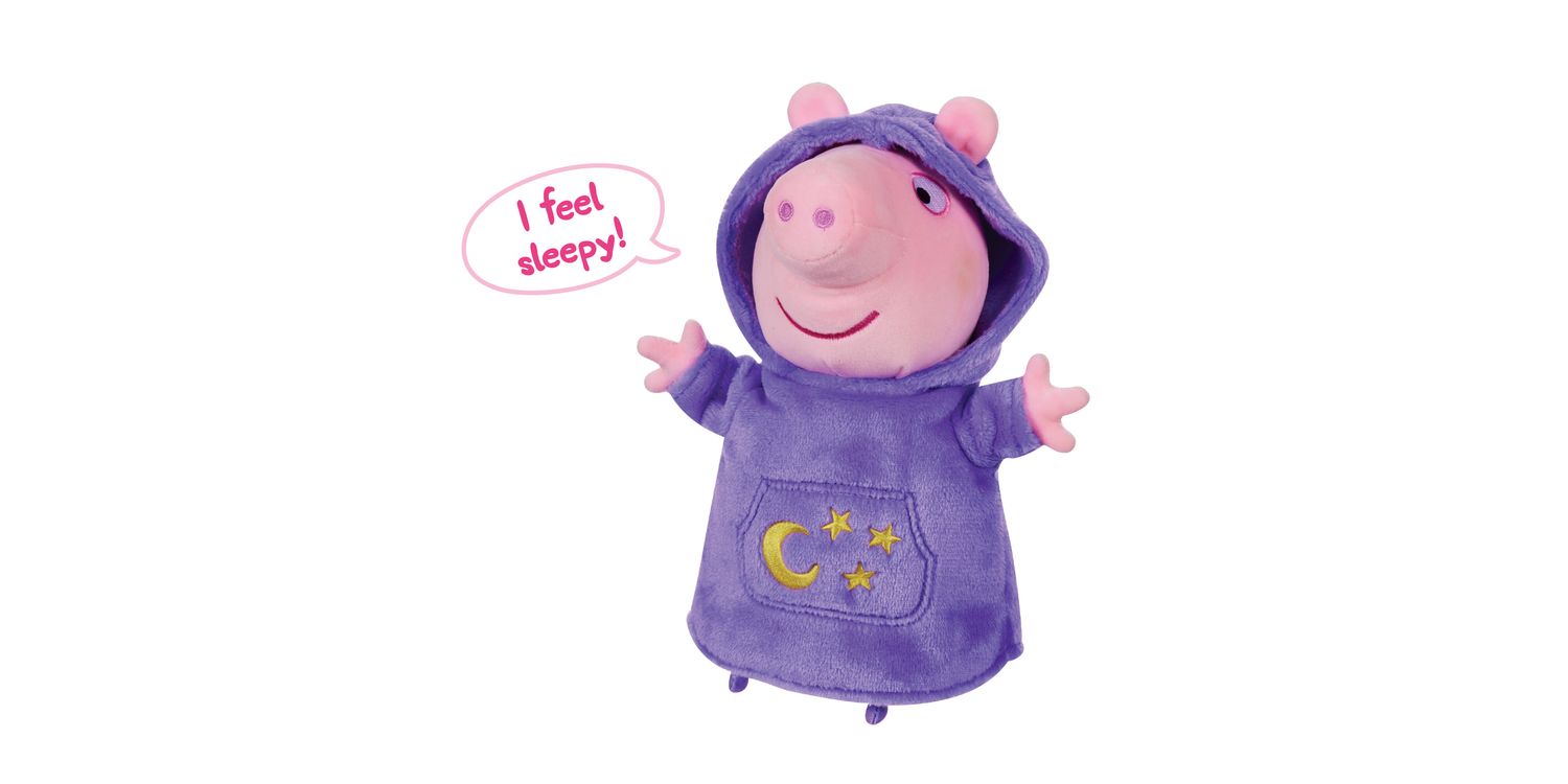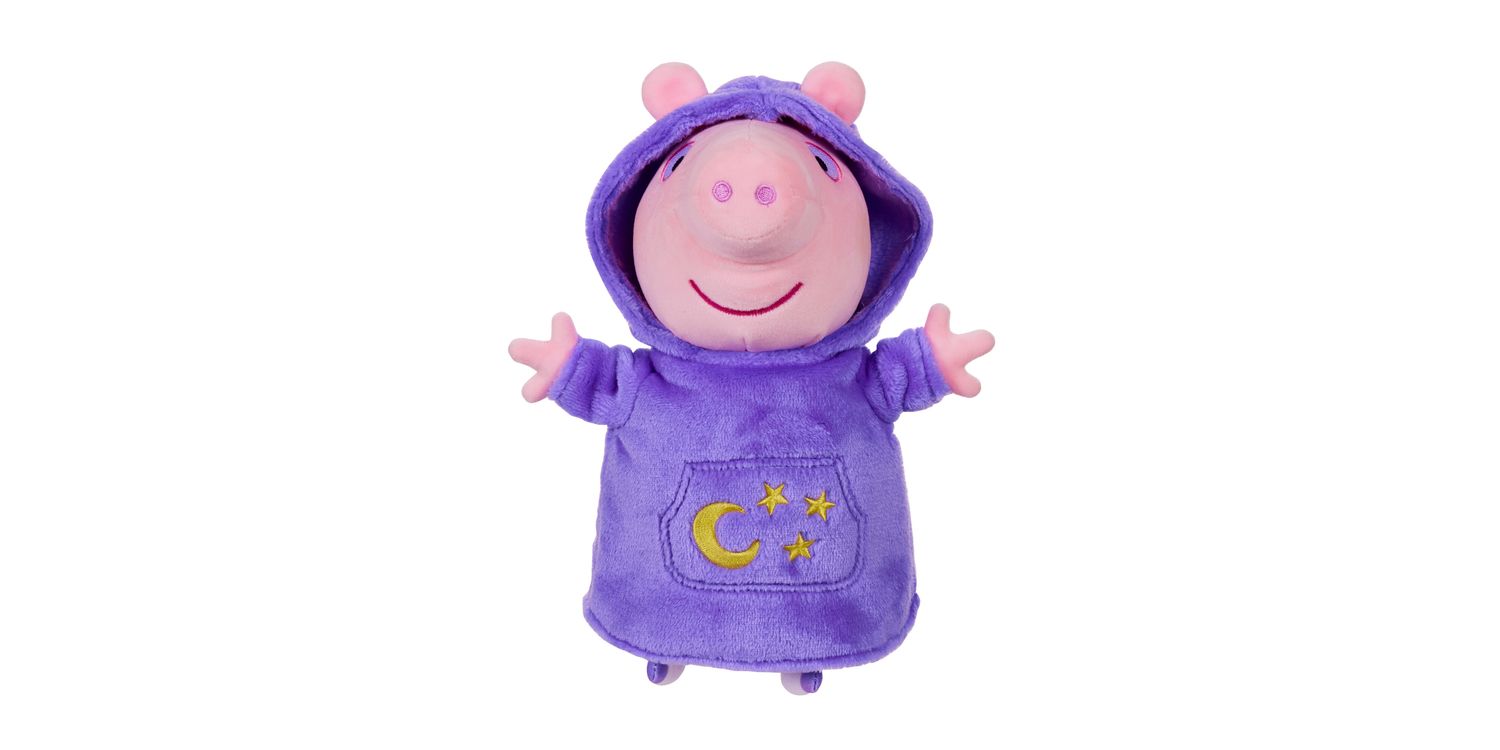 Sleepy Time Peppa is the perfect bedtime companion. Peppa is ready for bed in her cozy purple hooded blanket. This Peppa Pig soft toy is super soft and cuddly, perfect to snuggle up in bed with. Press Peppa's tummy to hear her talk. Featuring classic Peppa Pig styling, Sleepy Time Peppa is the perfect soft toy for any young Peppa Pig fan.