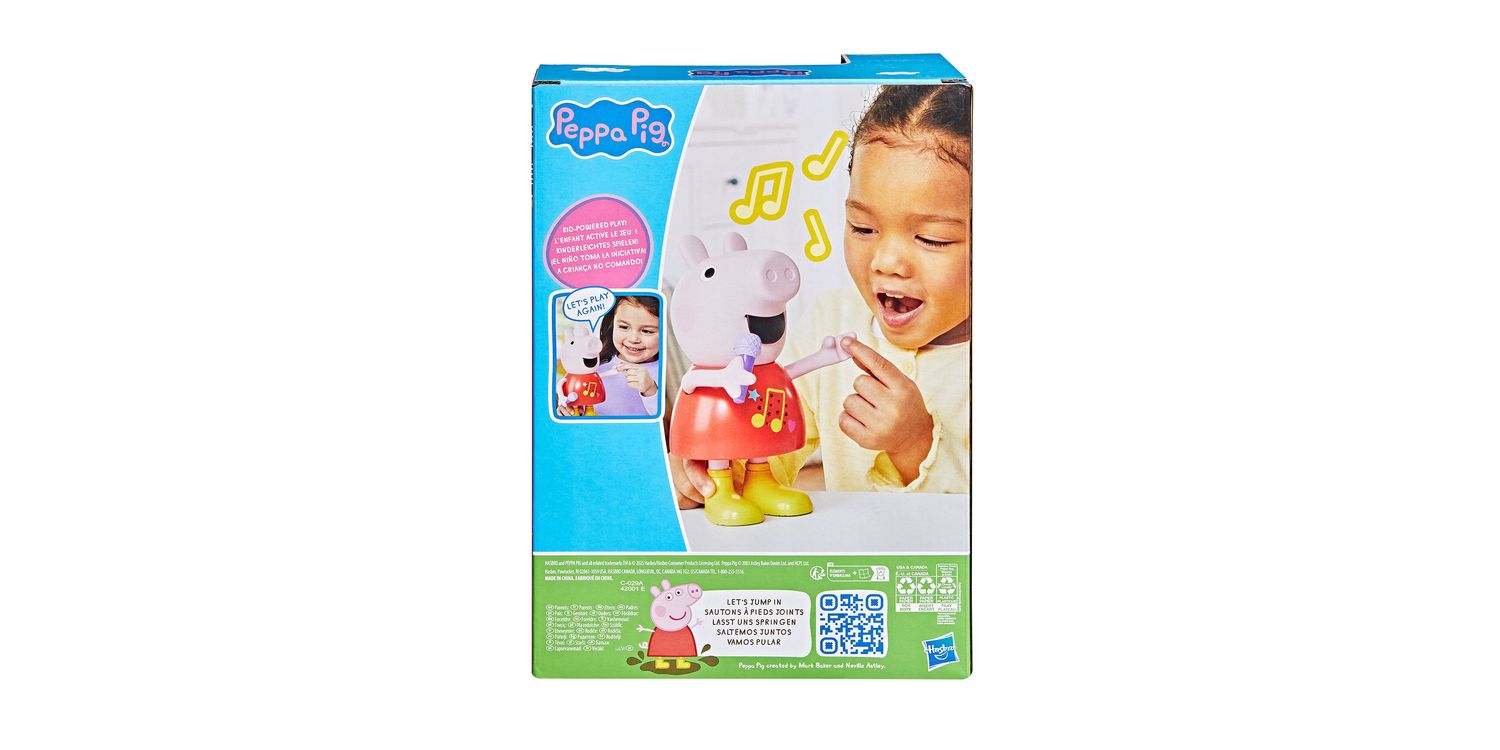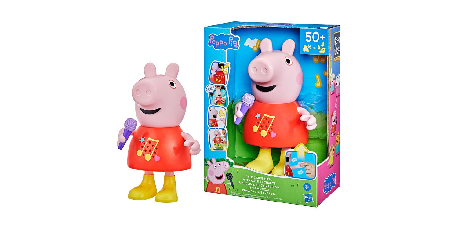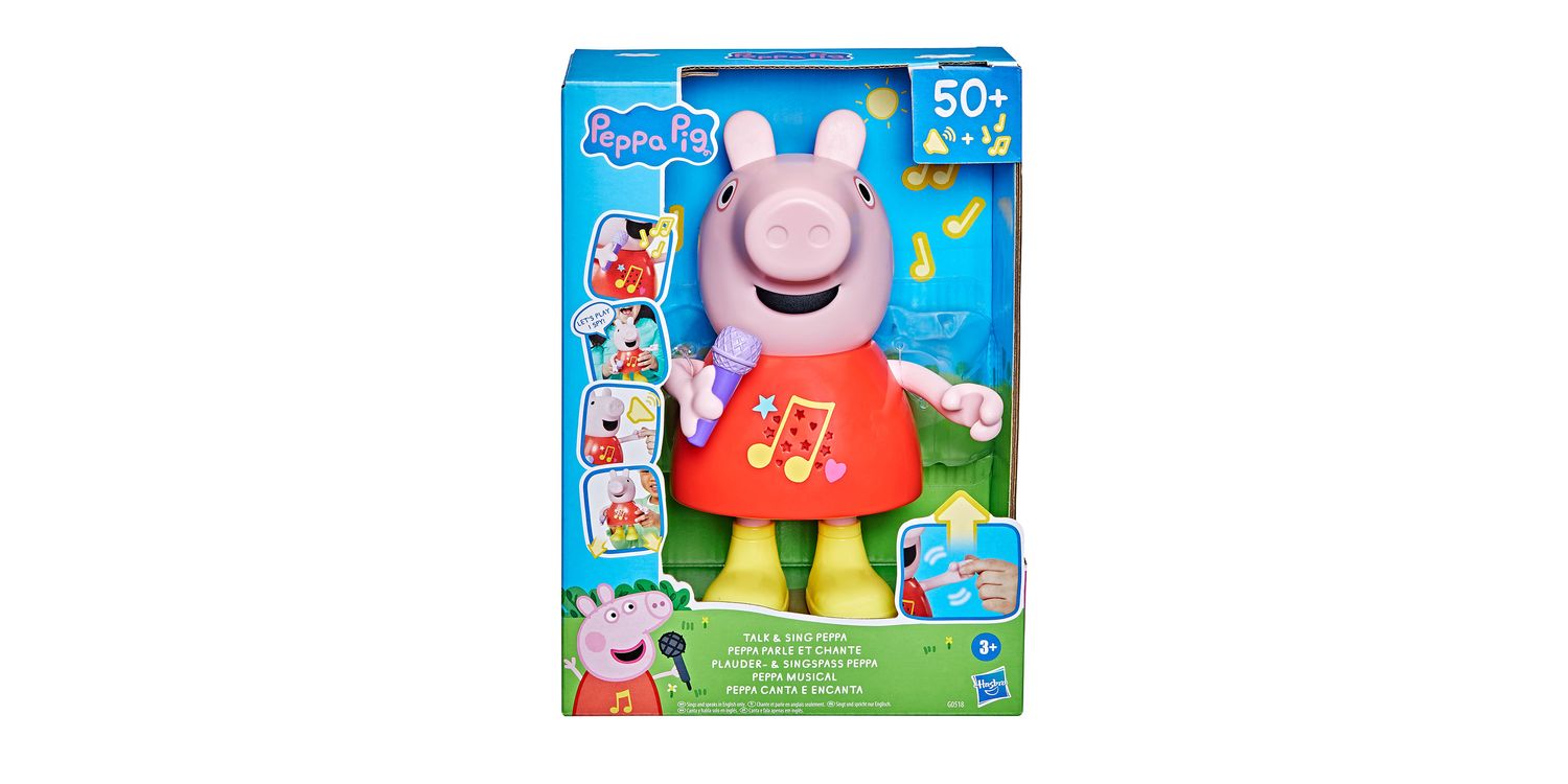 With over 50 phrases, songs, and sound effects, Talk & Sing Peppa will make playtime so much fun! This super cute toy for girls and boys talks, plays “I Spy,” and sings 4 songs; switching modes is as easy as moving her microphone up or down. Kids can move her arm to make her mouth move and hear her talk or sing! Little piggies can also make Peppa pretend to jump in muddy puddles to hear splashing sound effects! And when kids are little and still learning, toys like Talk & Sing Peppa can help them practice letters and colours as they play an “I Spy” game with their first best friend, Peppa. Musical toys like this one make wonderful gifts for 3 year old girls and boys and up who love Peppa Pig plush toys and playsets. Includes doll.