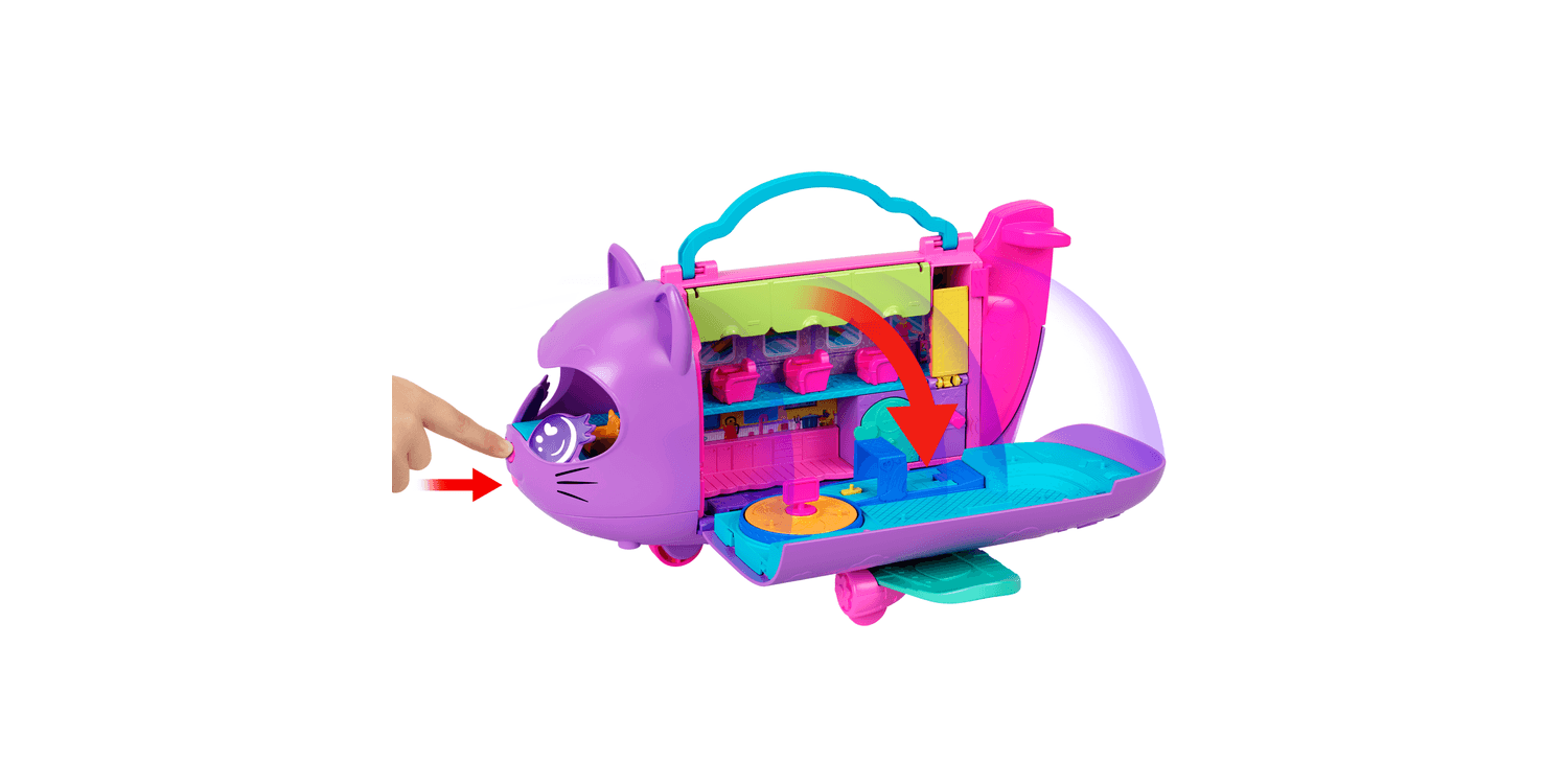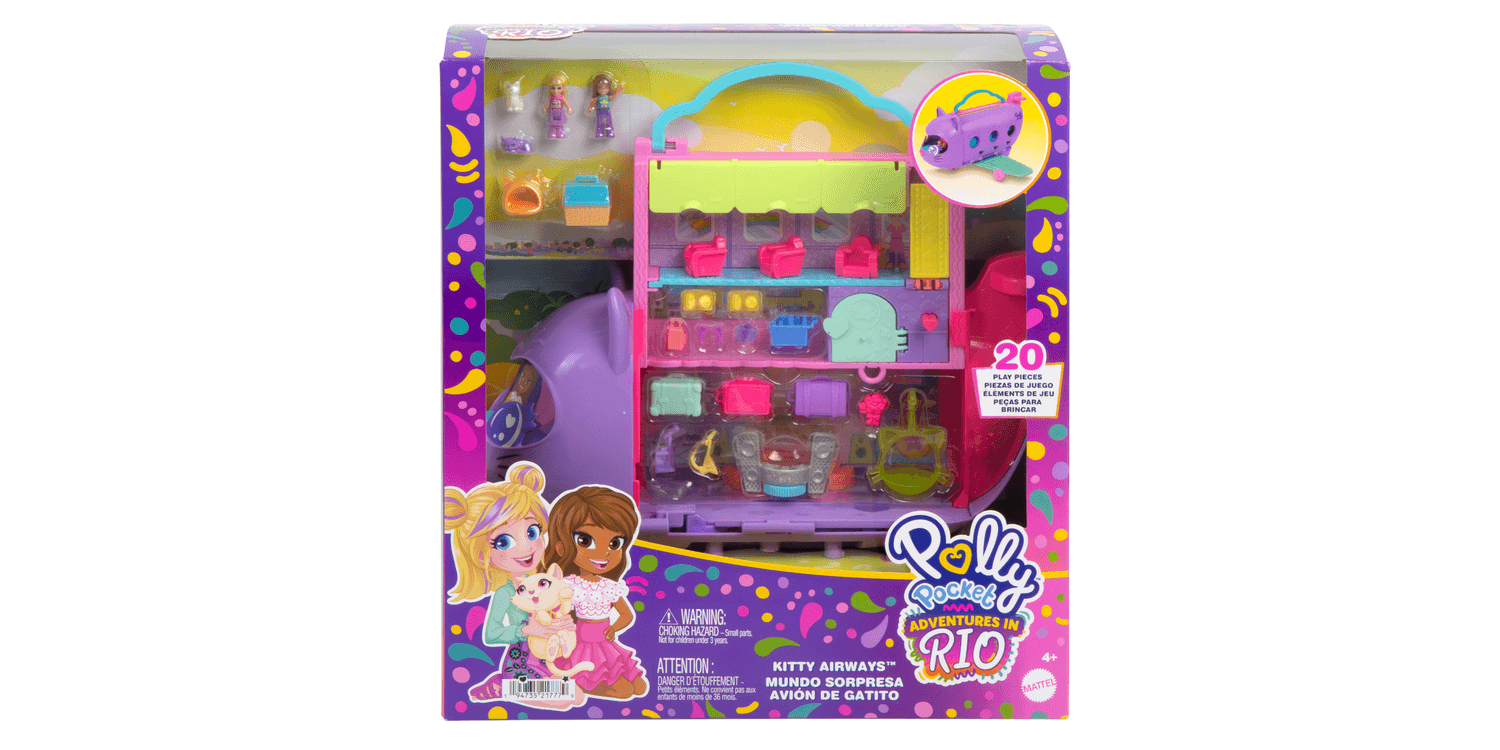 The Polly Pocket Kitty Airways Playset is ready for take-off! With two micro dolls and 19 accessories, imaginations are sure to soar sky high. The adorable kitty plane exterior opens to a multi-level aircraft! Play pilot, passenger, or both! Dolls can stow luggage in one of the overhead bins and take a seat by the window or use the restroom. Buckle up the fun is about to begin! Serve drinks and treats from the snack cart just like a real plane! It's a party in the main cabin - dolls and pet kitten can perform on the spinning stage before heading to baggage claim. When it's time to run, fold it up for on-the-go fun! Ideal for ages four years old and up. Colours and decorations may vary.
