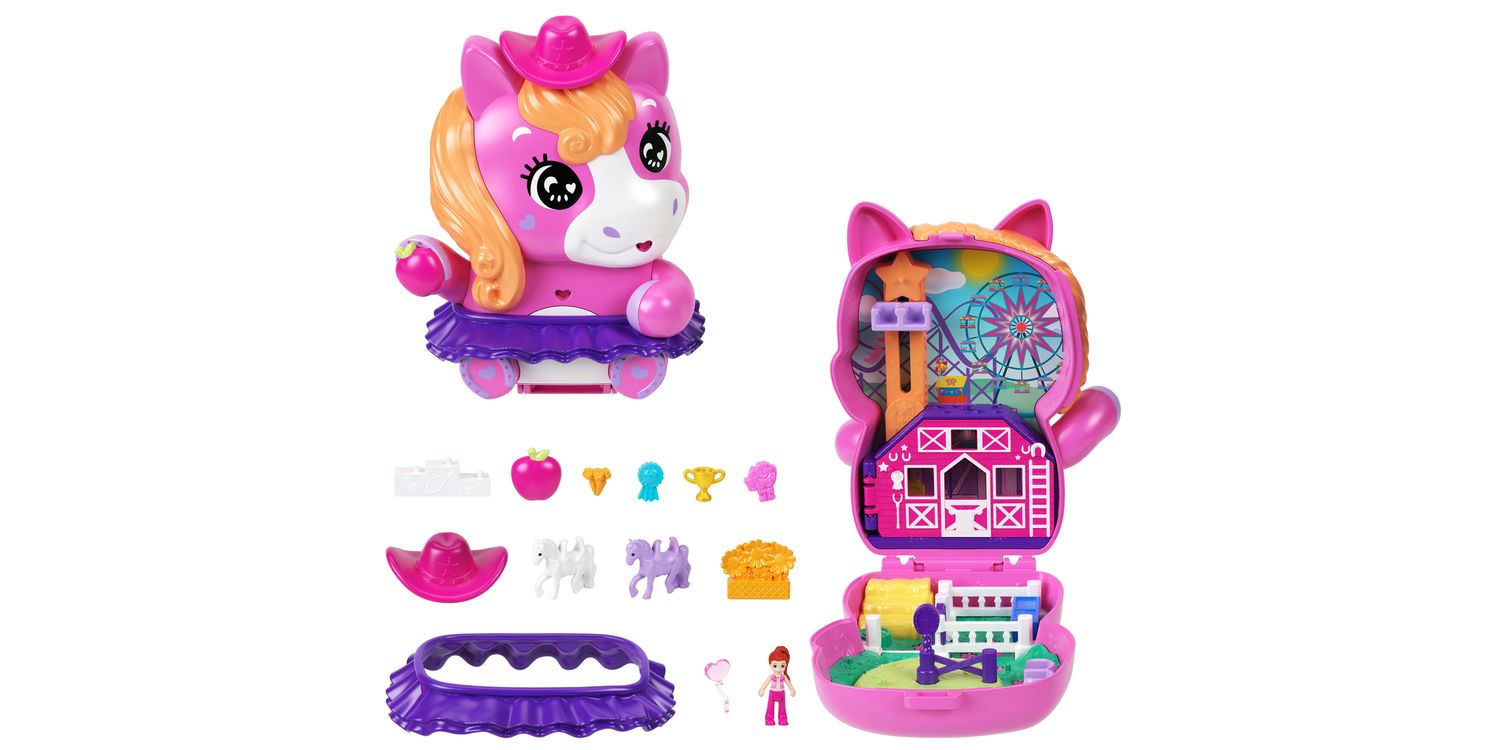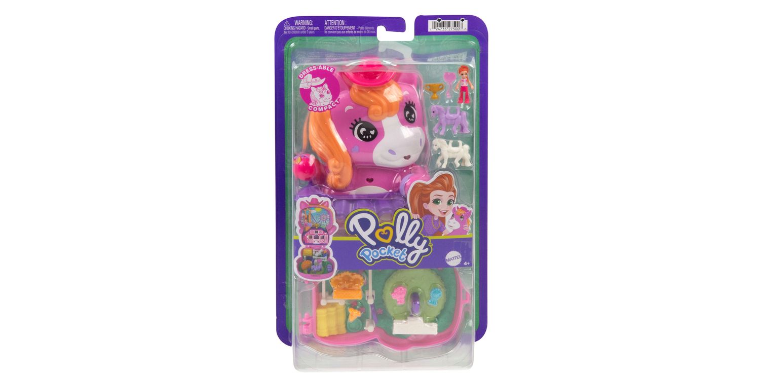 This adorable Polly Pocket Pony Rodeo Compact is shaped like a pony with a fun dress-able exterior perfect for kids who love to express their unique fashion sense! Open the playset to discover an awesome rodeo carnival interior with 1 micro doll and 10 themed accessories, including two pet horses. Lila loves to compete in the horse show, line dance behind the barn door, or slide up and down on the carnival ride. When it's time to run, pack it up for on-the-go fun! Ideal for ages four years old and up, especially those who love horses. Subject to availability. Colours and decorations may vary.