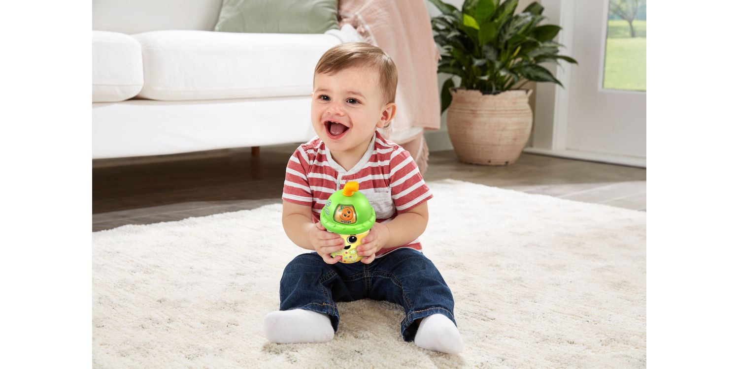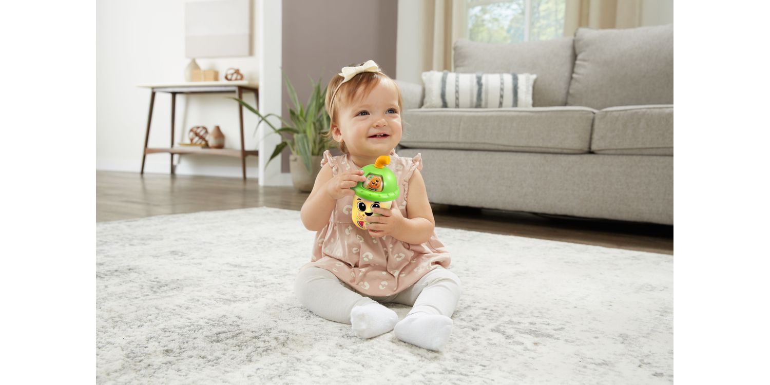 Take a smoothie break while your little one explores the Fruit Colours Learning Smoothie™! Learning is delicious with this cute, colourful cup. Swivel the straw to choose from five fruit flavours and the cup will change colour to match—this smoothie is bananas! Meet Crystal the Cup plus five funny fruits like Sherry Strawberry and Oliver Orange who introduce themselves and their colours. The straw is also a teething toy for kids to nibble as they listen to fruit-themed sing-along songs and music in reggae, pop, punk rock and country styles. Shake up the toy smoothie cup to hear the bubble beads bounce.