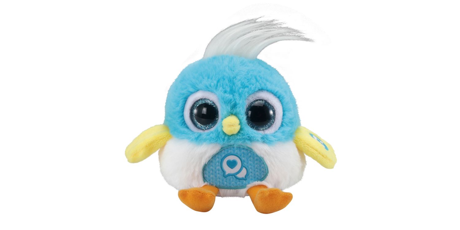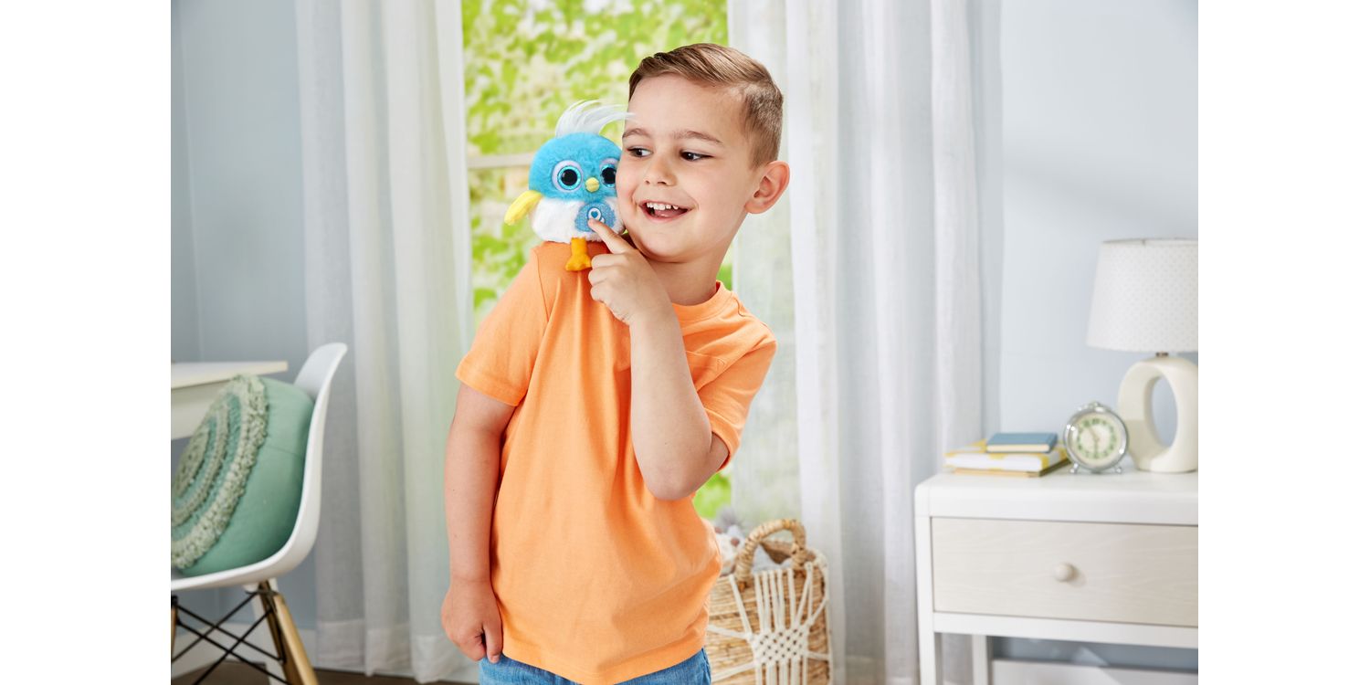I want to be your new best friend! I love to go on adventures! Sit me on your shoulder and carry me with you wherever you go! I like to chitchat! Talk to me and I will repeat what you say in a funny voice or sing back to you. Move me up, down & upside down, to hear me make fun sounds and sing. When you press my wing, I will play fun music and sounds.