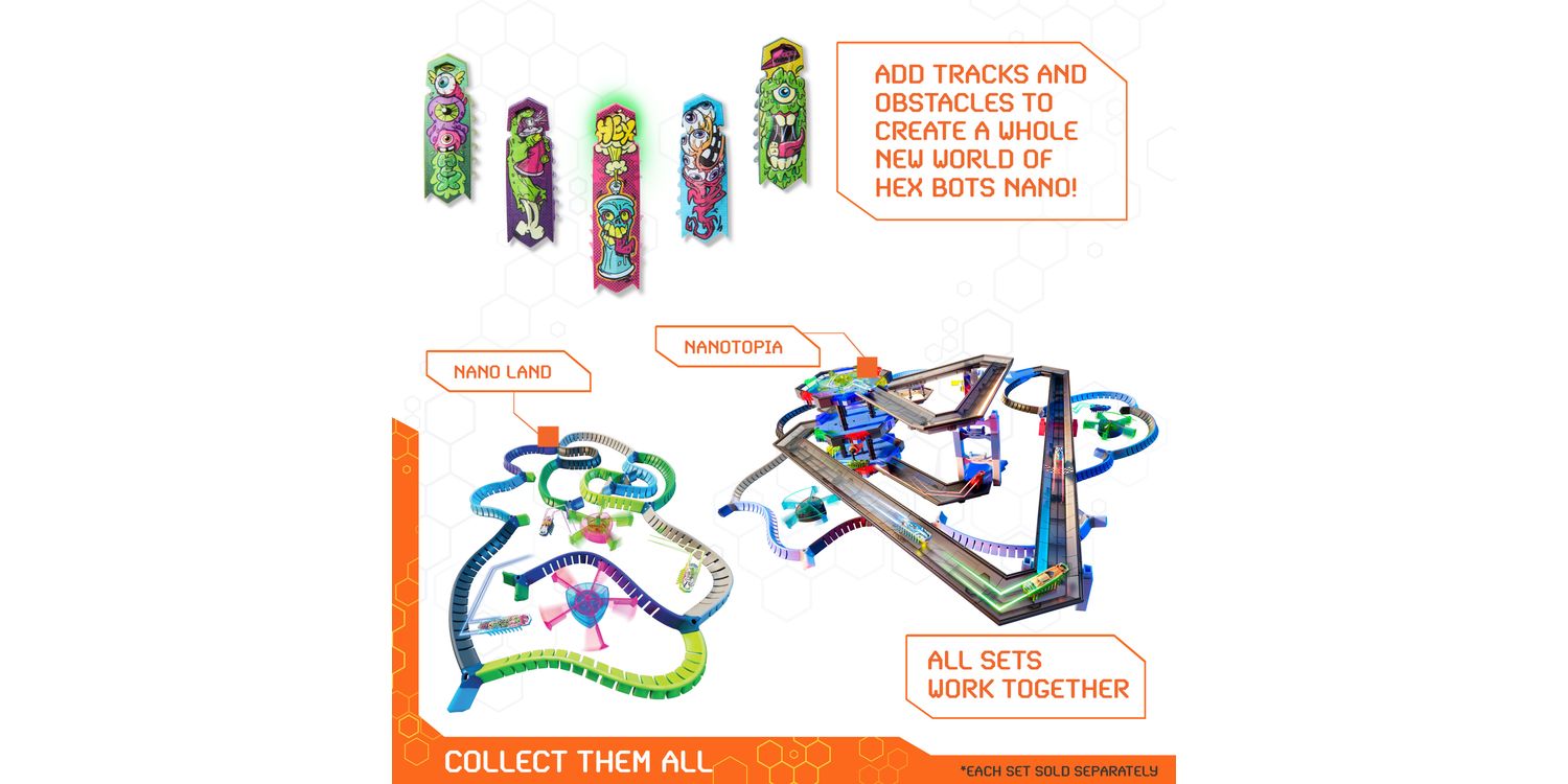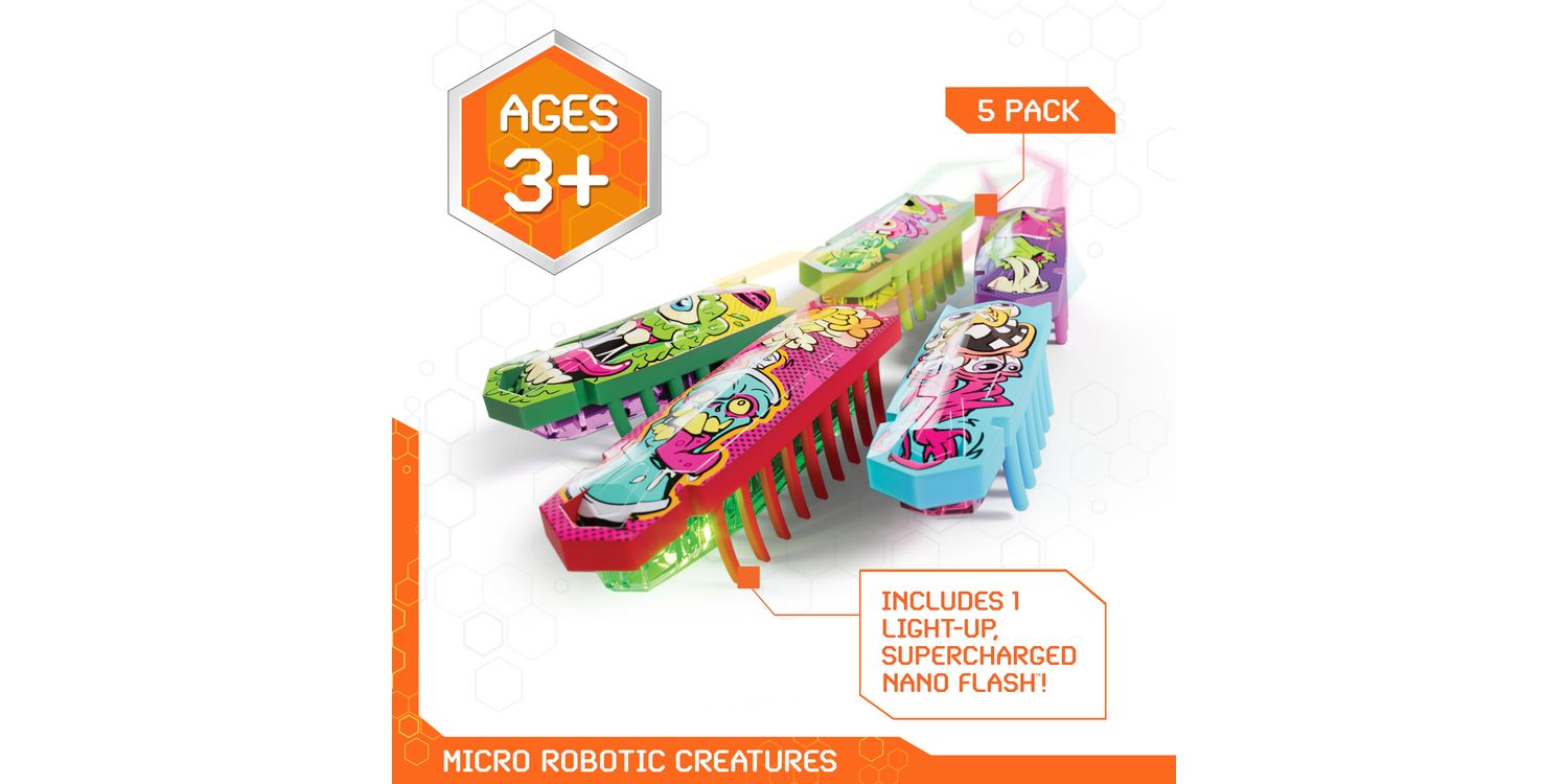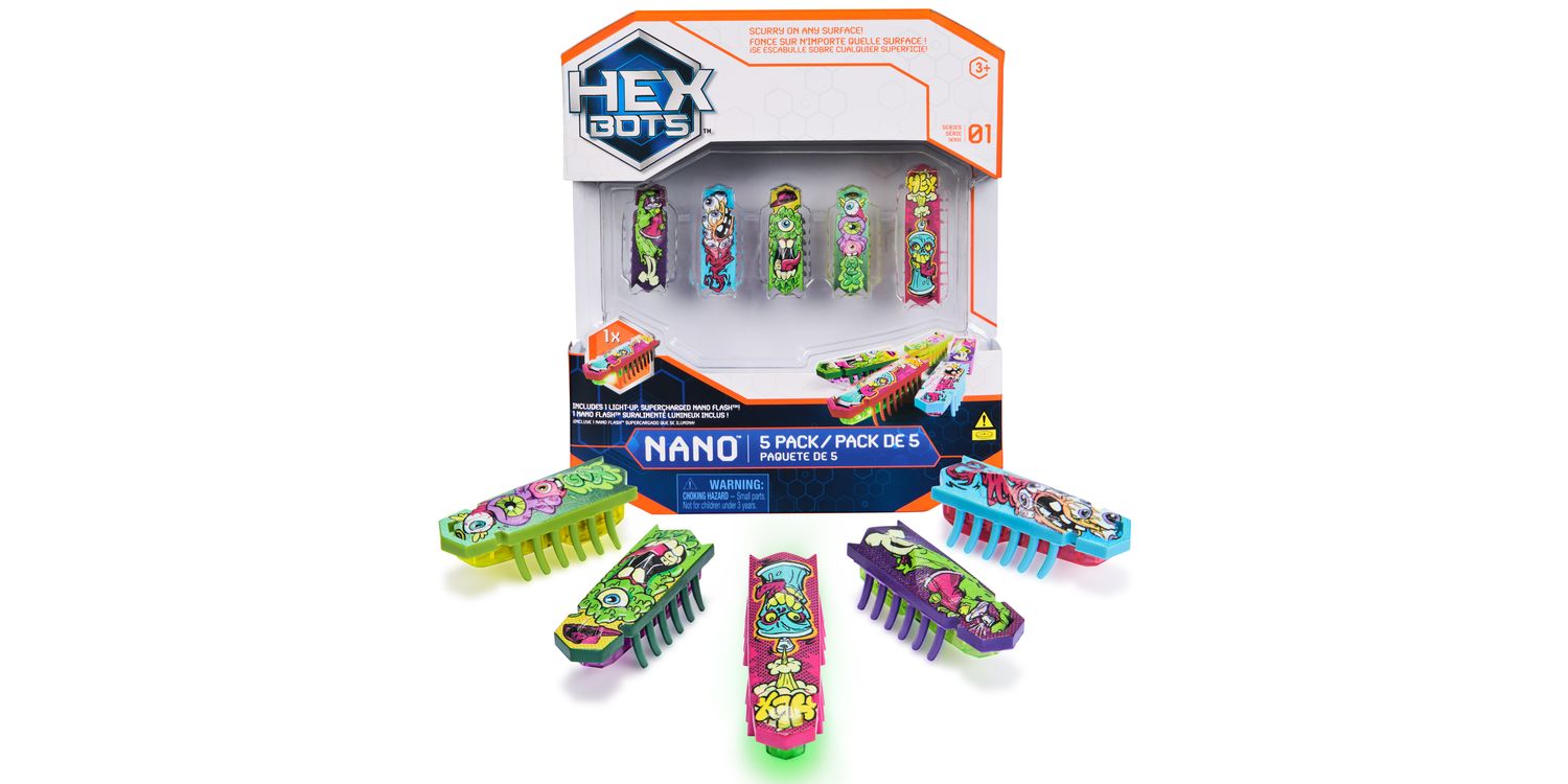 The Flash Nano features a supercharged redesign, is now 1.5 times longer, moves twice as fast and lights up. Create your own playground with HEX BOTS building toys, kids can collect, connect and build their own playgrounds with the Nano 5-Pack.
