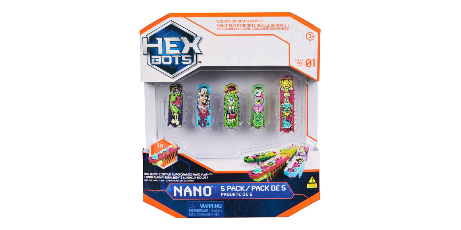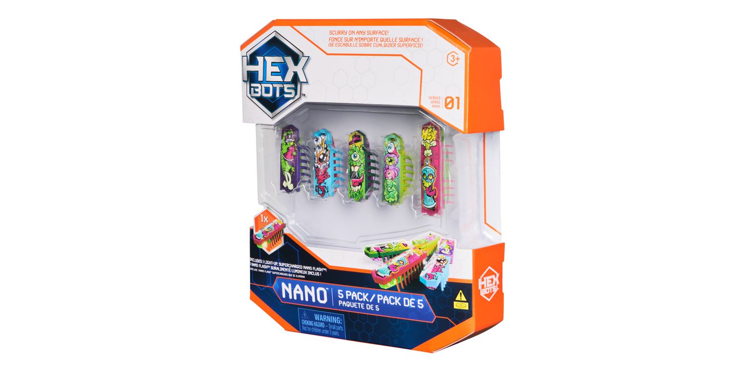 Expand your nano universe with the HEX BOTS Nano 5-Pack, with 4 Nano robots and 1 Flash Nano. Just like a real bug, these Nanos scurry across any surface, flip themselves over and bounce off jelly walls.