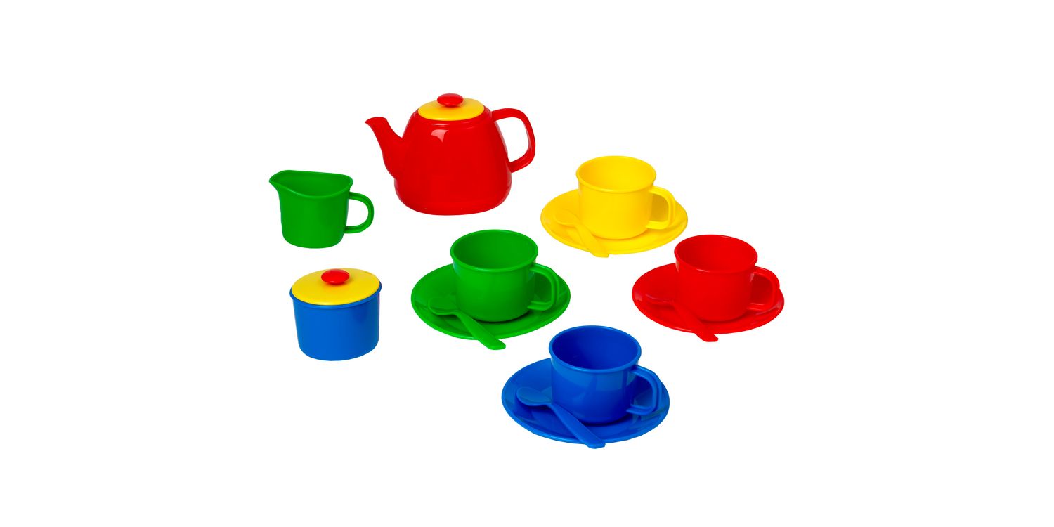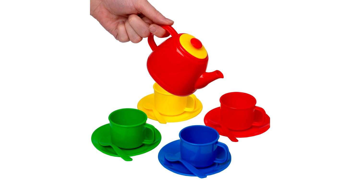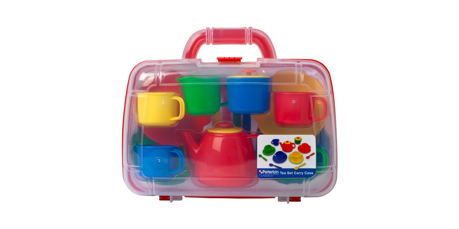 This portable tea set from Peterkin is the perfect tea set for picnics and tea parties on the move. The carry case includes a 4-place tea set which is great for role play and developing social skills. Each item is made from hard wearing plastic in pretty primary colours and the cute teapot and sugar bowl both have snug fitted lids. Learn colours by matching cups and spoons to plates or mix and match! The case is hinged with an easy-open clasp and once the item inserts are removed there’s plenty of space for any picnic delicacies. One lump or two?
