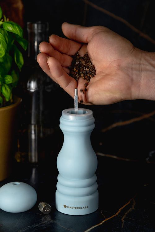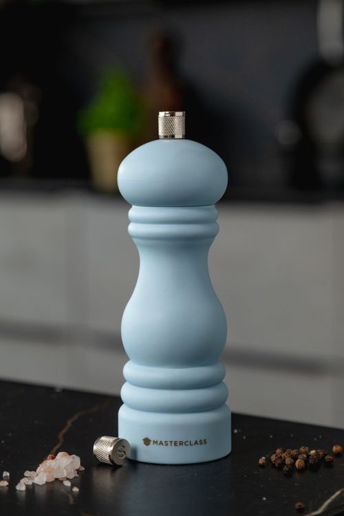 The MasterClass Salt or Pepper Mill boasts a calming sky blue finish and classic capstan shape. At 17cm (6.5 inches), it features interchangeable 'S' and 'P' caps, letting you effortlessly switch between salt and pepper grinding. The refilliable mill has a ceramic grinding mechanism which delivers smooth, consistent grinds and is resistant to wear and corrosion. With a 5-year guarantee, it adds both style and practicality to your kitchen.