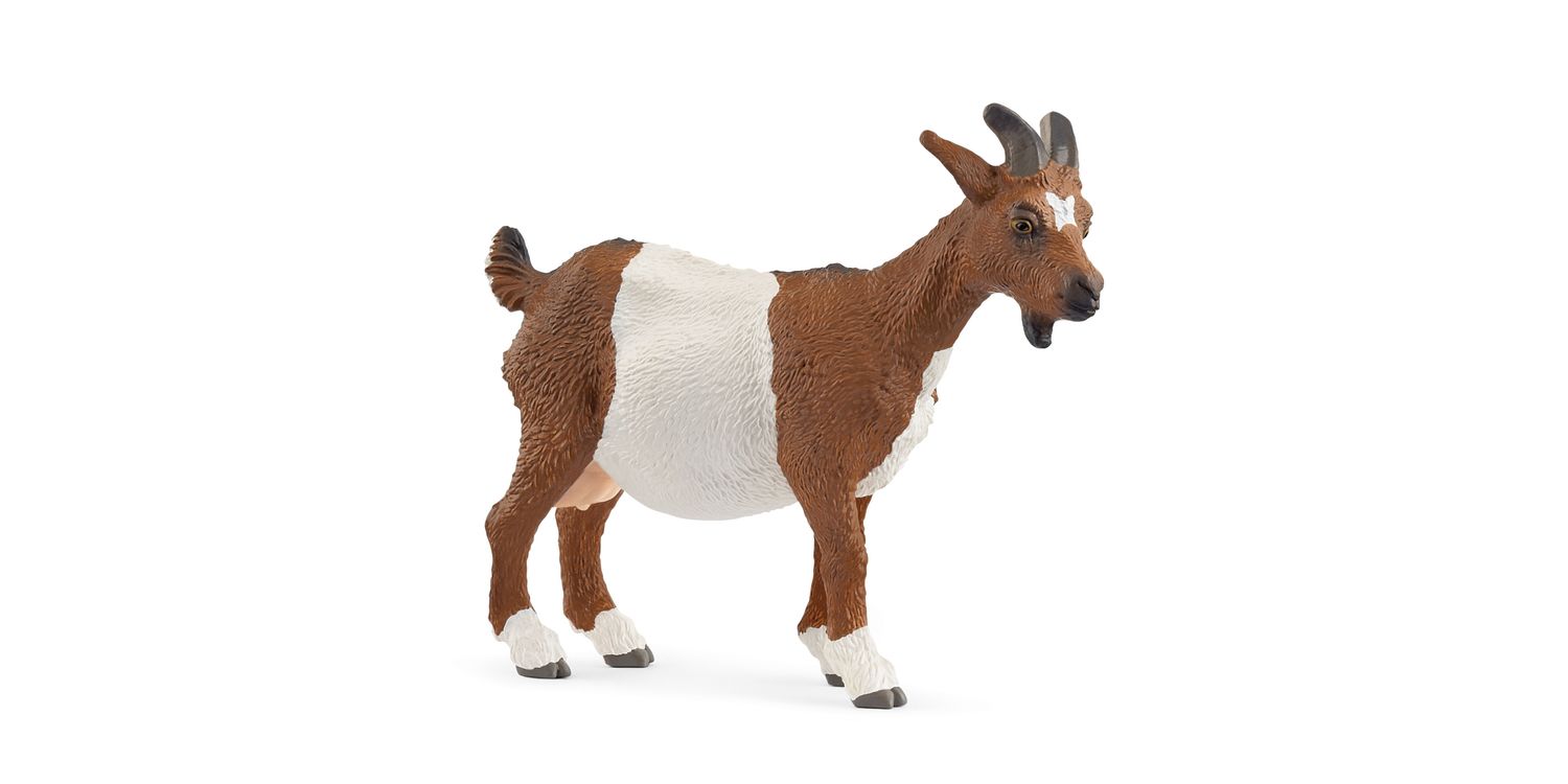 The goat looks really pretty with its white and brown coat. It has a white, star-shaped spot on its dark forehead and a distinctive goatee on ist chin. One look into its yellow eyes reveals: This goat is a real character!