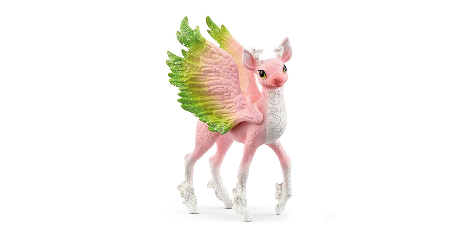 The magical fawn gazes dreamily into the distance with its big, shining eyes. I wonder what's going through its head right now? It stretches its cute pink snout into the air and spreads its beautiful wings. It was supposed to practice flying, but right now it just wants to play. It’s already pawing the forest floor impatiently with its dainty hooves. Who will come and play?