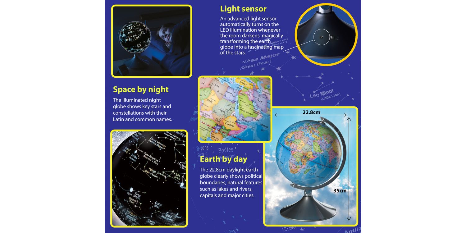 The Earth and Constellation Globe has a day-time and night-time view and is in fact two globes in one. In the daylight the 22.8cm diameter globe shows political boundaries, oceans, equator, longitude and latitude lines, country names, capital cities and other major cities for each country in the world. By night the illuminated star map shows constellations with their common names. The globe is at a scale of 1:55,900,00 and it sits on a sturdy stylish silver stand with matching graduated meridian. The Earth and Constellation Globe has an automatic light sensor so when the globe is turned on and the surrounding area is dark the globe will transform into a beautiful glowing globe showing the star constellations. There is also a handy override switch which allows you to turn off the night-time view and thus conserve battery power. You can also power the globe with a micro USB cable (not included) connected to a USB port on a computer. The Earth and Constellation Globe is a great learning tool for geographers and astronomers but also a great feature for any bedroom, living room or study. A truly unique globe.