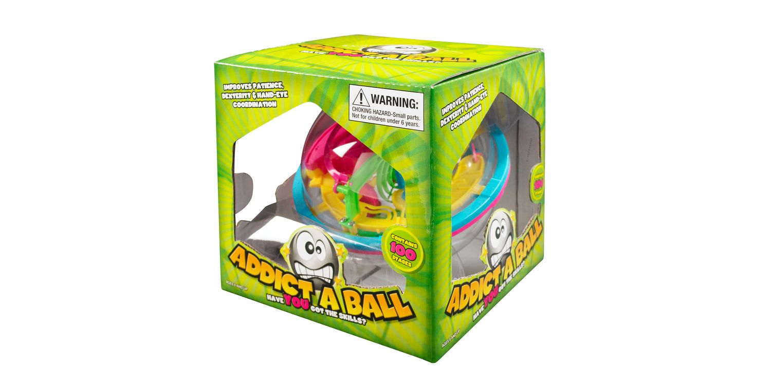 Addict-A-Ball is an astonishing 3D maze which twists and turns through the middle of a ball. The aim is simply to get the ball from the start of the maze to the finish without it falling off the maze! The start of the maze is simple enough, but it lulls you into a false sense of security as the ball suddenly starts tumbling down stairs and slides and you even need to negotiate a bizarre swing! True to it’s name, once you’ve started, you won’t want to put it down until you have succeeded. Get all the family involved from age 6 – 100, it’s fabulous fun for all!