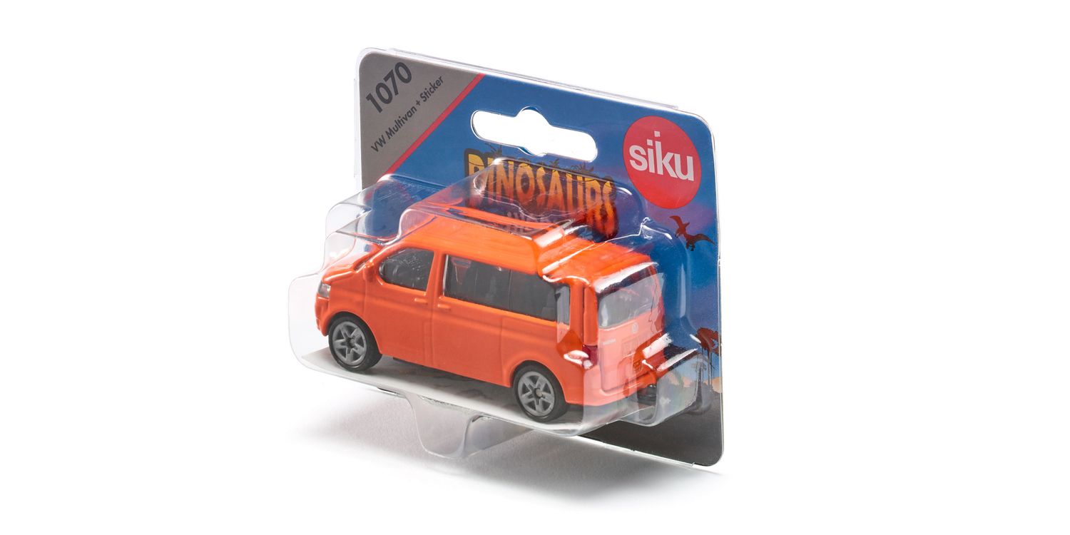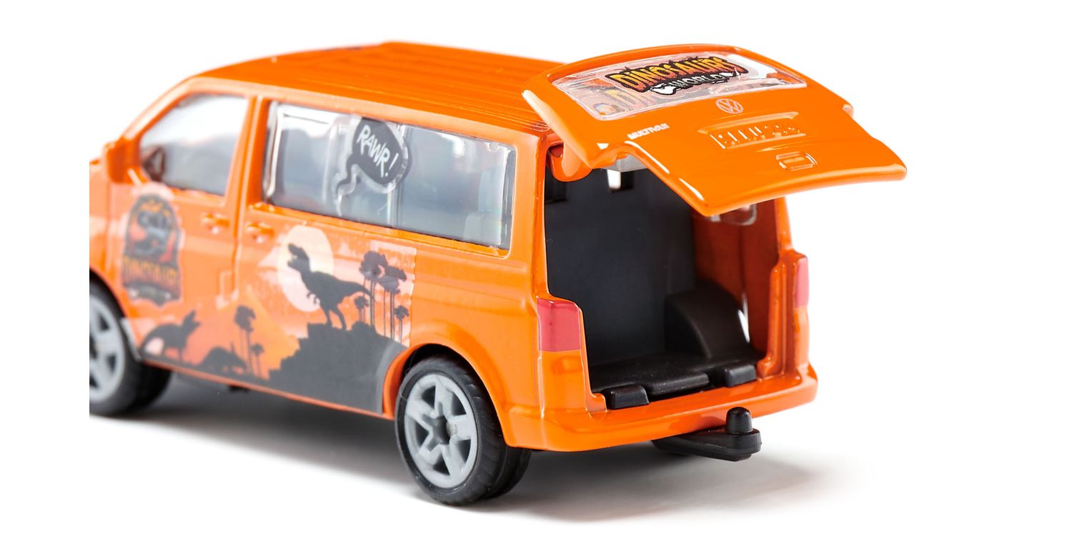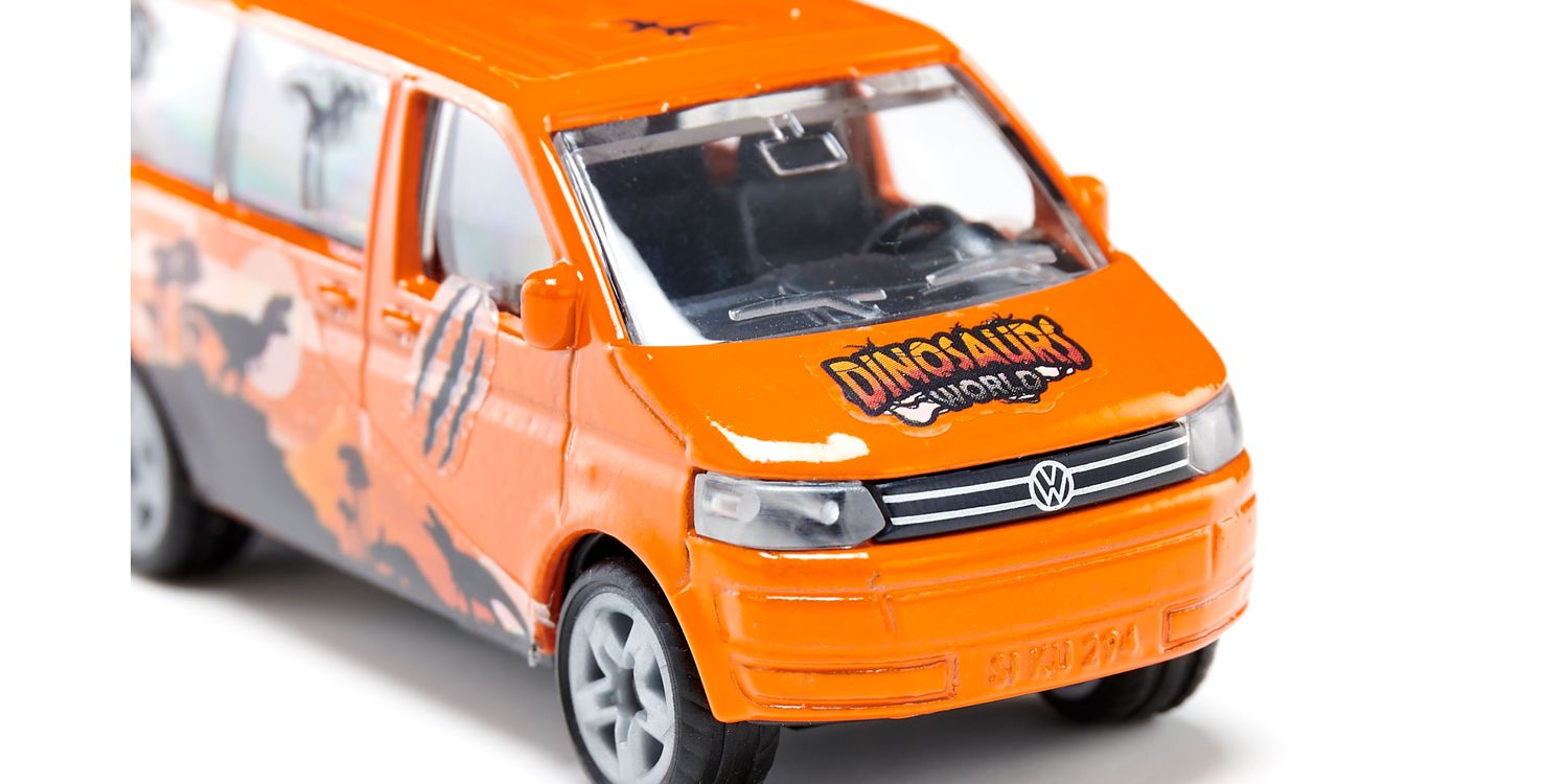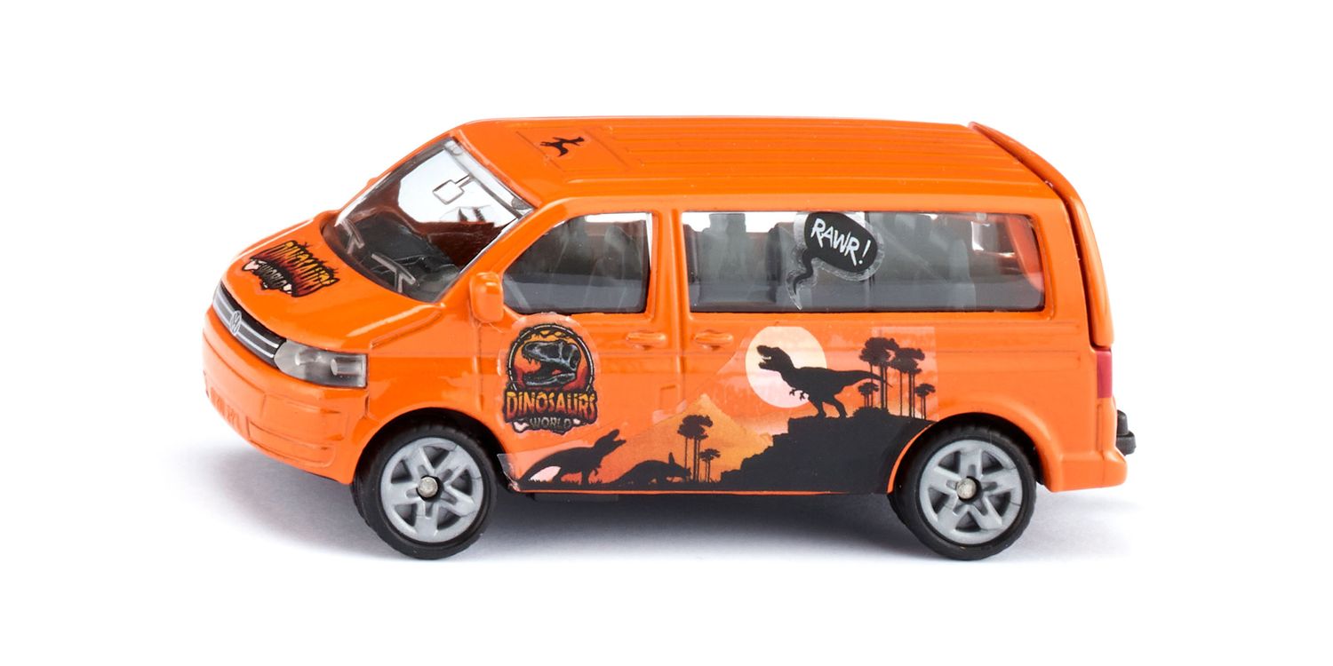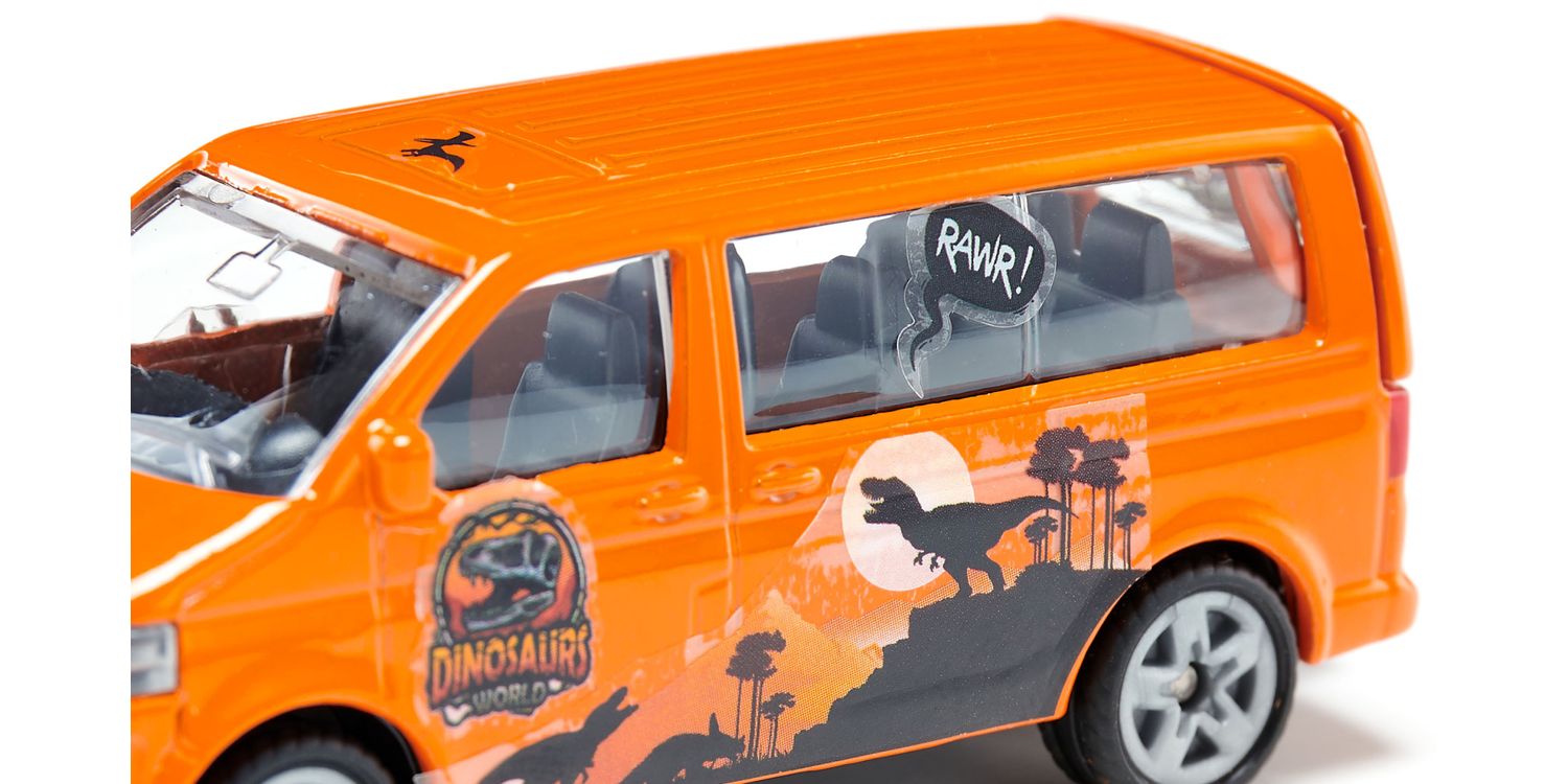 Discover the impressive Siku model of the orange-coloured VW T5 Multivan - a real eye-catcher for children and lovers of detailed vehicles. This toy model impresses with its precise reproduction, including true-to-original wheel rims with rubberised treads, realistic front headlight strip and a large tailgate. The attention to detail makes this Siku model a must-have for all those who appreciate the fascination of miniature vehicles. The true-to-original elements, from the wheel rims to the headlights, give the model an authentic look and make it a unique toy. For even more fun, the vehicle comes with a sticker sheet with cool dinosaur motifs. Order the siku model of the VW T5 Multivan now and immerse yourself in the prehistoric world of dinosaurs - rawr!
