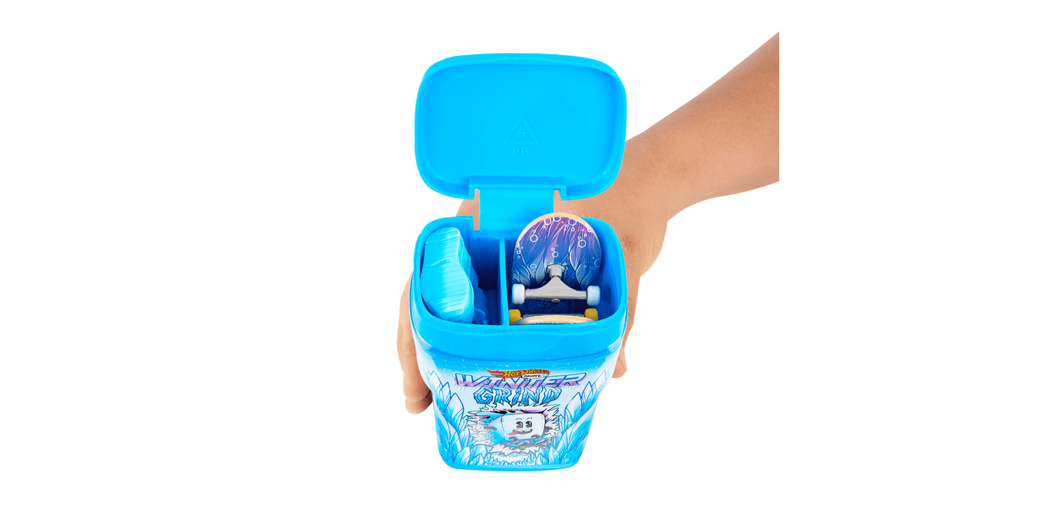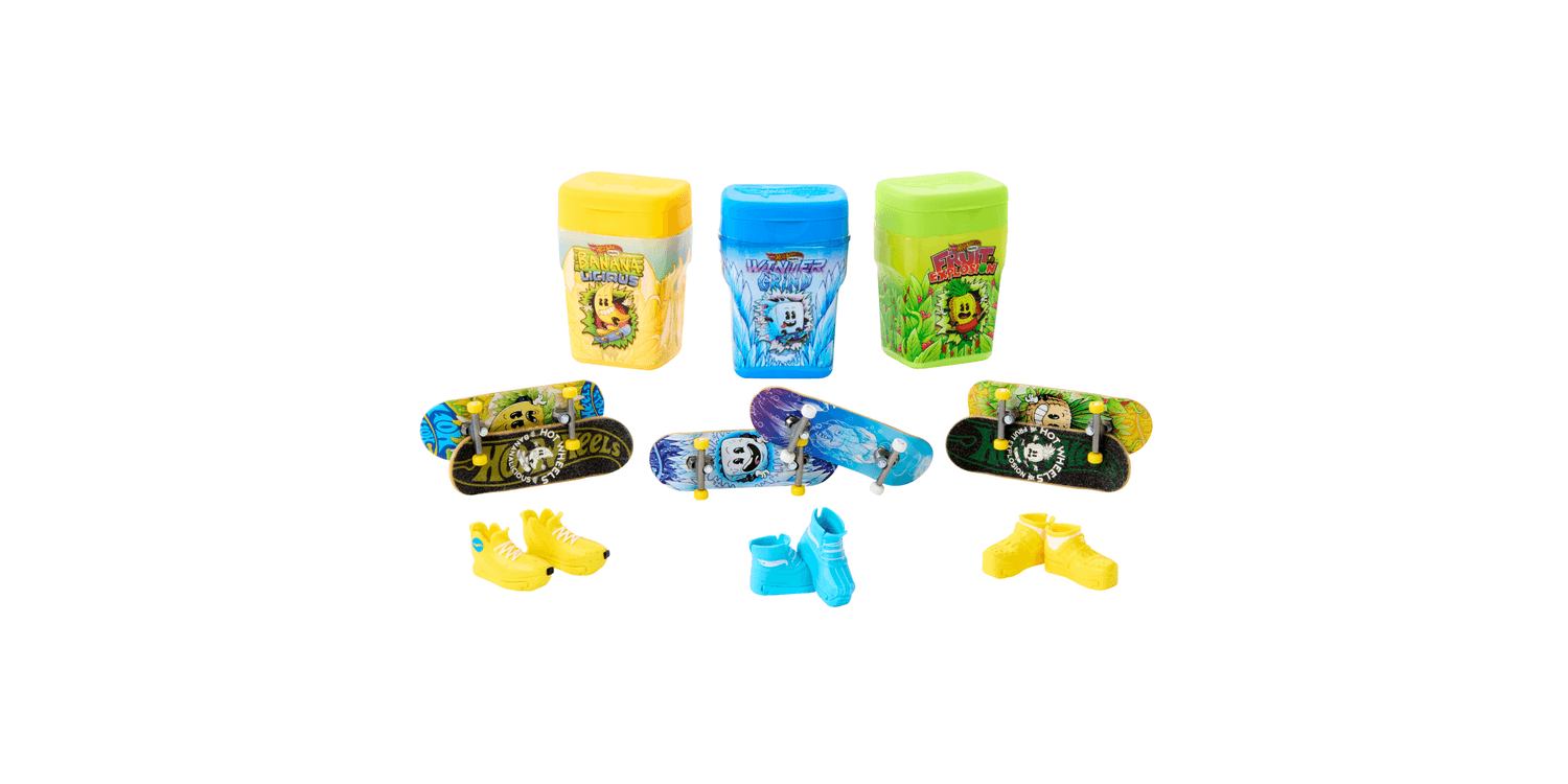 Take boards on the go with the Hot Wheels Skate Flavour Container that holds and hides 2 fully assembled fingerboards and a pair of skate shoes in a chewing gum-like container! Pop open a 'flavor' like 'Bubble Blast' or 'Snakeberry Sour' that's decorated with sweet graphics and resembles packs of gum. Inside, there are 2 exclusive boards and a pair of removable skate shoes with matching graphics and colours. These compact containers make it easy and cool to skate anywhere! With multiple 'flavours' available, skate fans will want to collect them all. Each sold separately, subject to availability. Colours and decorations may vary.