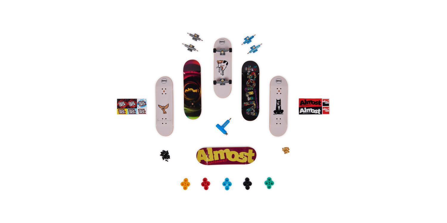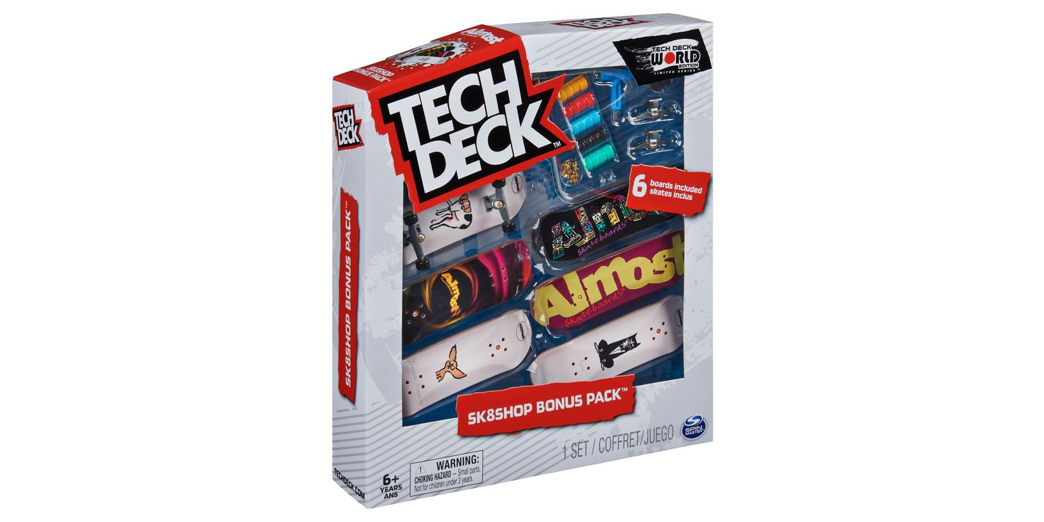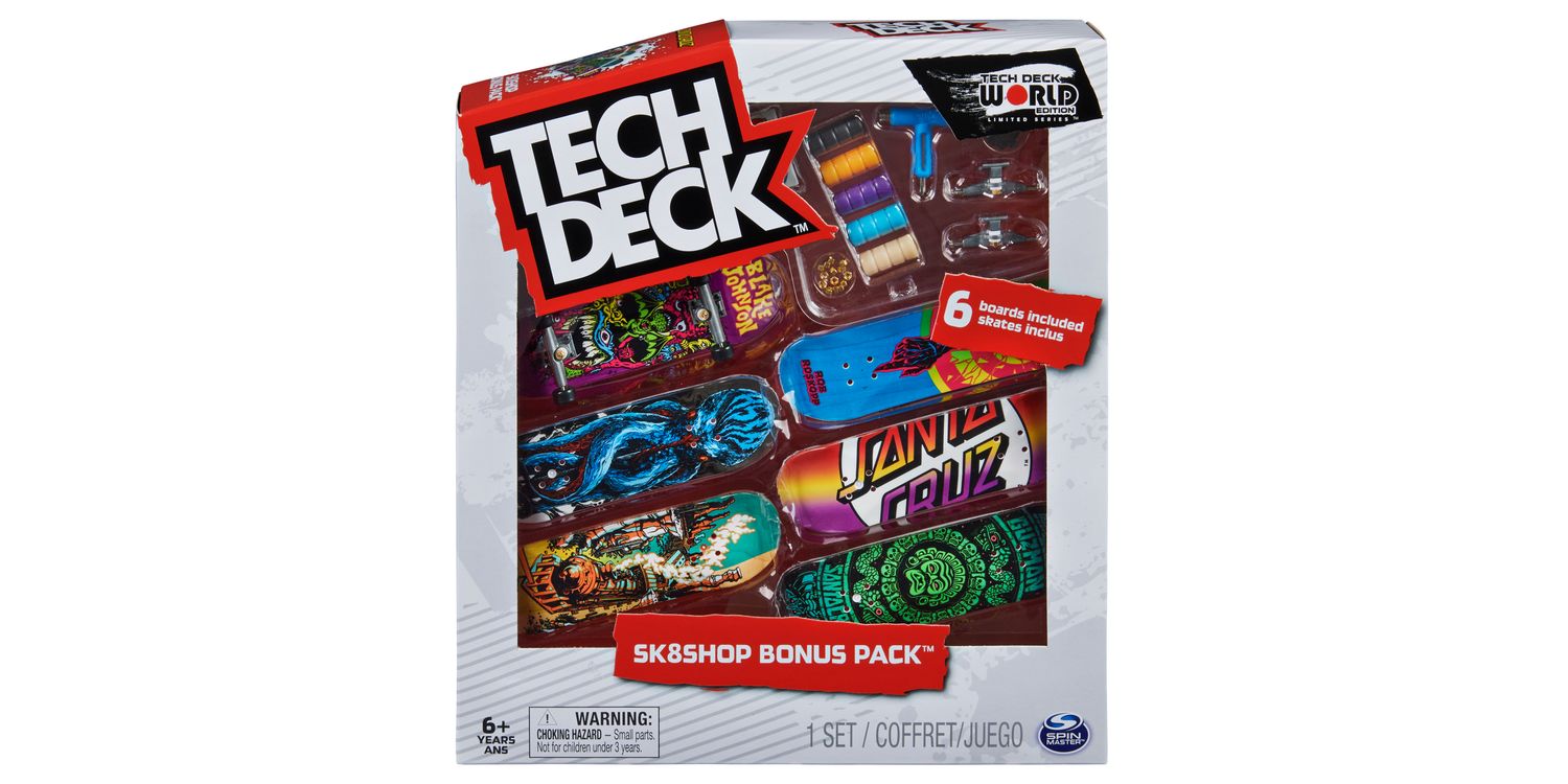 Tech Deck brings you the real deal with authentic 96mm fingerboards from real skate companies! Each one features legit graphics from the biggest skate companies in the world, including Blind, Baker, Primitive, Finesse, Santa Cruz, Plan B, Sk8mafia, and Toy Machine. This Sk8shop Bonus Pack includes everything you need to build 6 custom boards, including stickers, wheels, and tools. Recreate your favourite lines and expand your trickionary by checking out online trick tips on techdeck.com. As you build your collection, compare it online with Tech Deck’s interactive collector’s tool. There are a ton of Decks to collect! If you want real skate graphics from real skate companies, then it’s got to be Tech Deck — collect the deck! Sk8shop Bonus Pack includes 6 boards (styles vary). Collect the whole series (each sold separately). Build and customise complete boards any way you want. Find the golden trucks hidden in select packs! Tech Deck Sk8shop Bonus Pack is for skate-lovers ages 6+. No batteries required. Includes: 1 Assembled Fingerboard, 5 Tech Deck Boards with Grip Tape, 2 Sticker Sheets, 20 Wheels, 1 Skate Tool, 1 Collectors Poster, 4 Skateboard Trucks, 26 Screws, 14 Nuts
