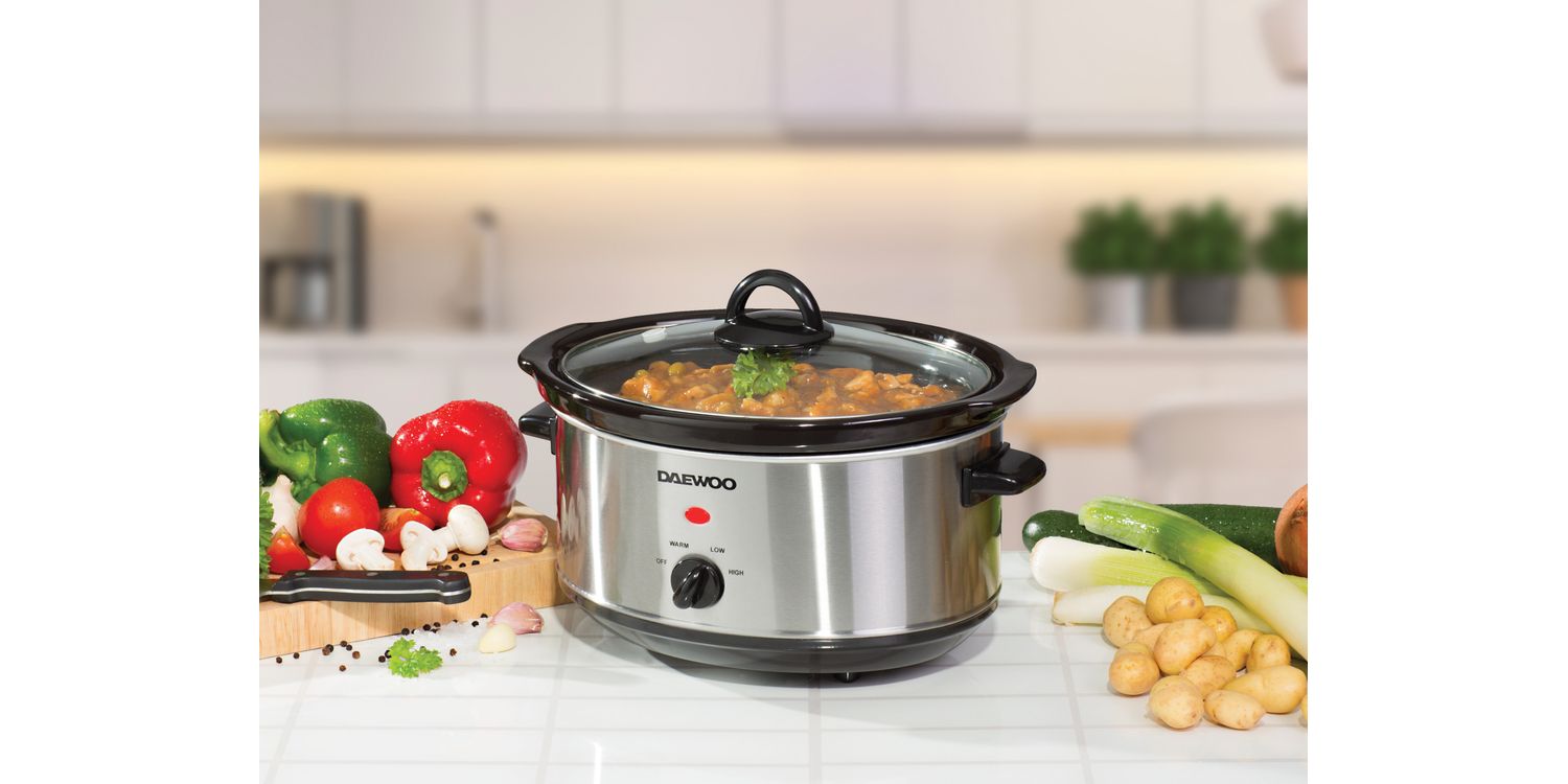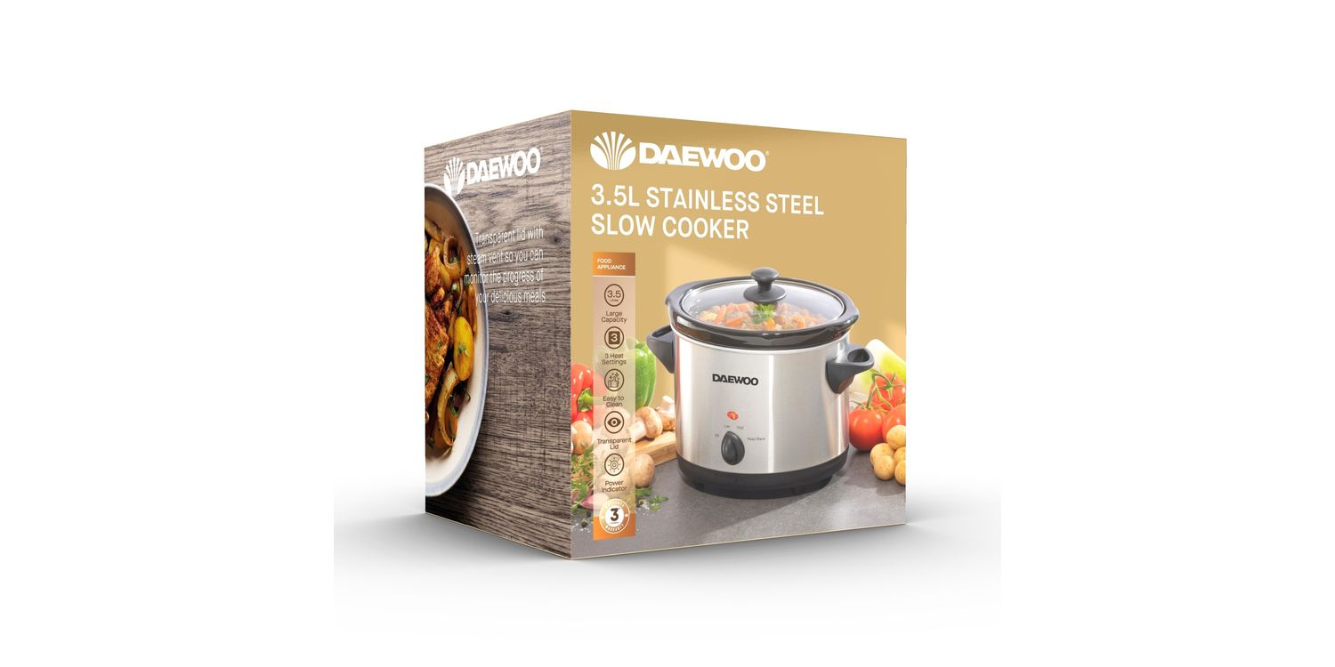 Enjoy energy efficient cooking that's perfect for serving 3 - 4 people. This 3.5 litre slow cooker has 3 heat settings, cool touch handles and a removable, dishwasher-safe stoneware pot and durable glass lid.
