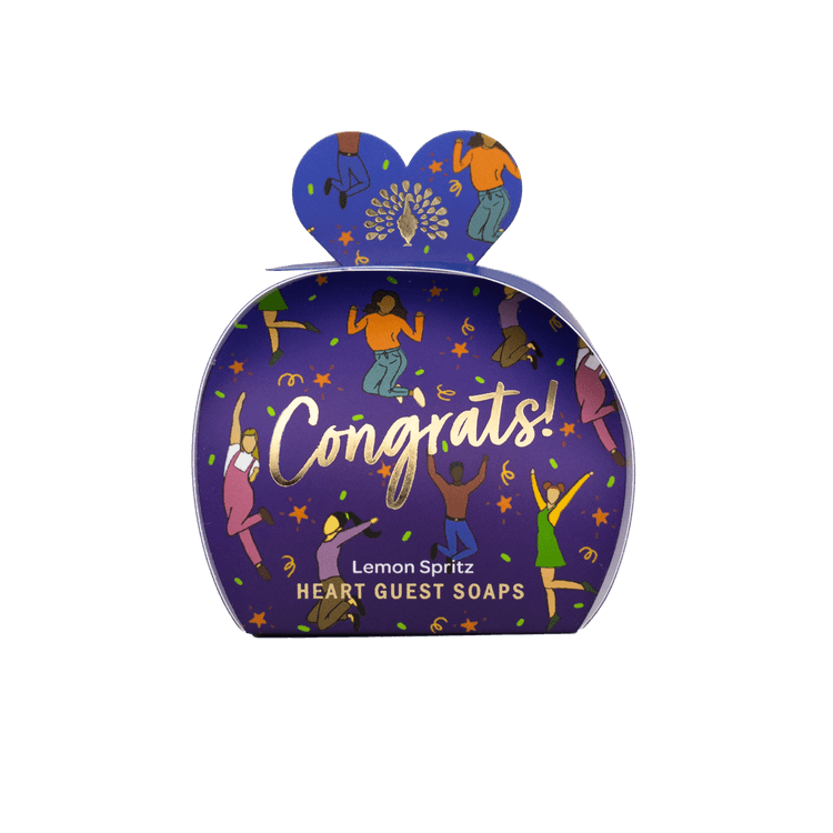 Why not share your happiness for them with one of our Congrats Heart Guest Soaps. Containing three mini heart-shaped soap bars, this beautifully packaged gift box marks, a heartfelt way to express your love and gratitude. The soaps have a zesty fragrance featuring a top layer of lemon grass, Sicilian lemon and sweet orange, with a heart of rose petals and violet.