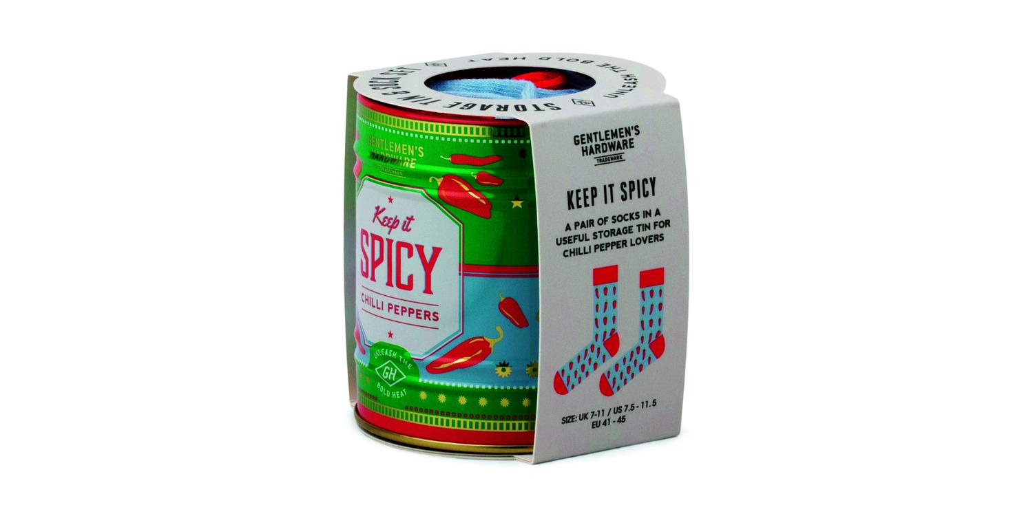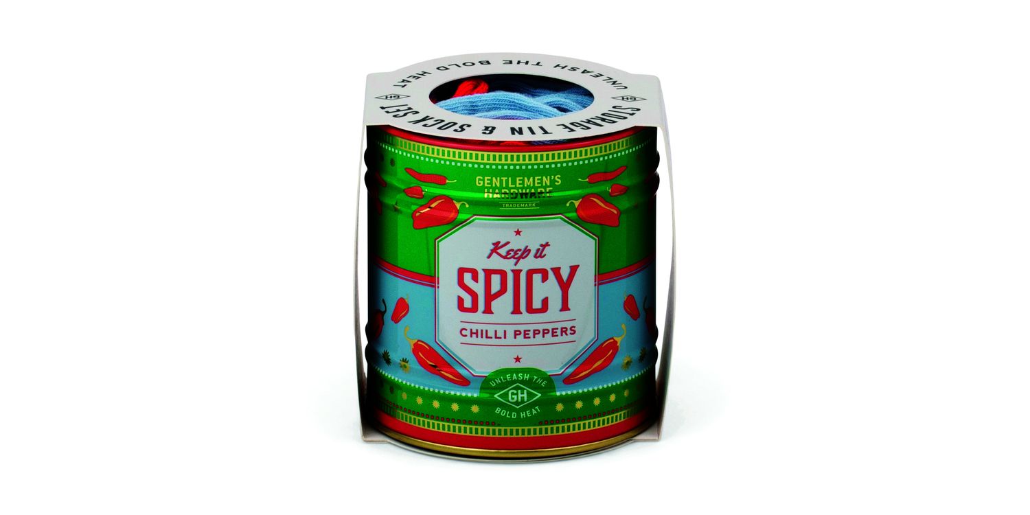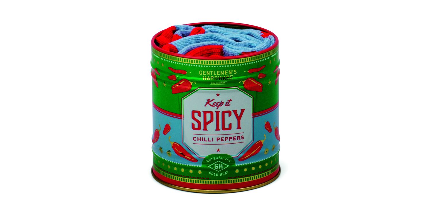 A pair of socks in a useful storage Tin for chilli pepper lovers.