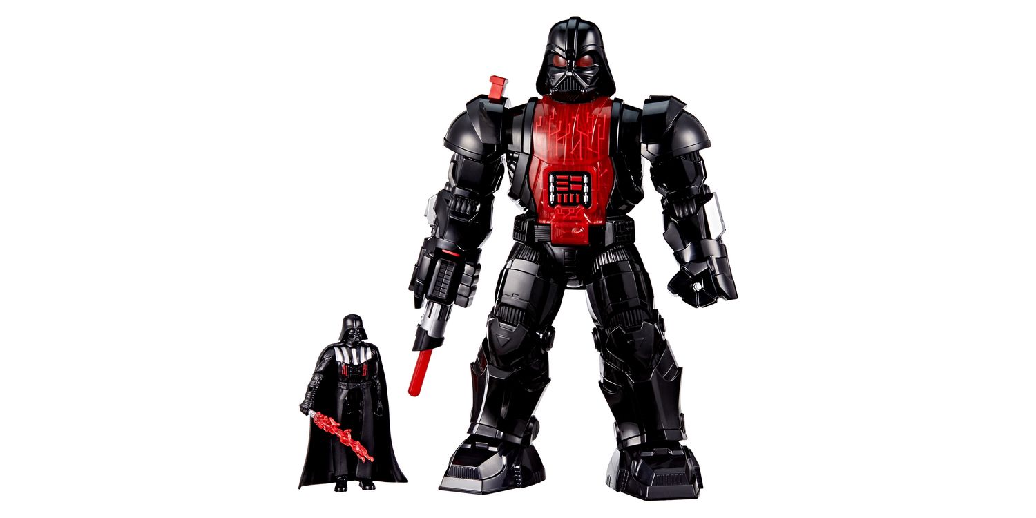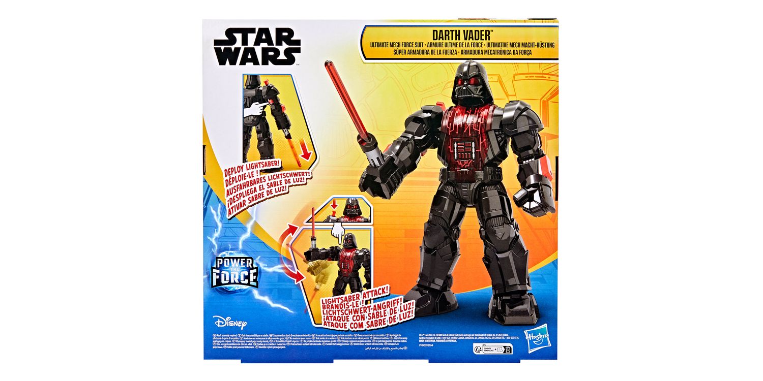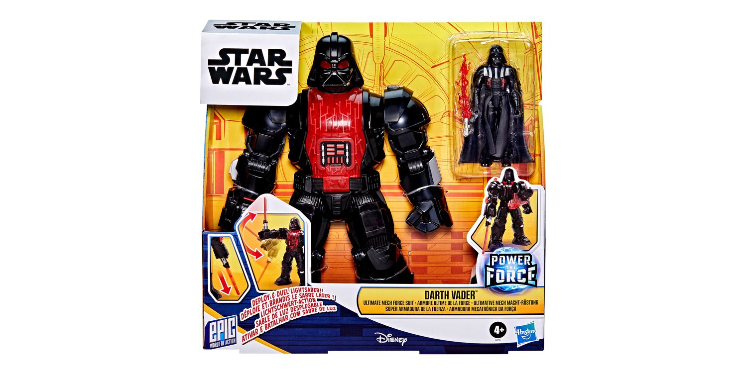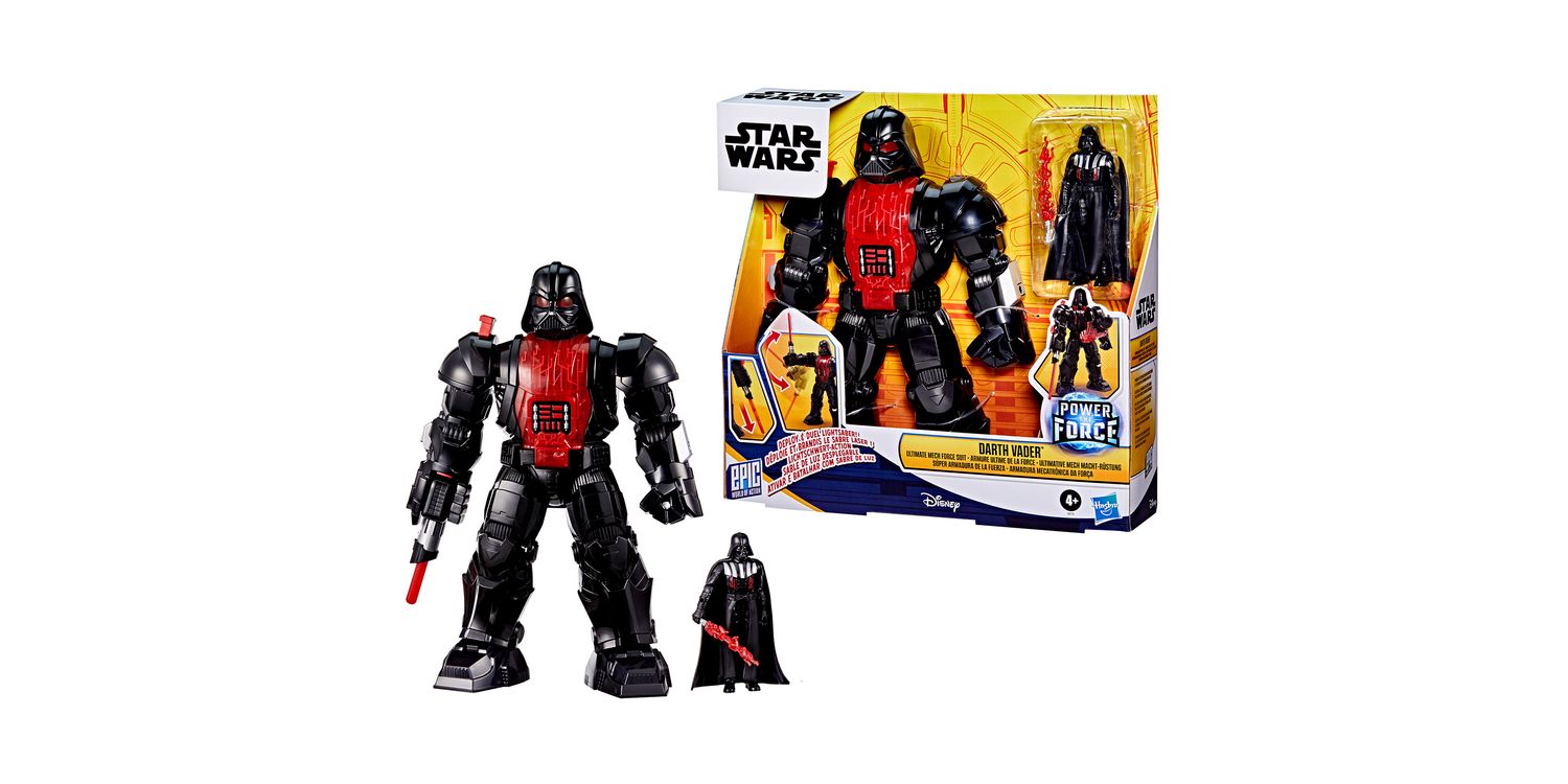 A classic Star Wars villain is reimagined in the Star Wars Epic World of Action Darth Vader Ultimate Mech Force Suit. Introduce kids to the world of Star Wars action figures with a fan-favourite character inside an armored mech suit. This Darth Vader toy comes with a 4-inch figure (10 cm), a Lightsaber accessory, and an 11-inch (28 cm) mech suit. Get Darth Vader ready for battle by pressing the button on the suit’s arm to deploy a red Sith Lightsaber. Next, press the shoulder button to activate Lightsaber attack mode and imagine Darth Vader is in an action-packed Lightsaber duel. Look for even more figures, mech suits, and vehicles to collect across Hasbro's Epic World of Action inspired by characters like the Mandalorian and a stormtrooper. (Each sold separately. Subject to availability.)