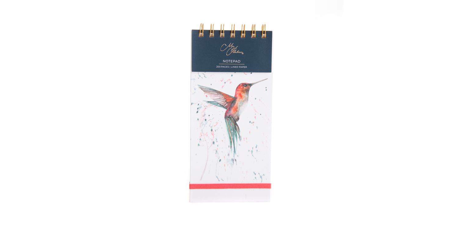 Meg Hawkins - The Rainforest Hummingbird Watercolour Design Notepad Bring beauty to your notes with The Rainforest Hummingbird DL Notepad by Meg Hawkins. Featuring stunning watercolor artwork of a hummingbird, this elegantly designed notebook is perfect for journaling, sketching, or jotting down ideas. With its compact DL size, it’s ideal for use at home, and on the go. High-quality pages provide a smooth writing experience, making it a wonderful gift for nature lovers, writers, and artists alike. This charming blend of artistry and practicality makes it a must-have for any stationery collection.