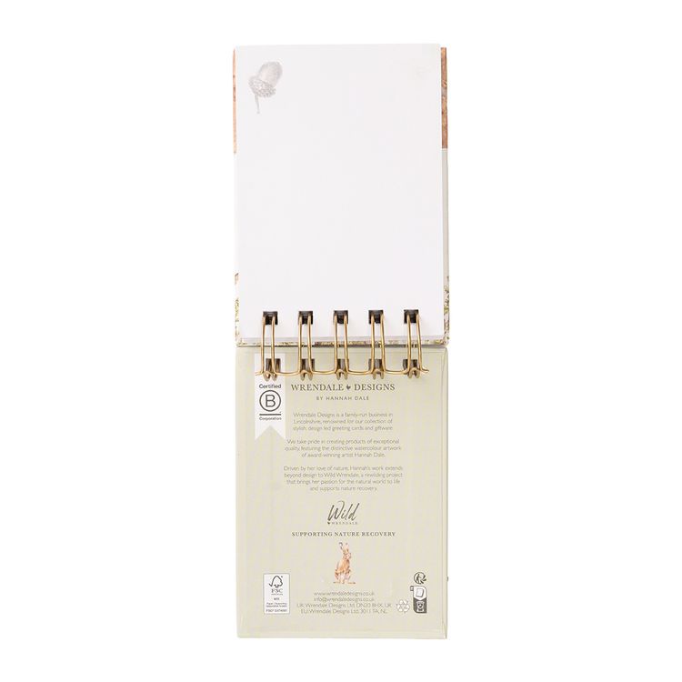Perfect for jotting down notes, lists and findings this field notebook is the ideal size for keeping handy while out and about. This notebook has our 'Wild Woodland' design on the front, illustrated pages with alternate lined and blank pages and a wiro top.