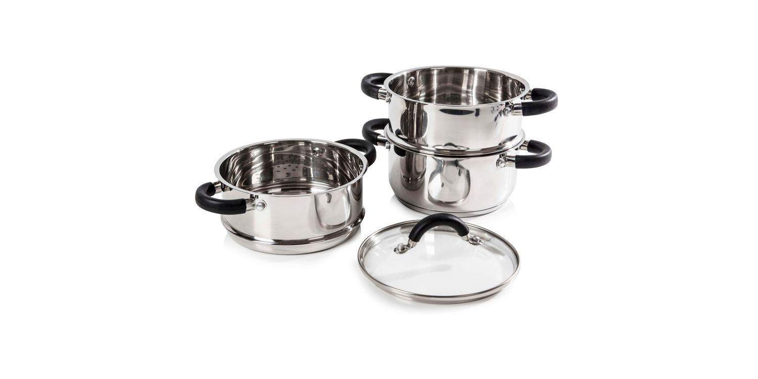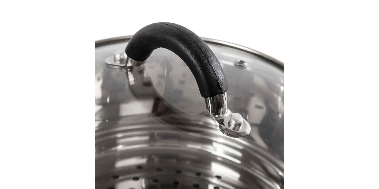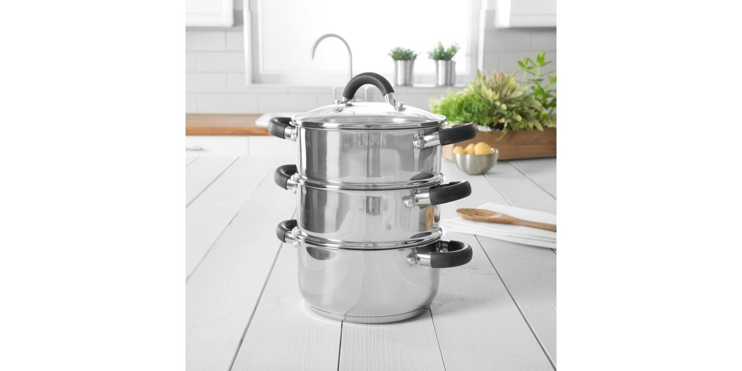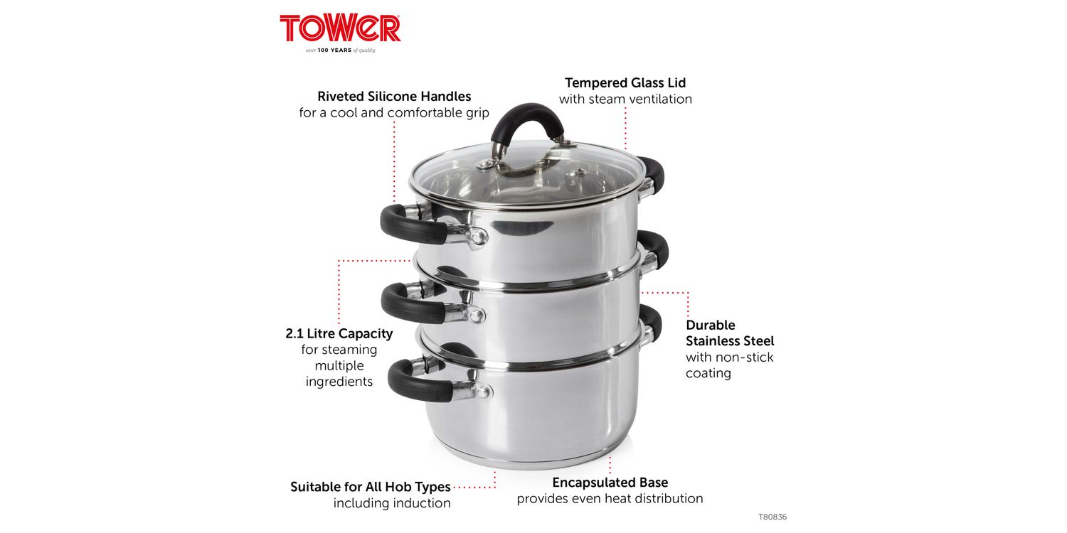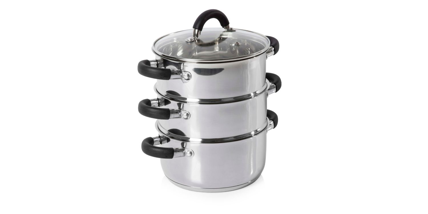 Stylish, efficient and generously-sized, this 3-tier steamer is ideal for preparing vegetables, meat and fish for one person or all the family. An encapsulated base ensures even heat distribution, reducing cooking time whilst also avoiding hot spots, while tempered glass lids provide clear visibility, allowing for more efficient cooking. Its silicone-covered riveted handles make the steamer easy to use and carry, while the encapsulated base ensures even heat distribution and makes it suitable for all hob types including induction, adding versatility. Dishwasher and oven safe for up to 200C, this steamer set is finished with a stainless steel polished finish, making it as attractive as it is practical.