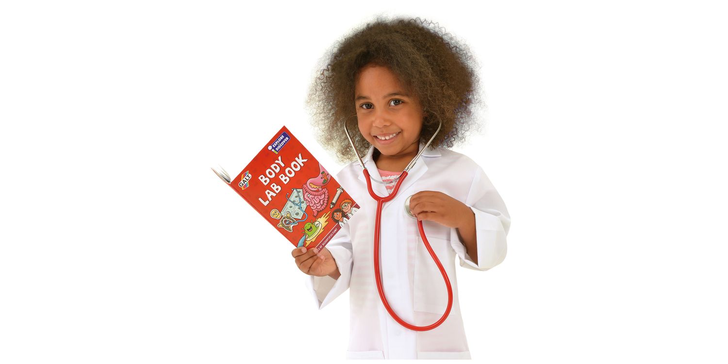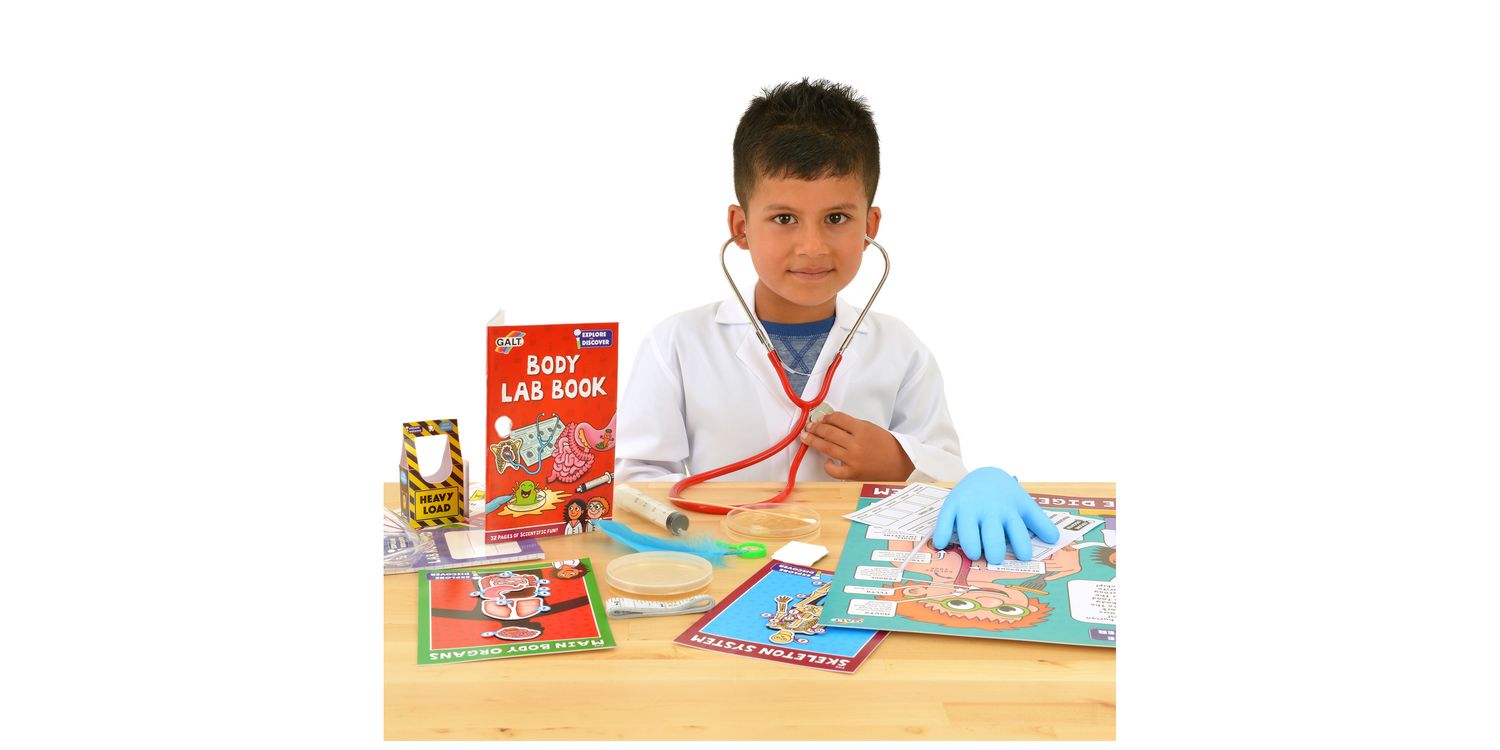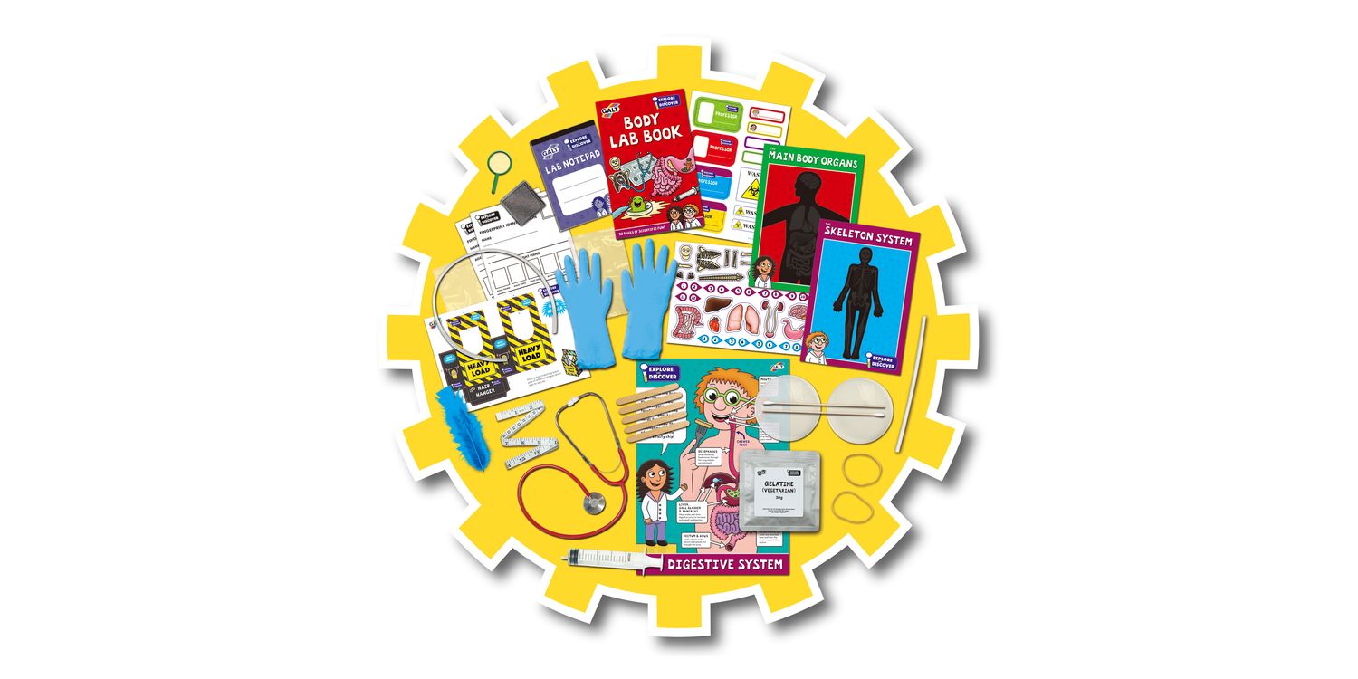Contents: stethoscope, 2 petri-dishes, gloves, 2 swabs, feather, tape measure, syringe, vegetarian gelatine, tubing, straw, fingerprint ink pad, ID sheets, magnifying glass, 5 wooden sticks, 2 rubber bands, 2 ziplock bags, reusable bone and organ stickers, skeleton card, organ card, printed card pieces, digestive system poster, stickers, notepad and 32-page Lab book.