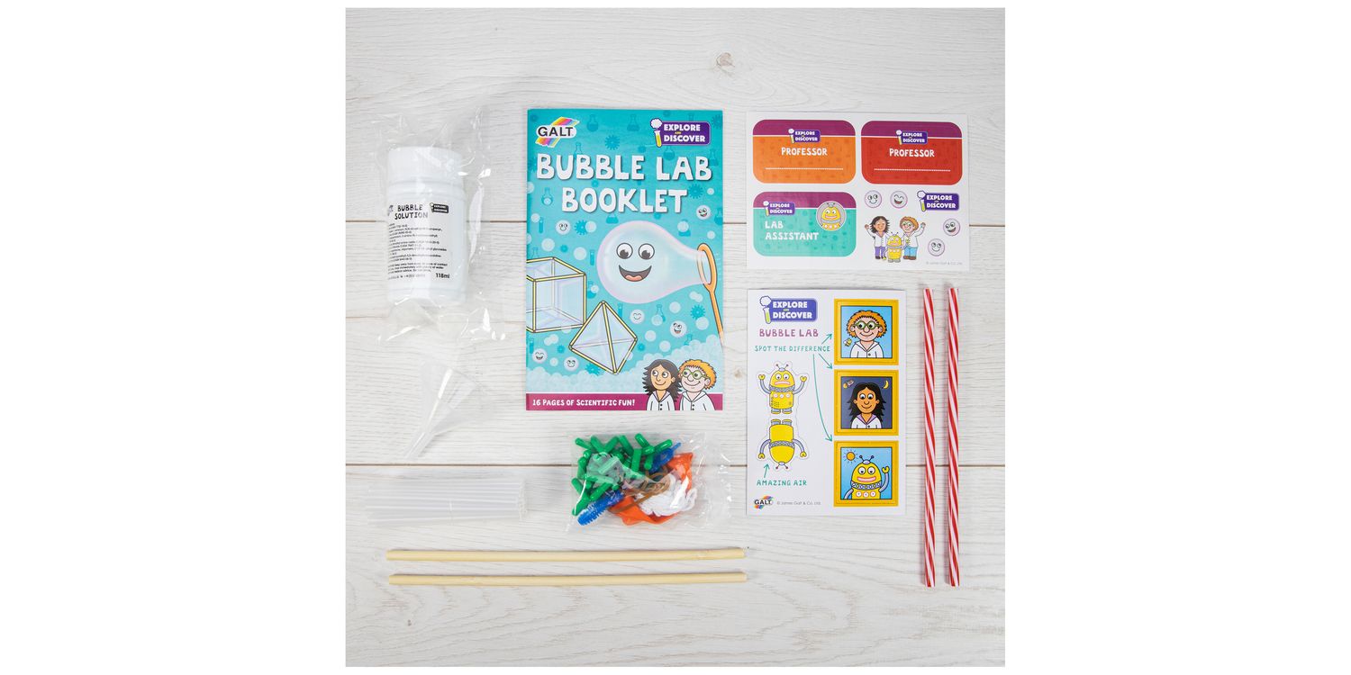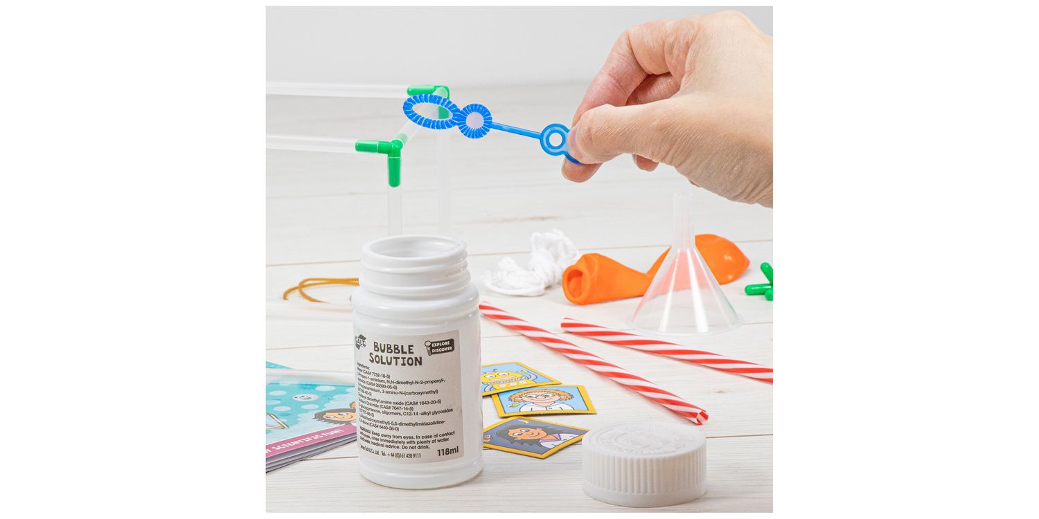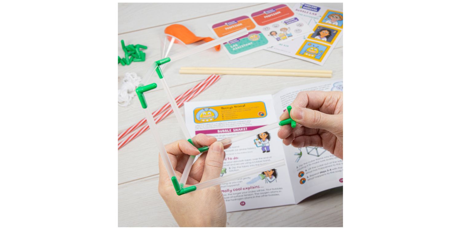COMPREHENSIVE KIT: Bubble solution and wand, glycerine, funnel, 2 wooden sticks, 12 connectors, 20 reusable straws, balloon, 2 rubber bands, string, washer, printed card pieces, stickers and lab book