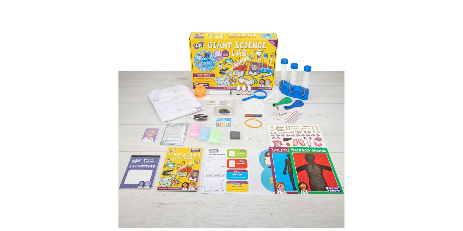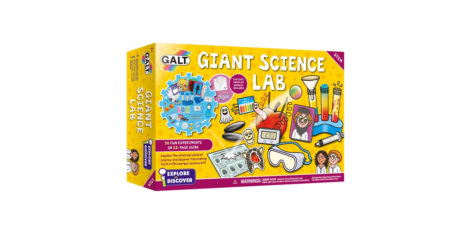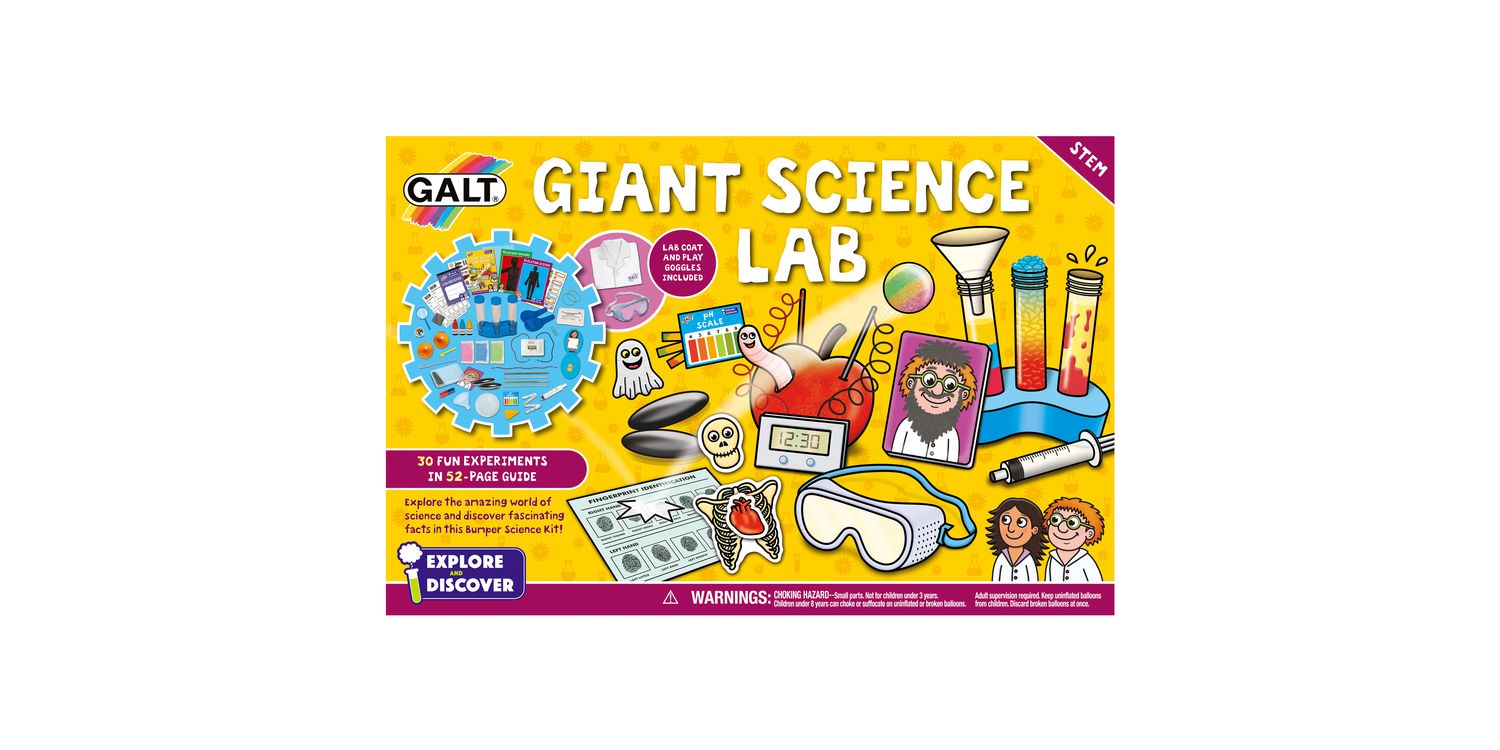 Explore the amazing world of science and discover fascinating facts in this Giant Science Lab! This exciting kit for young scientists includes a lab coat, play goggles and a 52-page full colour Lab book – packed with 30 interesting experiments to encourage early STEM learning and scientific thinking while having fun! Explore chemistry by powering a clock with an apple, investigate biology by examining your fingerprints and discover fascinating physics using mysterious magnets!