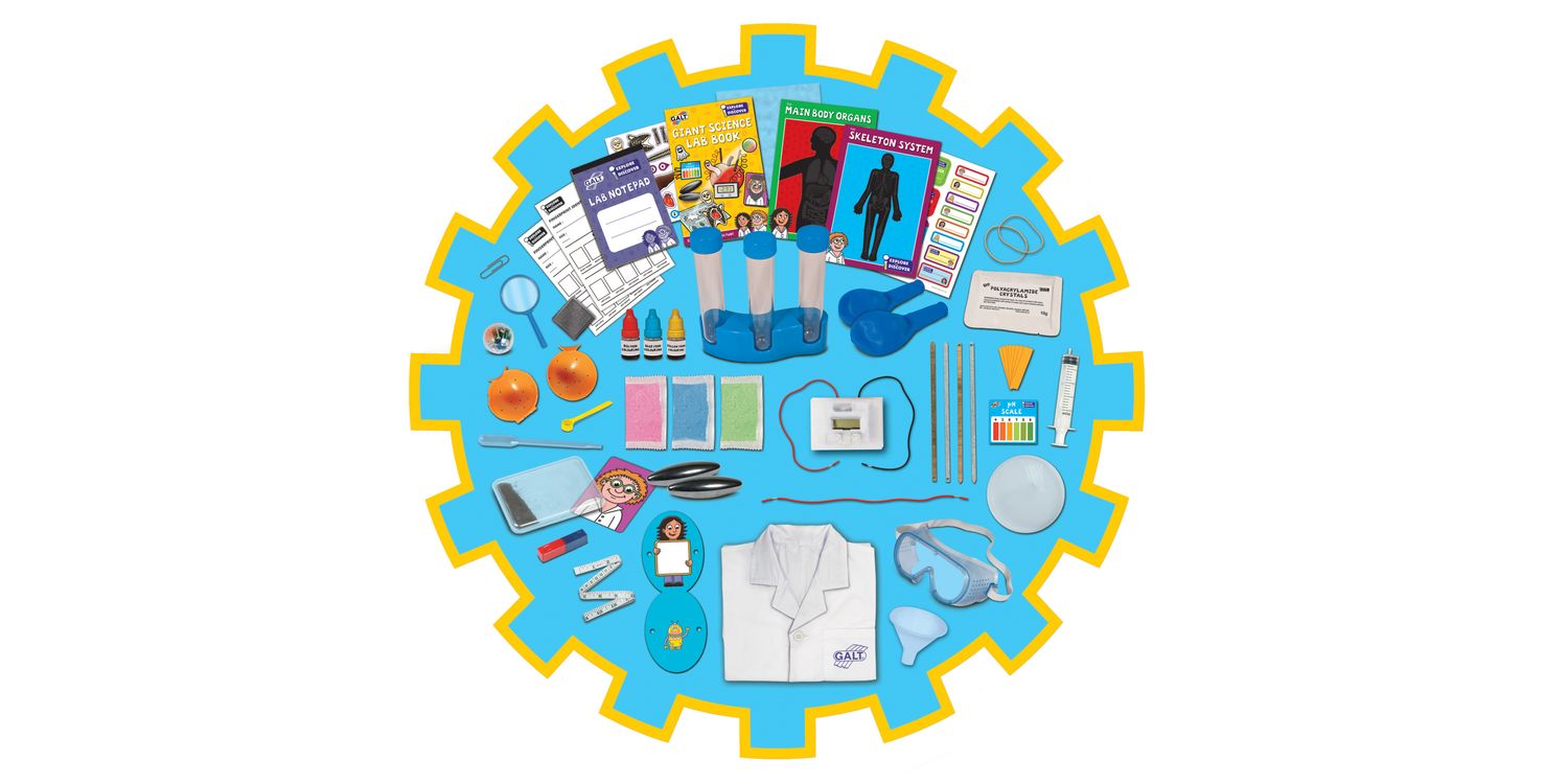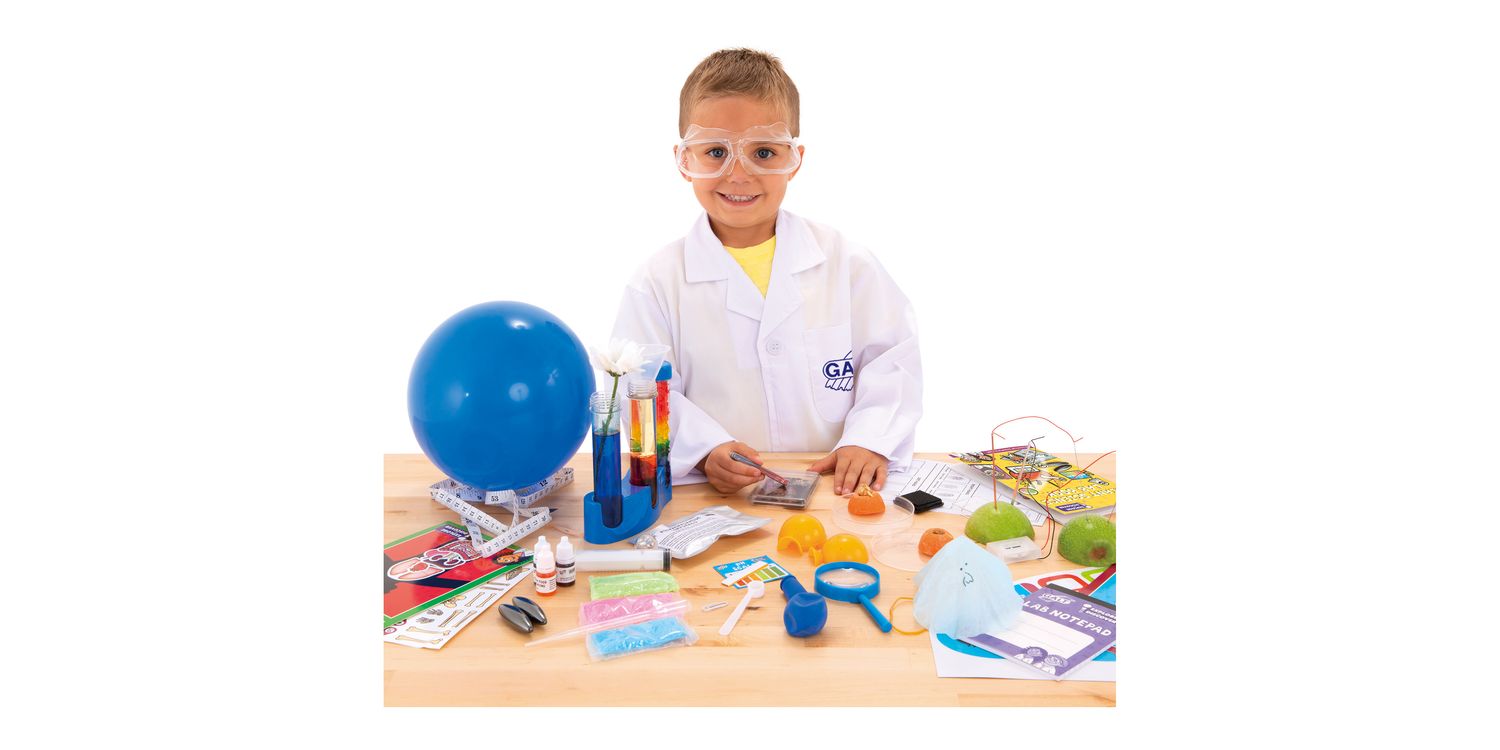 Contents: lab coat, play goggles, test tube rack, 3 test tubes, apple clock parts, iron filings capsule, reusable vinyl face sticker, bar magnet, 2 rattle magnets, bouncy ball mould, 3 bags of bouncy ball crystals, flashing LED capsule, Petri-dish, pipette, funnel, 3 food colourings, potassium polyacrylate crystals, plastic syringe, ink stamp pad, 2 fingerprint ID sheets, pH scale, universal indicator paper, tape measure, magnifying glass, measuring scoop, 2 balloons, 2 rubber bands, paper clip, organ and skeleton cards, reusable bone and organ stickers, printed card pieces, tissue paper, stickers, notepad and 52-page Lab book!