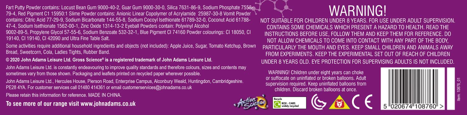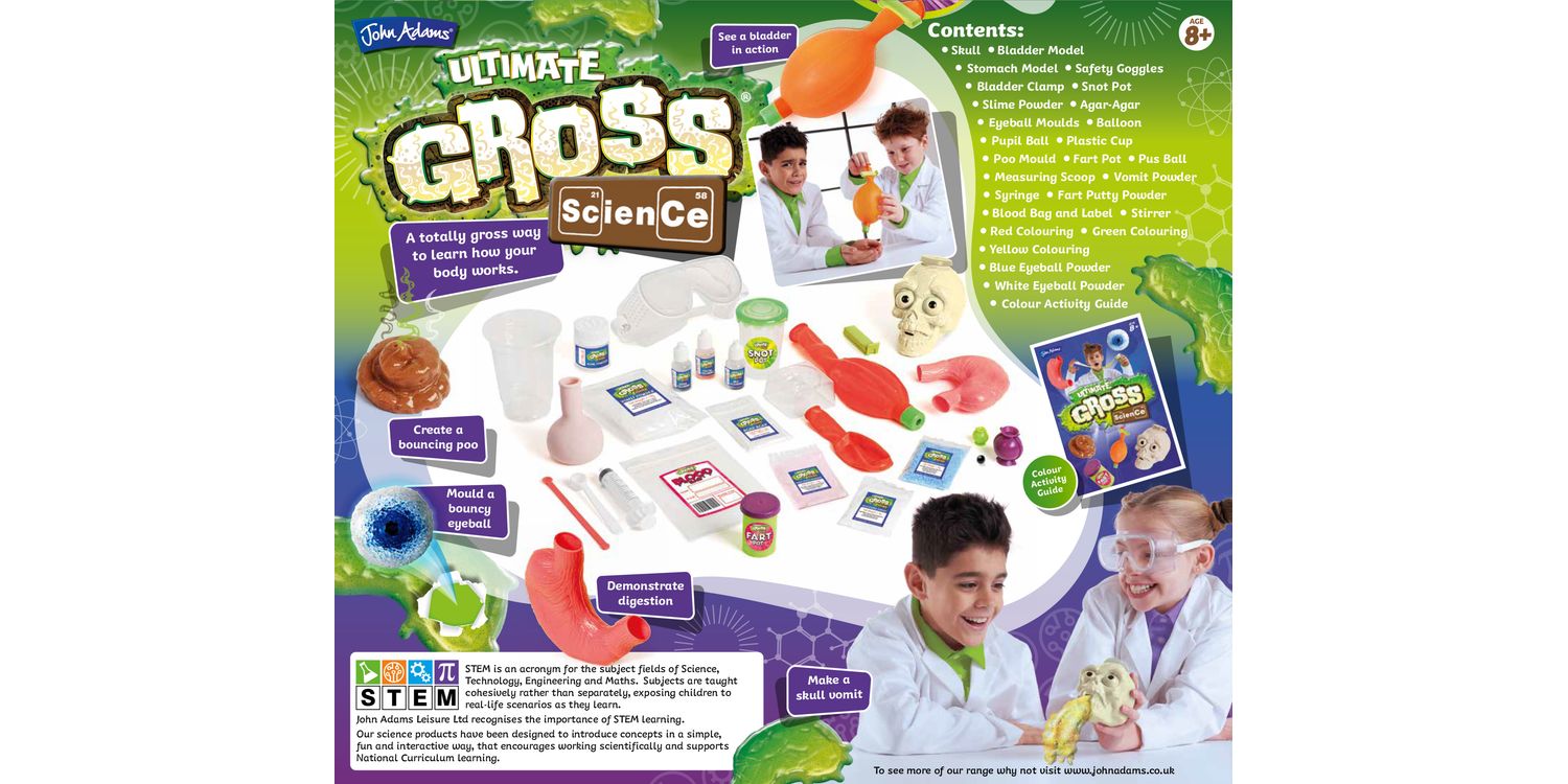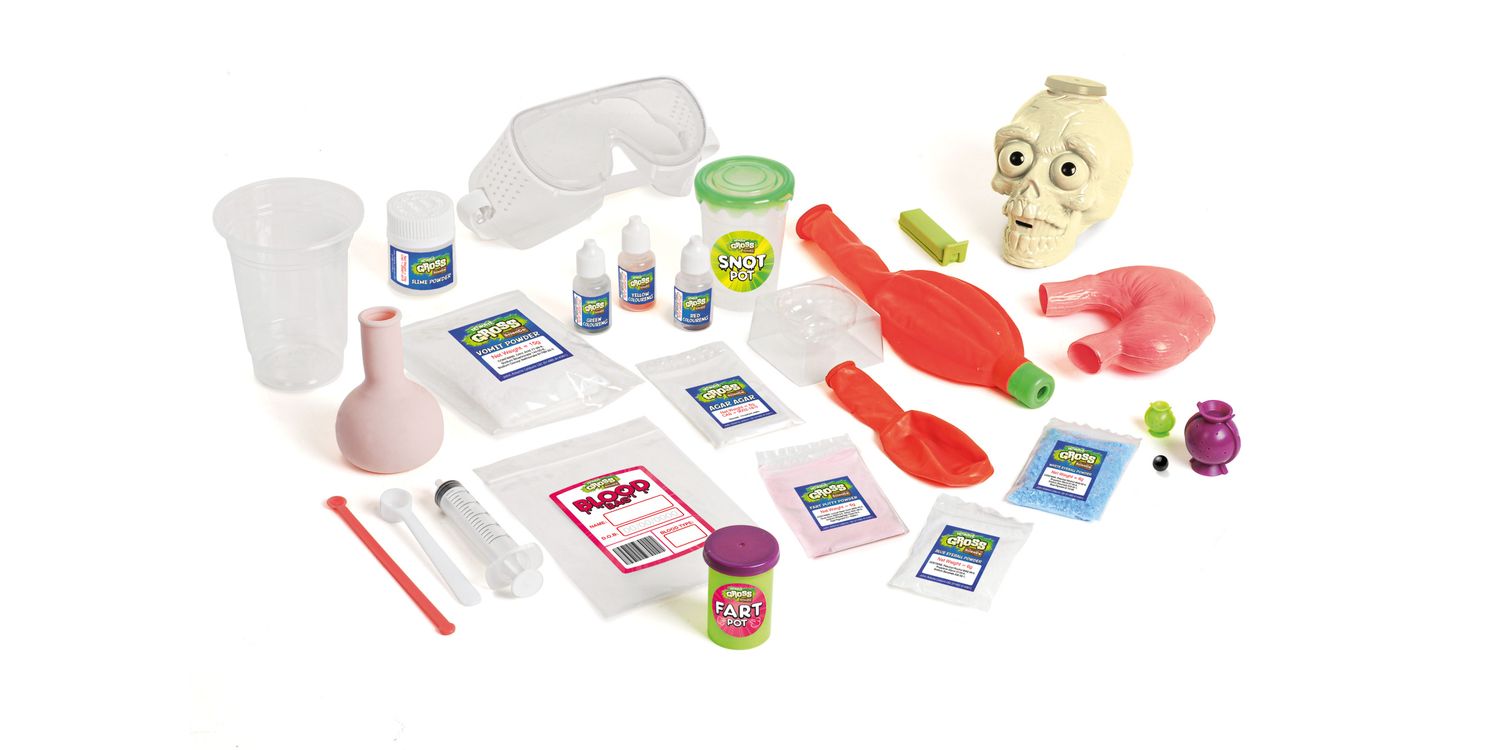 This extremely gross science set will help you to explore and understand how the human body functions. It supports National Curriculum learning and is safe, educational and fun! Explore extremely gross science with over 12 really yucky scientific experiments. Learn how farts are produced and make a bouncing poo! Understand digestion and how your bladder pees; experiment with slime and make your own disgusting pus ball; make fake blood and see it congeal; plus create a vomiting skull and much more! Comes with clear instructions about how to conduct the experiments at home, as well as the method and science behind what you’re doing. Please note that some activities require additional household ingredients and objects (not included): apple juice, sugar, tomato ketchup, brown bread, sweetcorn, cola, ladies tights, rubber band.