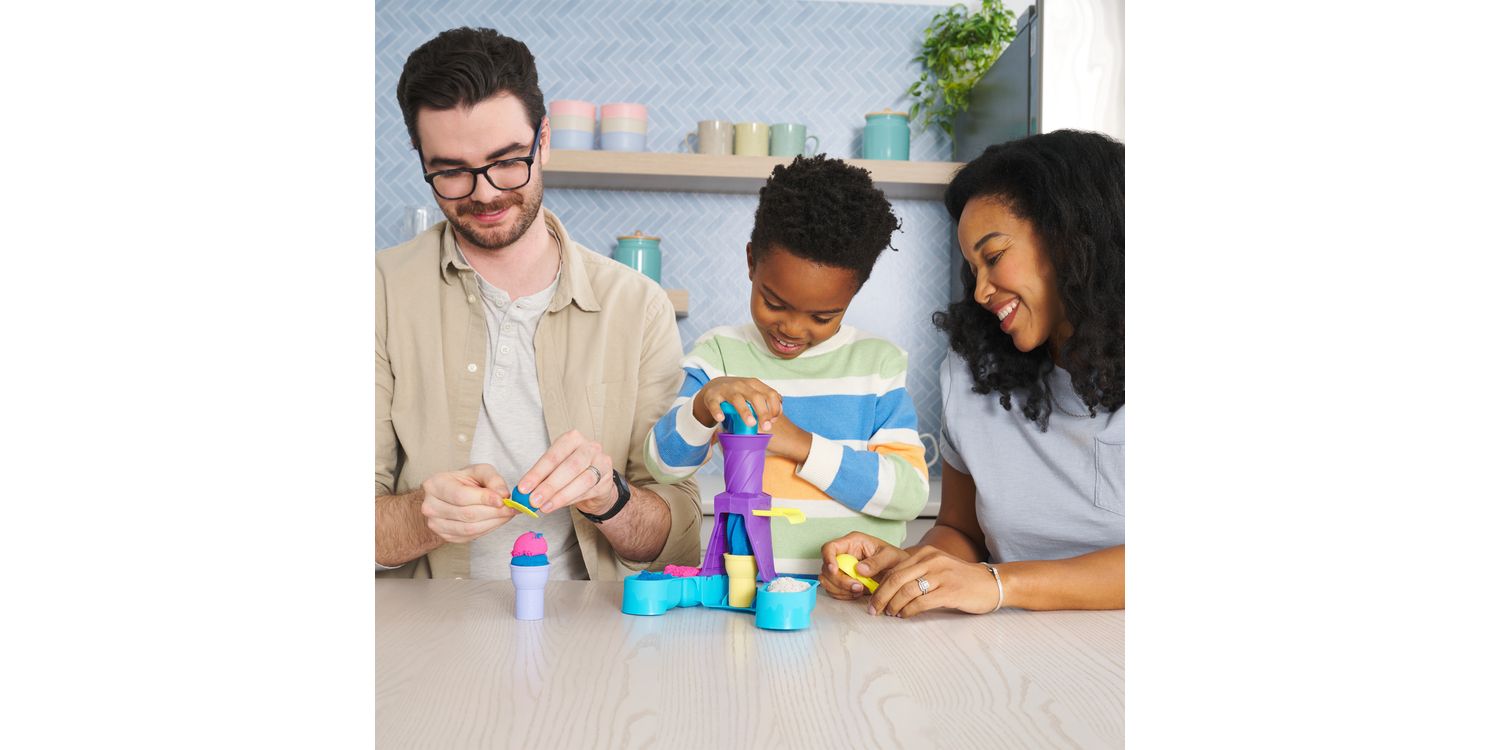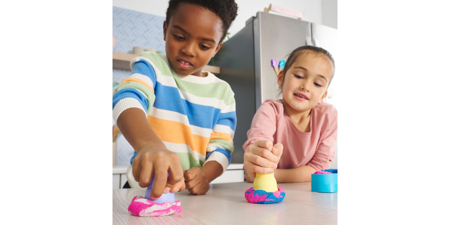 Swirl and create with the Kinetic Sand Soft Serve Station. For the first time, kids can swirl Kinetic Sand to mimic a soft-serve ice-cream experience like they’ve seen in the real world. With 396g of blue, pink and white Kinetic Sand, two ice-cream cones, and tools like a sprinkle grater and a scoop with sweet treat moulds, your child can serve up endless ice-cream possibilities. Scoop classic cones or create the ultimate swirl. Flow sand into the station, push down to swirl Kinetic Sand into the cone then remove to decorate. Add some sprinkles and extra toppings, then squish and create all over again. The One and Only Kinetic Sand is made from natural sand that sticks to itself for easy clean-up. It never dries out. Let it flow through your hands — it’s so satisfying, you won’t be able to put it down. Kinetic Sand is an exciting alternative to arts and crafts modelling clay and is a welcome addition to the craft table, sensory bin, kids’ activities time and Montessori toys. Kinetic Sand promotes fine motor skills and creativity through independent tactile play. Bring the ice-cream fun home with the Kinetic Sand Soft Serve Station.