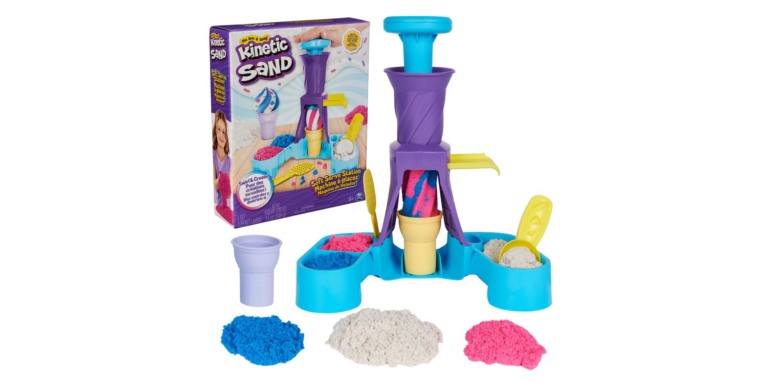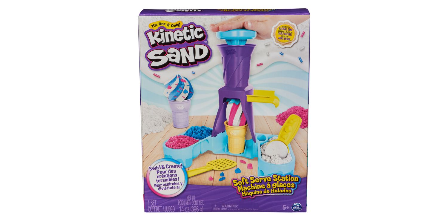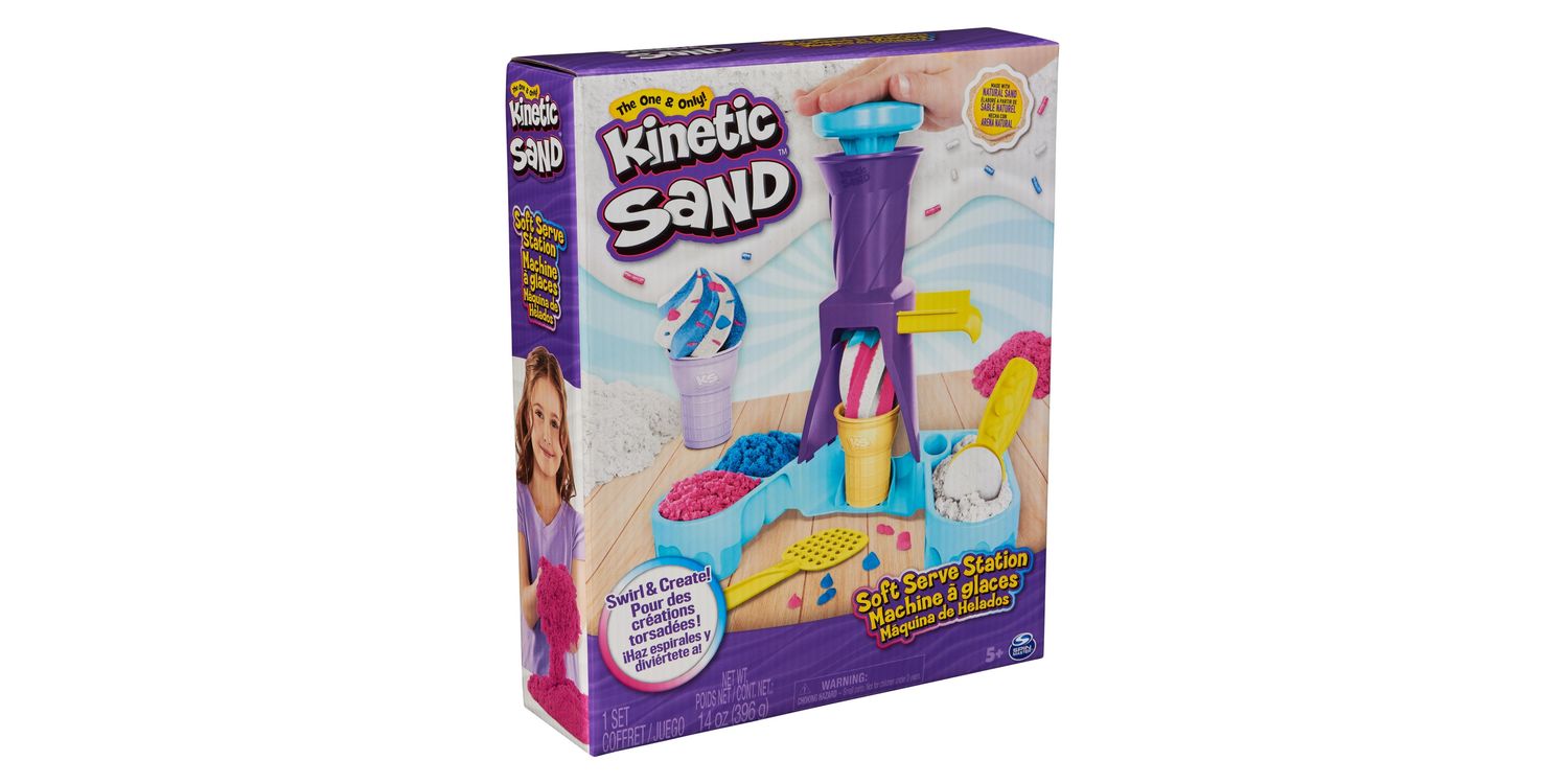Includes: 396g Kinetic Sand, 1 Ice-Cream Scoop with Moulds, 2 Ice-Cream Cones, 1 Soft-Serve Machine, 1 Sprinkle Grater, 1 Instruction Sheet