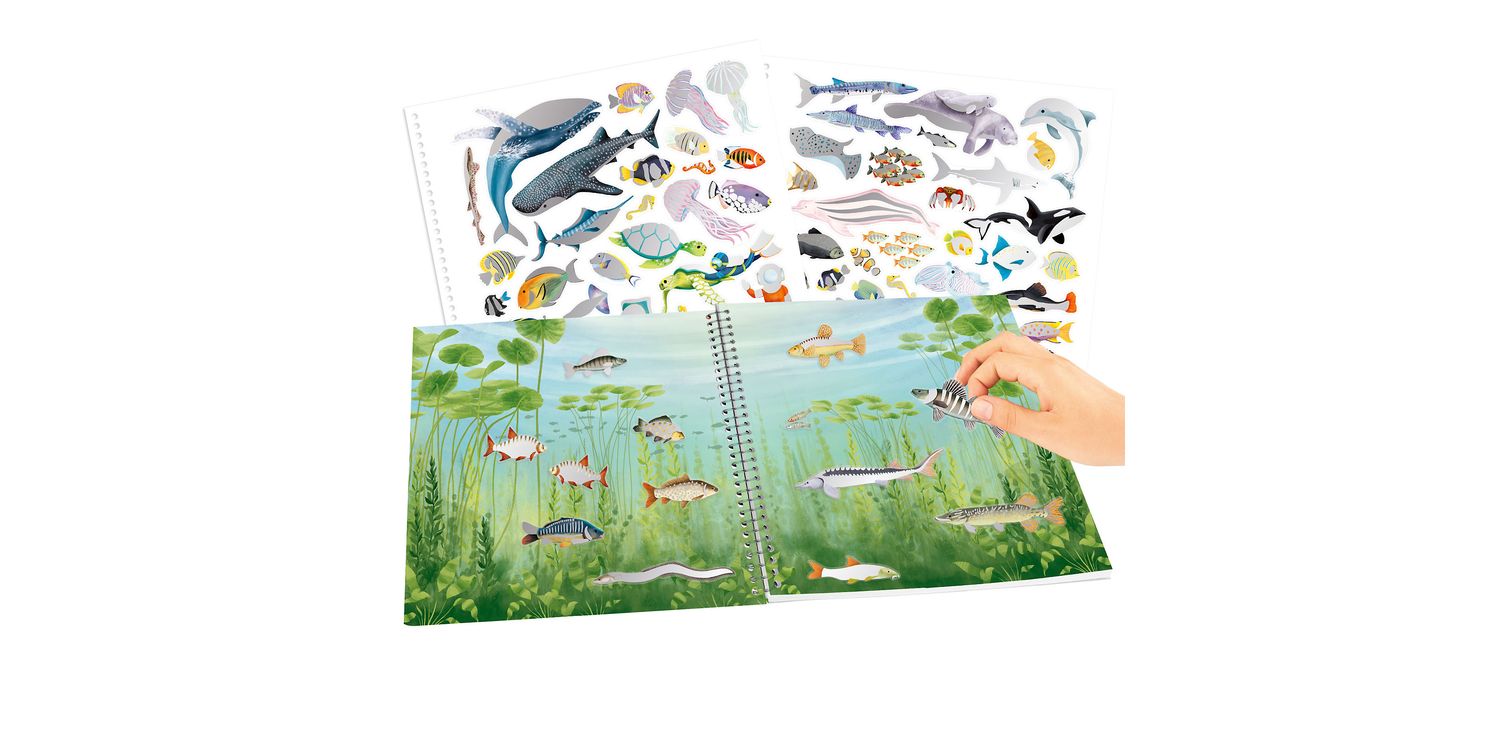 Stick and dive! This sticker book is all about the exciting underwater world. 16 pages, 3 pages of glitter stickers and 1 page of paper stickers provide animal-themed sticker fun. Cool design: the diving goggles-shaped cut-out in the cover allows you to take a peek at the stickers.