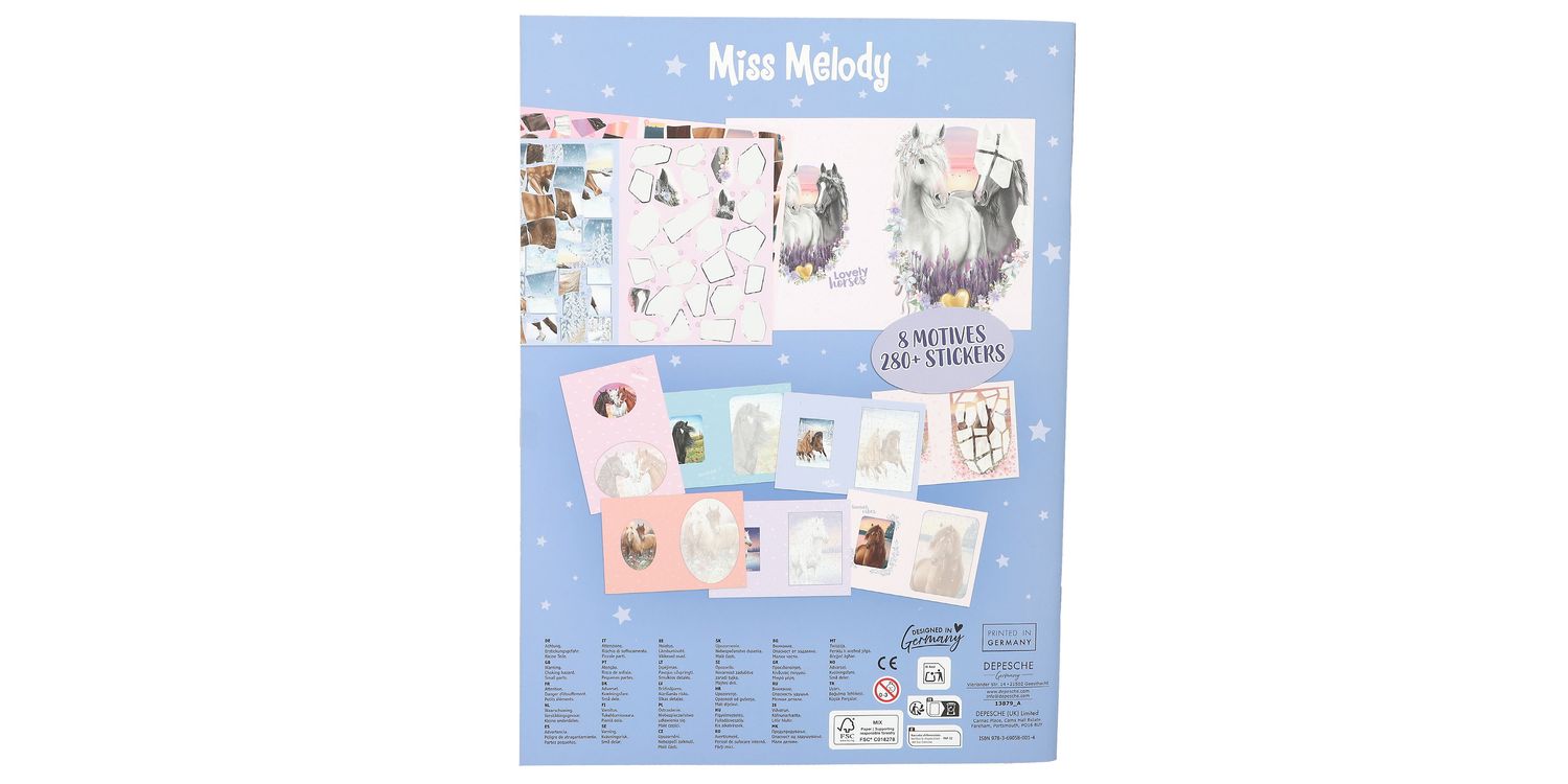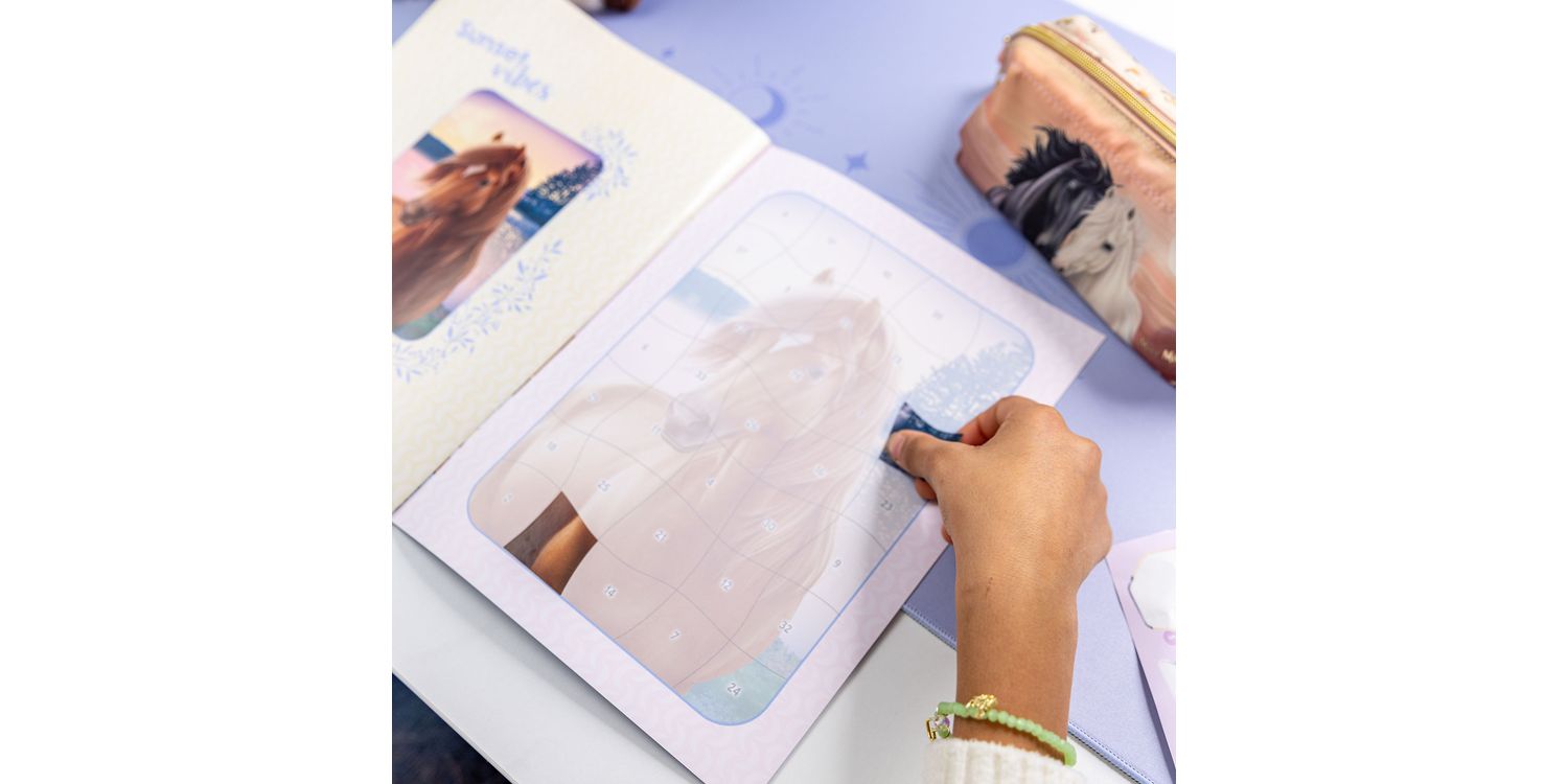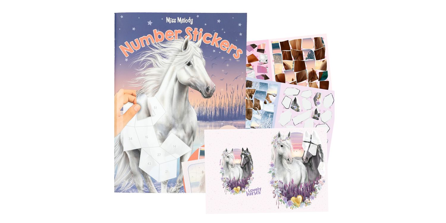 Much better: stickering by numbers! This sticker book by Miss Melody has 16 pages and 8 sticker pages. Each motif is divided into super many fields and each field has a number. Now you have to find the right sticker, which is also marked with this number. For horse artwork with brains!