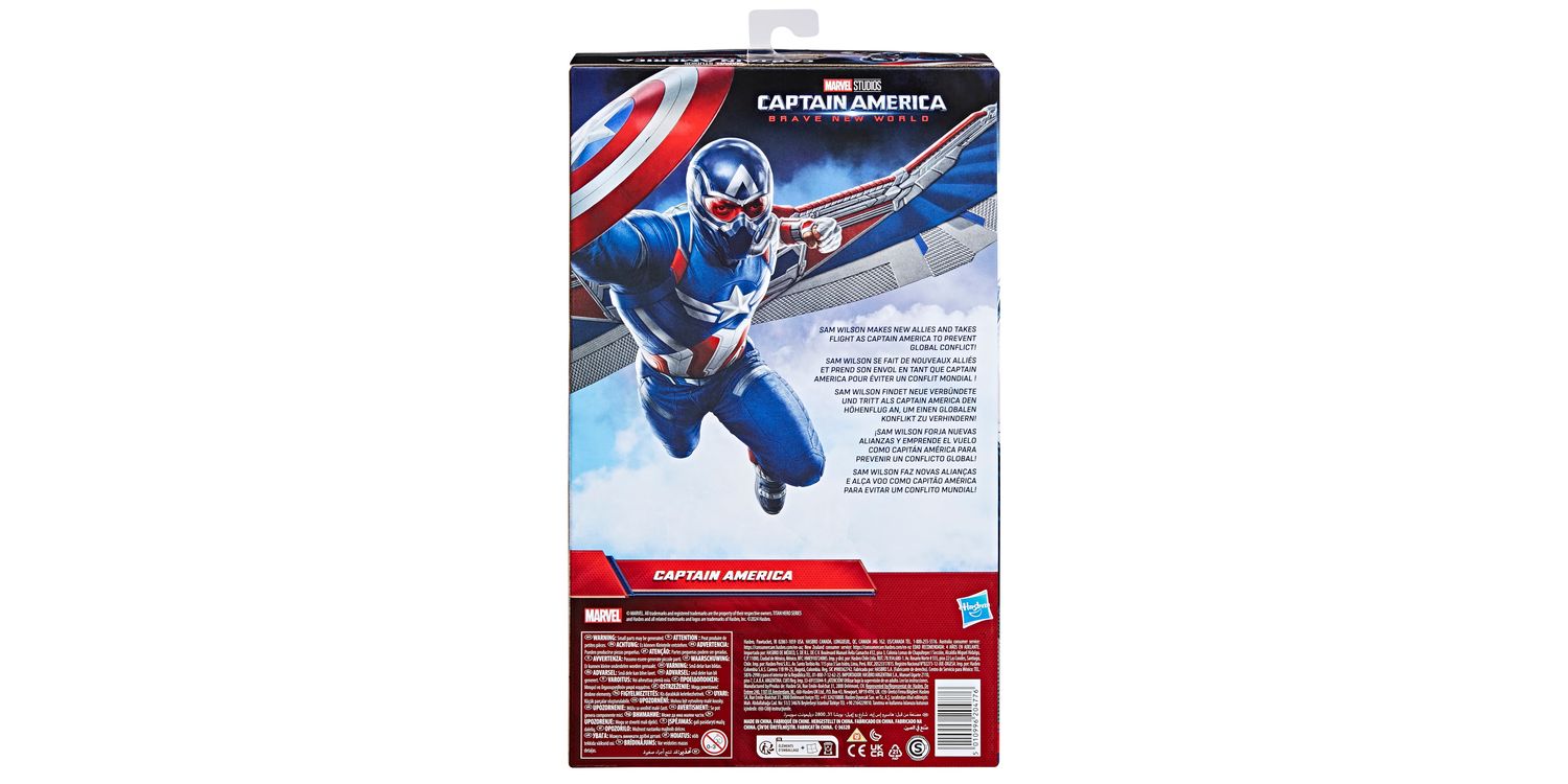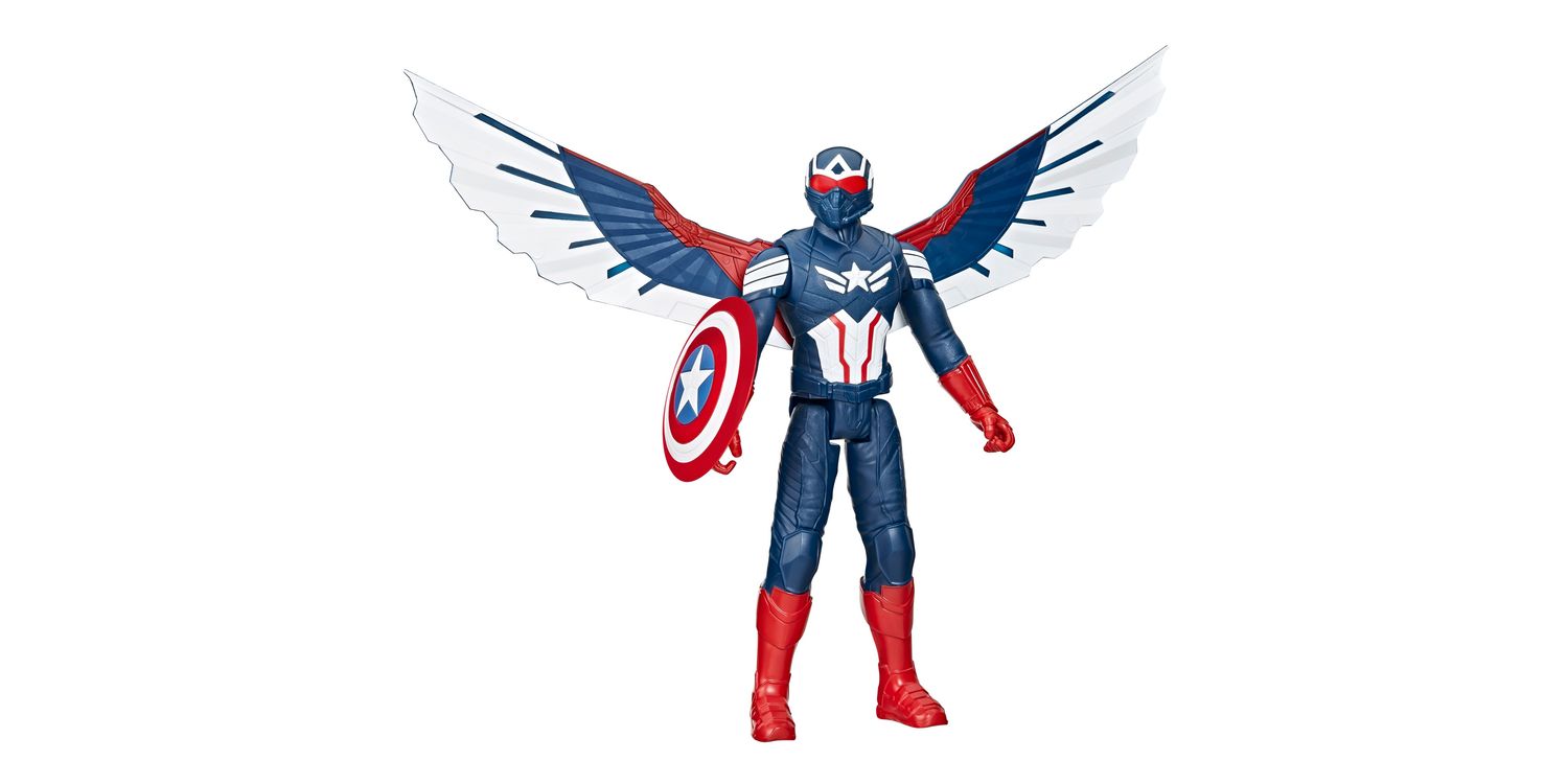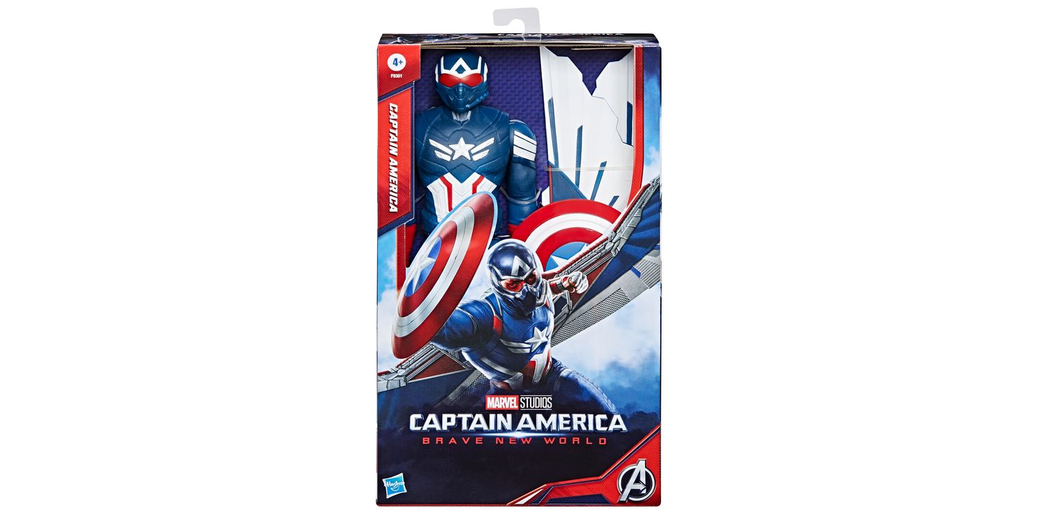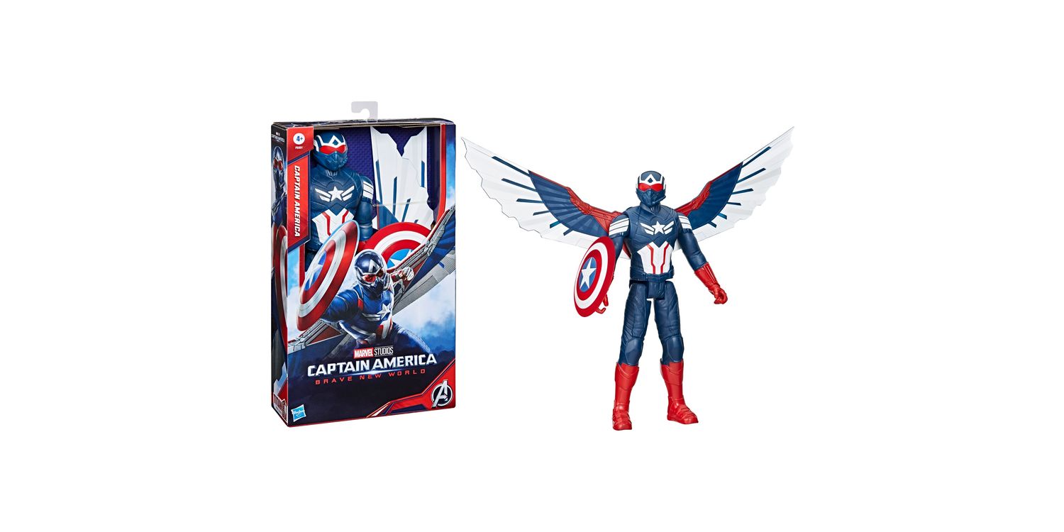 With this Titan Hero Deluxe 12-inch-scale Captain America action figure, kids can imagine stepping into an exciting, heroic world as Sam Wilson! In the latest movie from Marvel Studios, Captain America makes new allies to prevent global conflict. Kids will be inspired to let their super hero imaginations soar with their very own 12-inch-scale Captain America toy with updated movie-inspired design and deco. Figure also includes the iconic Captain America shield accessory and detachable wings for even more exciting pretend battle play against the super-strong villain, Red Hulk. Figure is packaged in an exclusive, Marvel-branded display box and makes a great addition to an Avengers toy collection. Look for more Captain America toys and figures inspired by Marvel Studios' Captain America Brave New World. (Each sold separately. Subject to availability.)