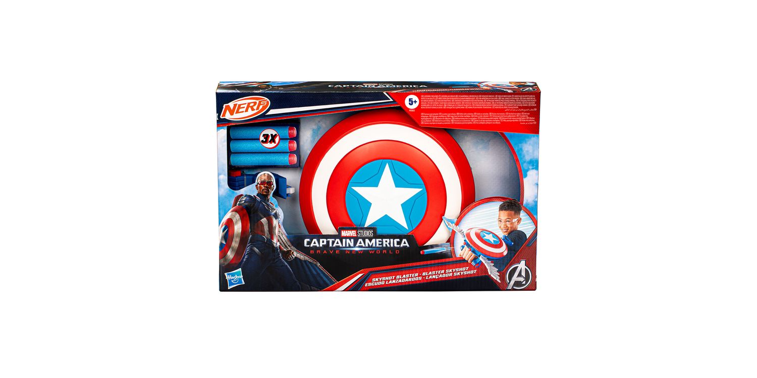 The Marvel Studios Captain America Brave New World NERF Skyshot Blaster is an action-packed roleplay toy for boys and girls ages 5 and up. This Captain America toy includes 3 NERF darts that can be stored at the front of the blaster. To activate, load a dart, pull back lever to prep dart while activating pop-out wings, and push button on either side of the handle to fire! Captain America shield blaster also features an adjustable strap and can comfortably fit most kids ages 5 and up. Play indoors to blast enemy action figures (sold separately), or take the fun outdoors to imagine even more super hero adventures! Skyshot Blaster makes a fun, action-packed addition to any Captain America mask or costume for Halloween and other super hero themed parties!
