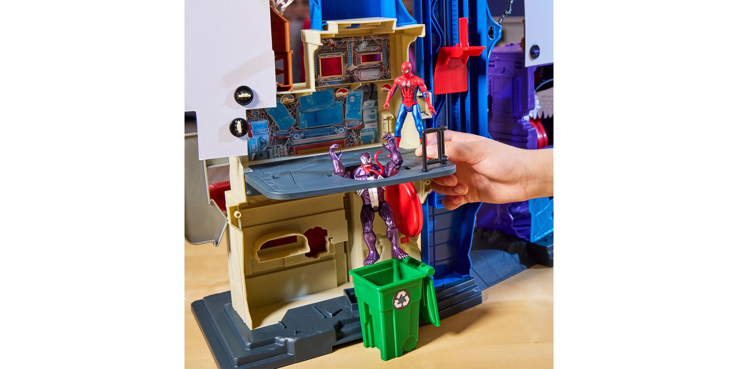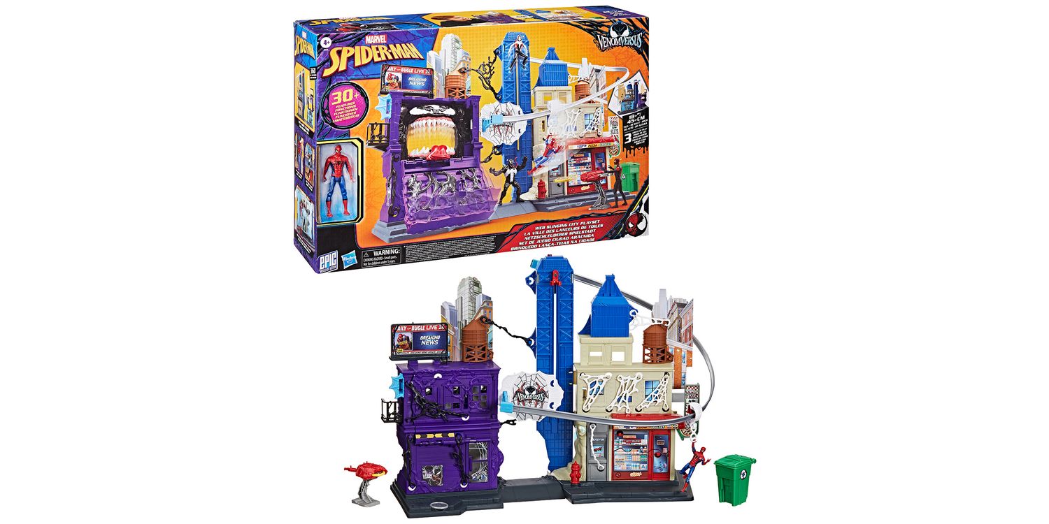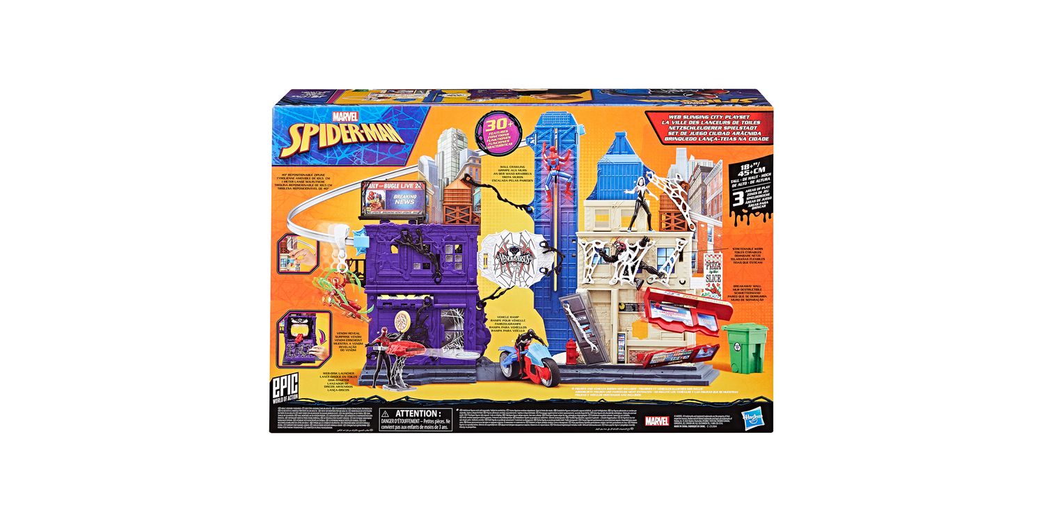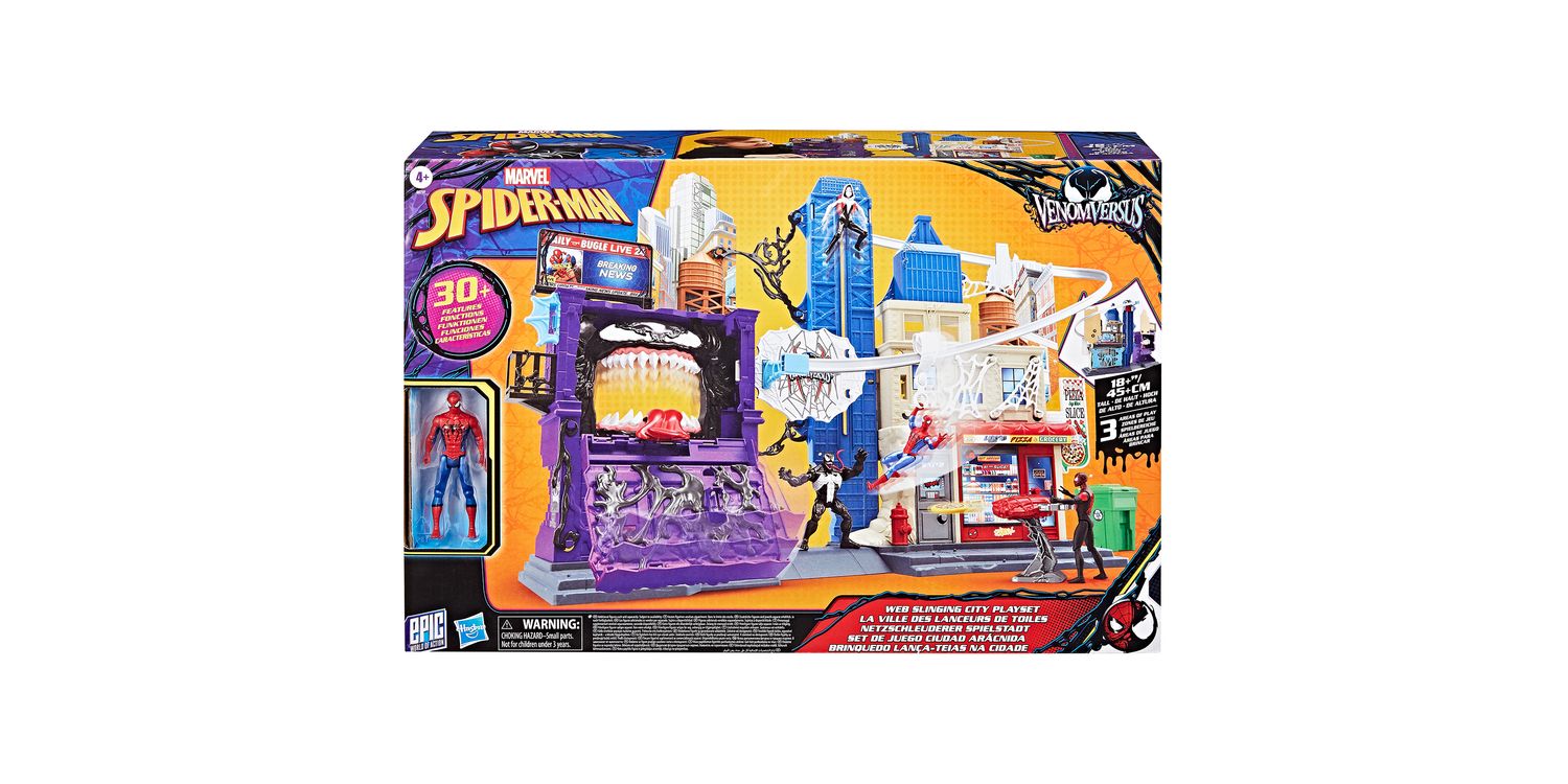 Imagine saving the city from Venom with the Marvel Spider-Man Web Slinging City Playset! This massive toy set stands over 18 inches tall and boasts over 30 friendly neighbourhood features, including 360 degrees of play. Kids ages 4 and up can enjoy hours of excitement, sending the included Spidey toy swinging throughout the city on a 38-inch repositionable zipline or simulating real wall-crawling, climbing action. 10 included stretchy webs attach to the playset and additional 4-inch Epic World of Action figures (sold separately. subject to availability) can be held captive them. But watch out for the flip-down wall that reveals a huge, chomping Venom face, ready to gobble up the Marvel Super Heroes! This cool toy set will be the perfect gift for kids or a great addition to any Super Hero toy collection. Look for more Marvel toys to collect or gives as gifts, including figures, vehicles, playsets, & roleplay gear! (Each sold separately. Subject to availability.)
