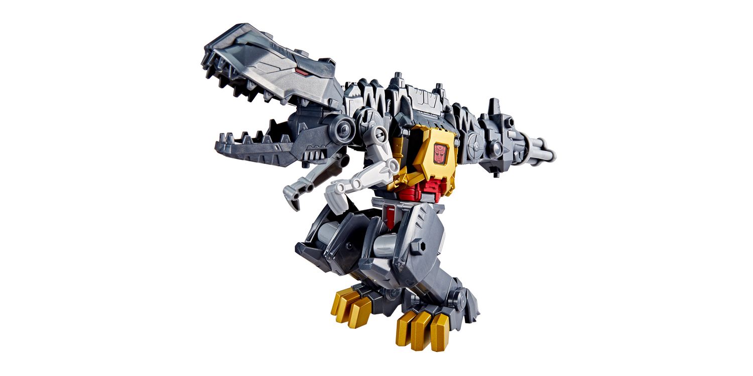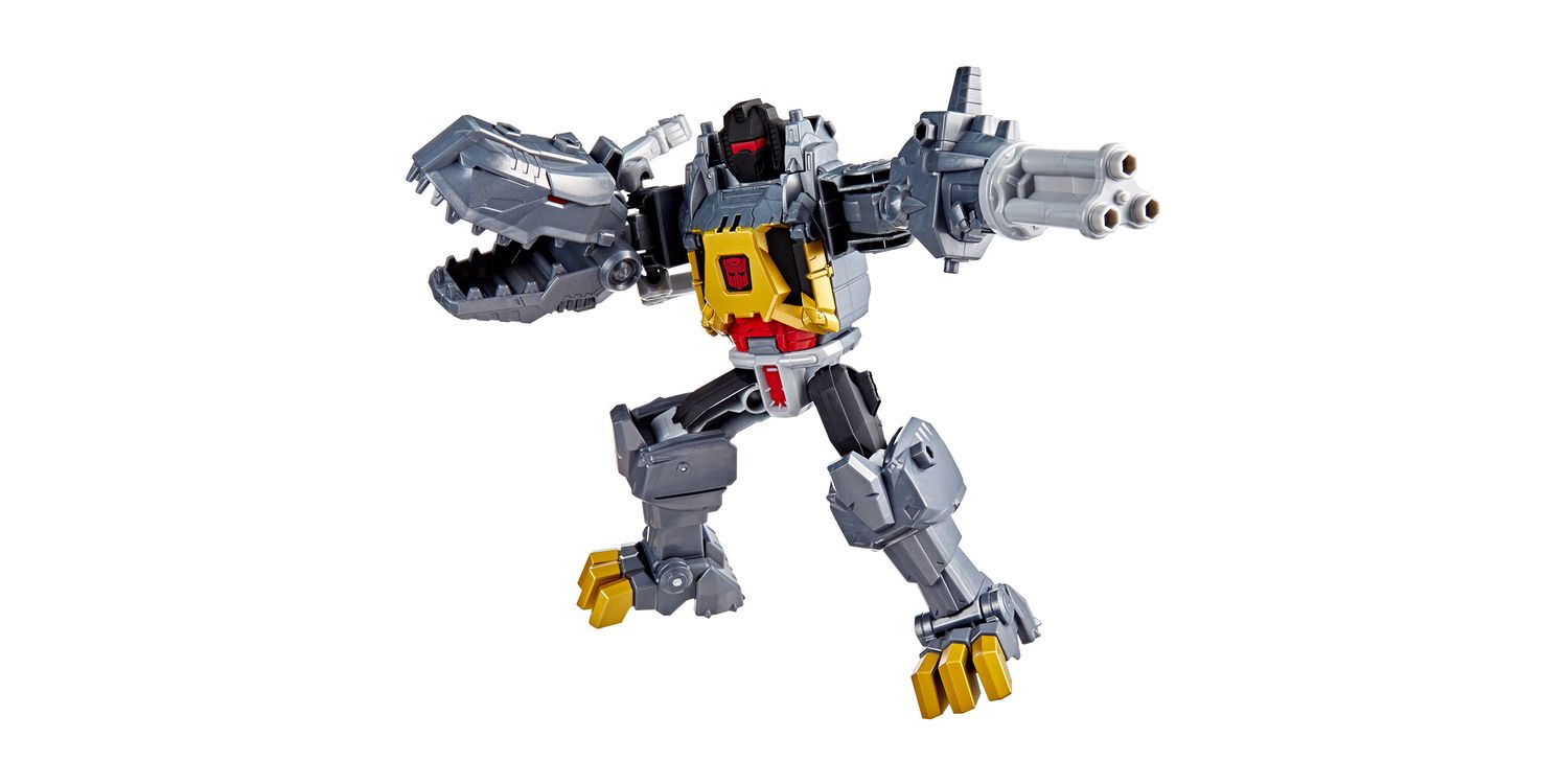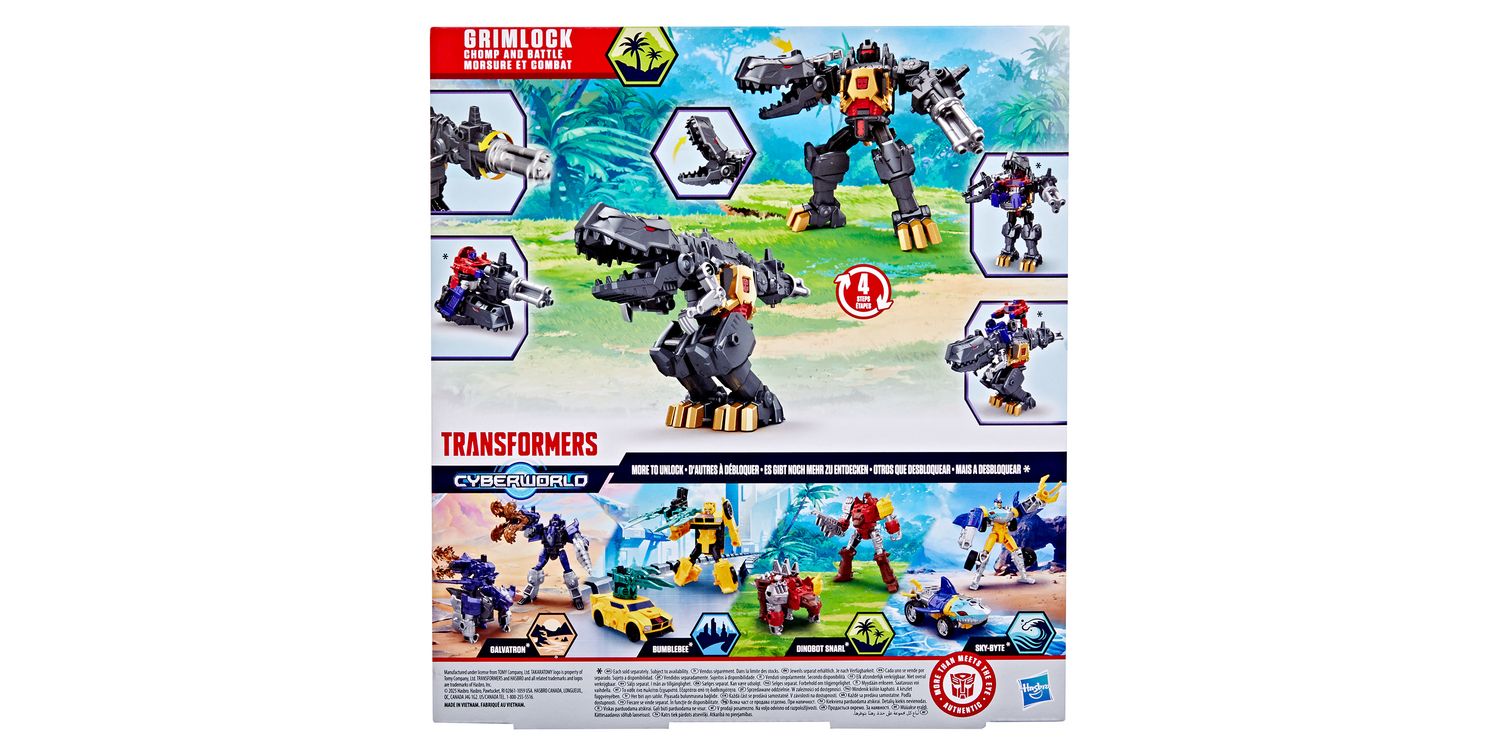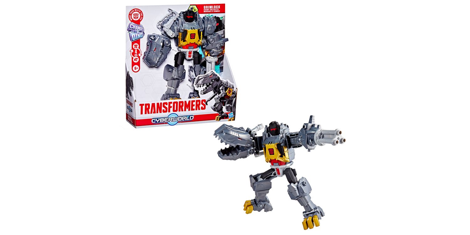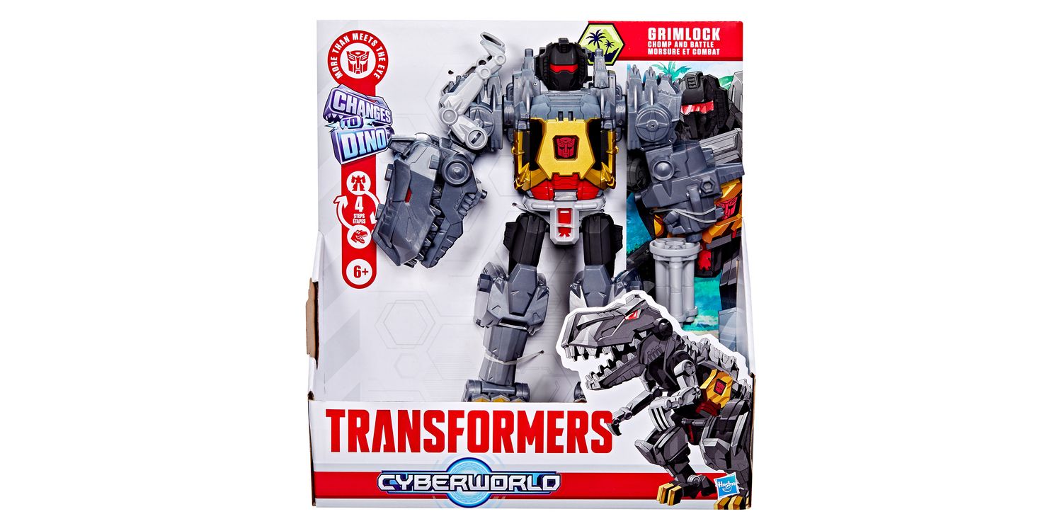 In Transformers CYBERWORLD, kids decide what happens — and it starts with awesome toys like the Grimlock Chomp & Battle figure! This 9-inch (22.5 cm) Grimlock toy changes from robot to dino in just 4 steps that are simple enough for kids ages 6 and up. In robot mode, this toy features a spinning blaster arm, chomping dino arm, and a chest panel that opens into a mech suit for Cyber Changers figures (each sold separately, subject to availability).