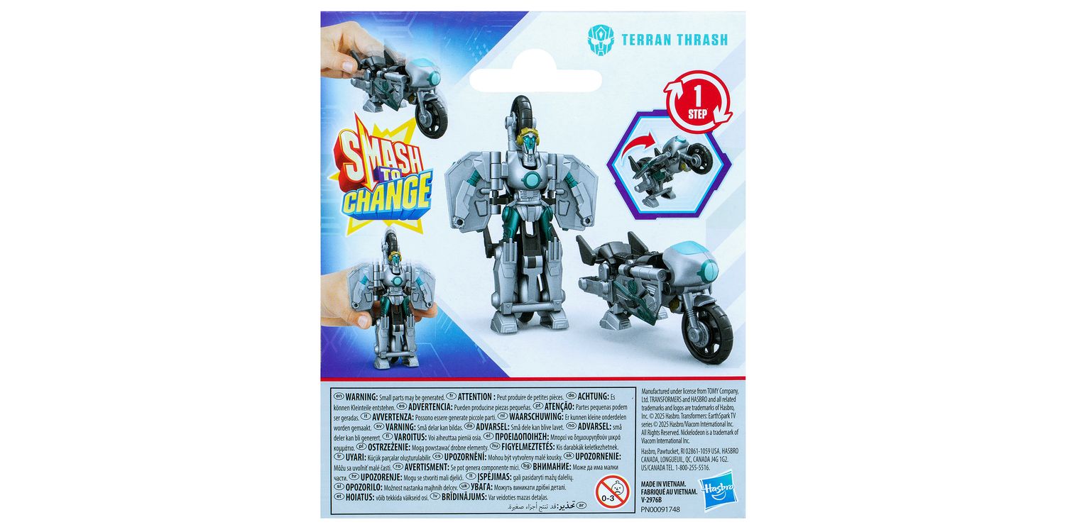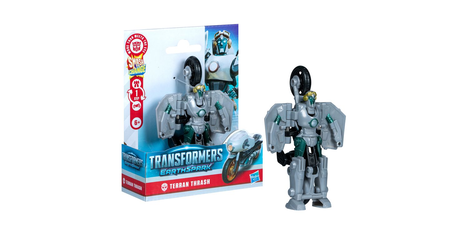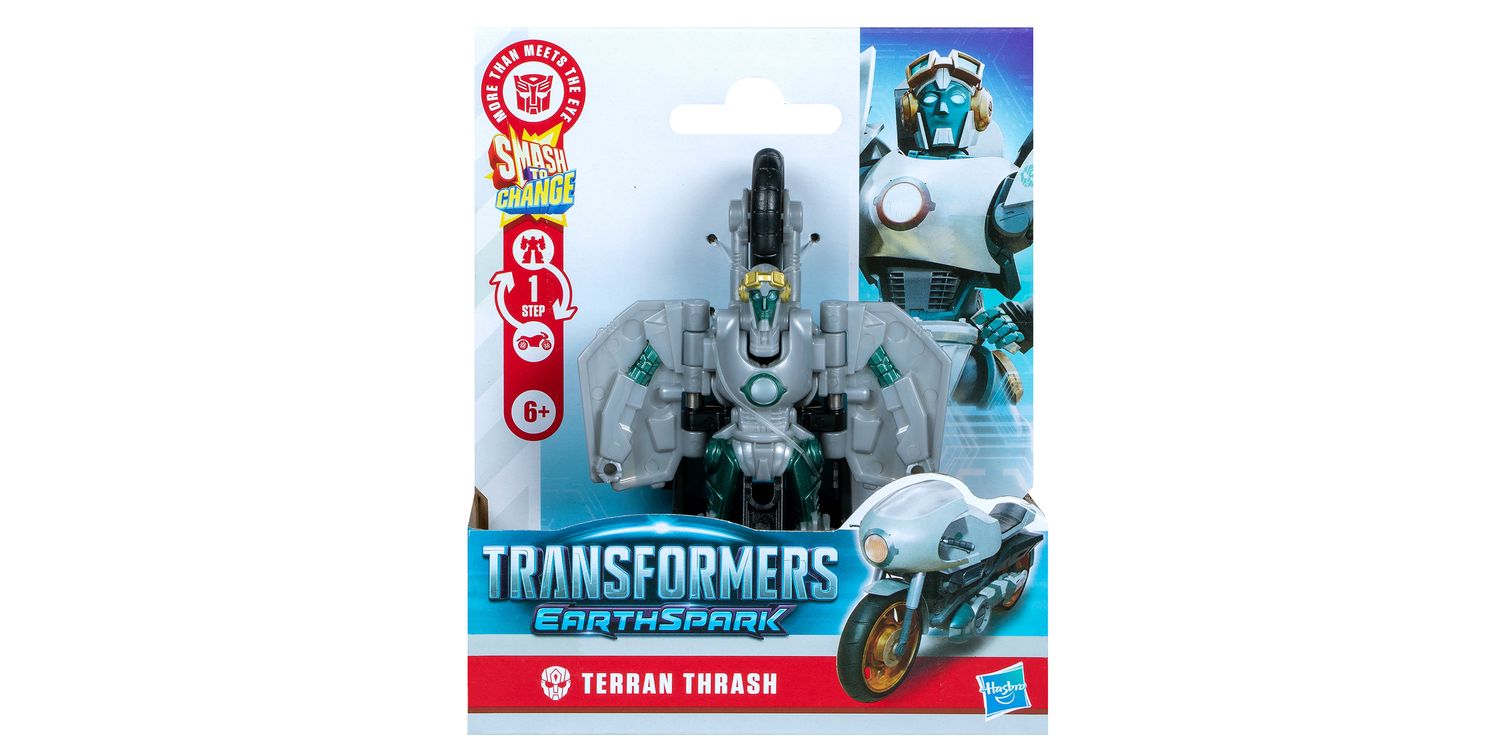 Smash into action with the Transformers: EarthSpark 1-Step Smash Changer Terran Thrash action figure! Convert this Transformers action figure from motorcycle mode into robot mode by smashing it on a flat surface! The motorcycle toy pops up into a robot toy!