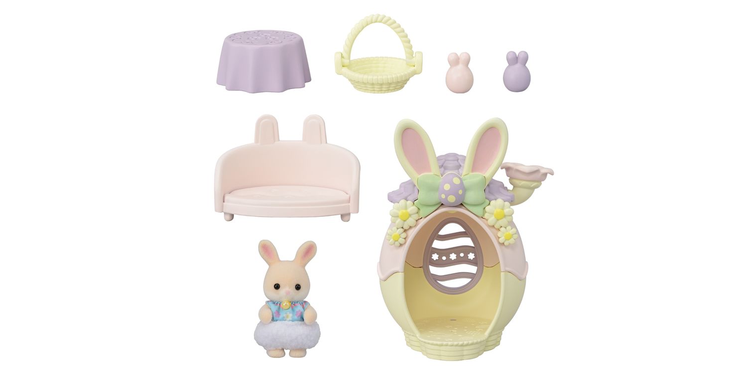A seasonal product. This set includes the Marguerite Rabbit baby, accessories and a little house with a bunny and Easter egg motif. Hide the rabbit-shaped Easter eggs in places like the chimney and under the tablecloth for an Easter egg hunt. There are egg motifs hidden all over the house and furniture—see how many you can spot! The Marguerite Rabbit baby is wearing a cute Easter-themed outfit.
