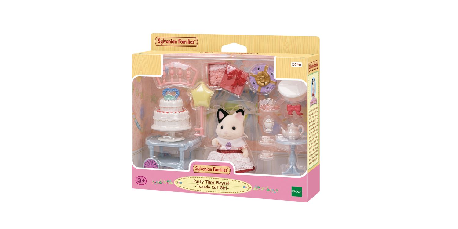 It's party time! The Sylvanian Families Party Time Playset - Tuxedo Cat Girl features Tuxedo Cat girl Lily in an exclusive party dress, plus a lavish two-tier cake and presents.
