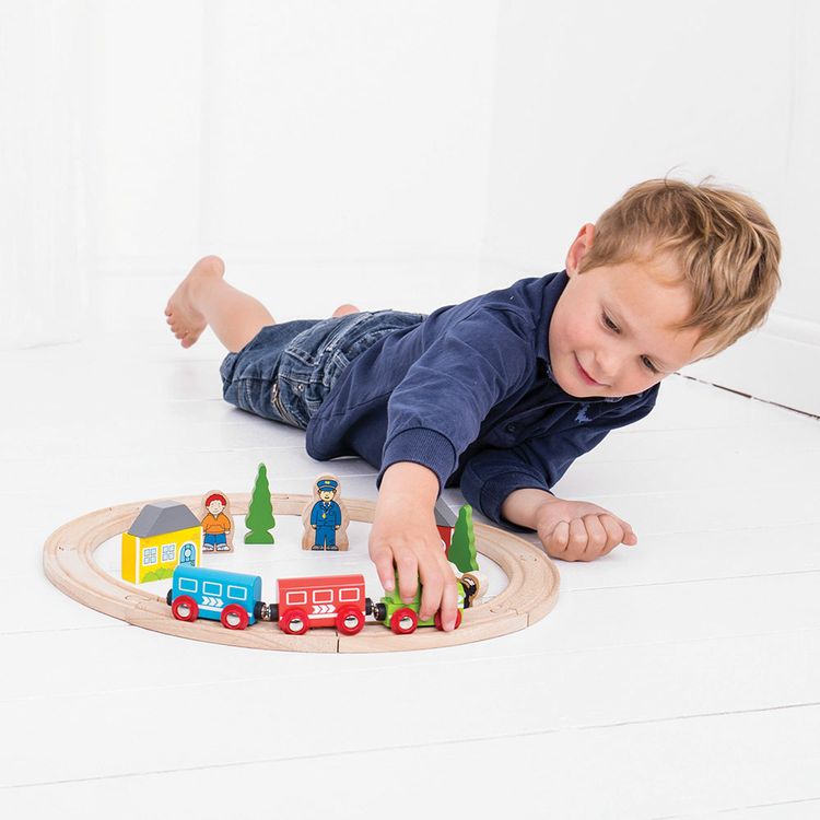 All aboard! Where are you travelling to today? Bigjigs' My First Train Set is a creative and educational way to play! The chunky toy train pieces are perfect for being grabbed by little hands, making this the ideal wooden train set for toddlers. Young train drivers are encouraged to take part in role play and will be able to create a unique travel scene each time. The bright colours are great for stimulating little minds and are made with child-friendly paint, stains and lacquers. My First Train Set is made from high quality, responsibly sourced materials which gives it years of play. It also conforms to the current European safety standards. Additional accessories are available to expand this train set, and most other major wooden railway brands are compatible with Bigjigs Rail.