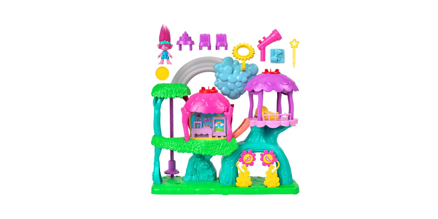 Preschool kids can create their own action-packed trolls-tastic adventures with Queen Poppy at the Imaginext® DreamWorks Trolls© Lights & Sounds Rainbow Treehouse, from Fisher-Price®.