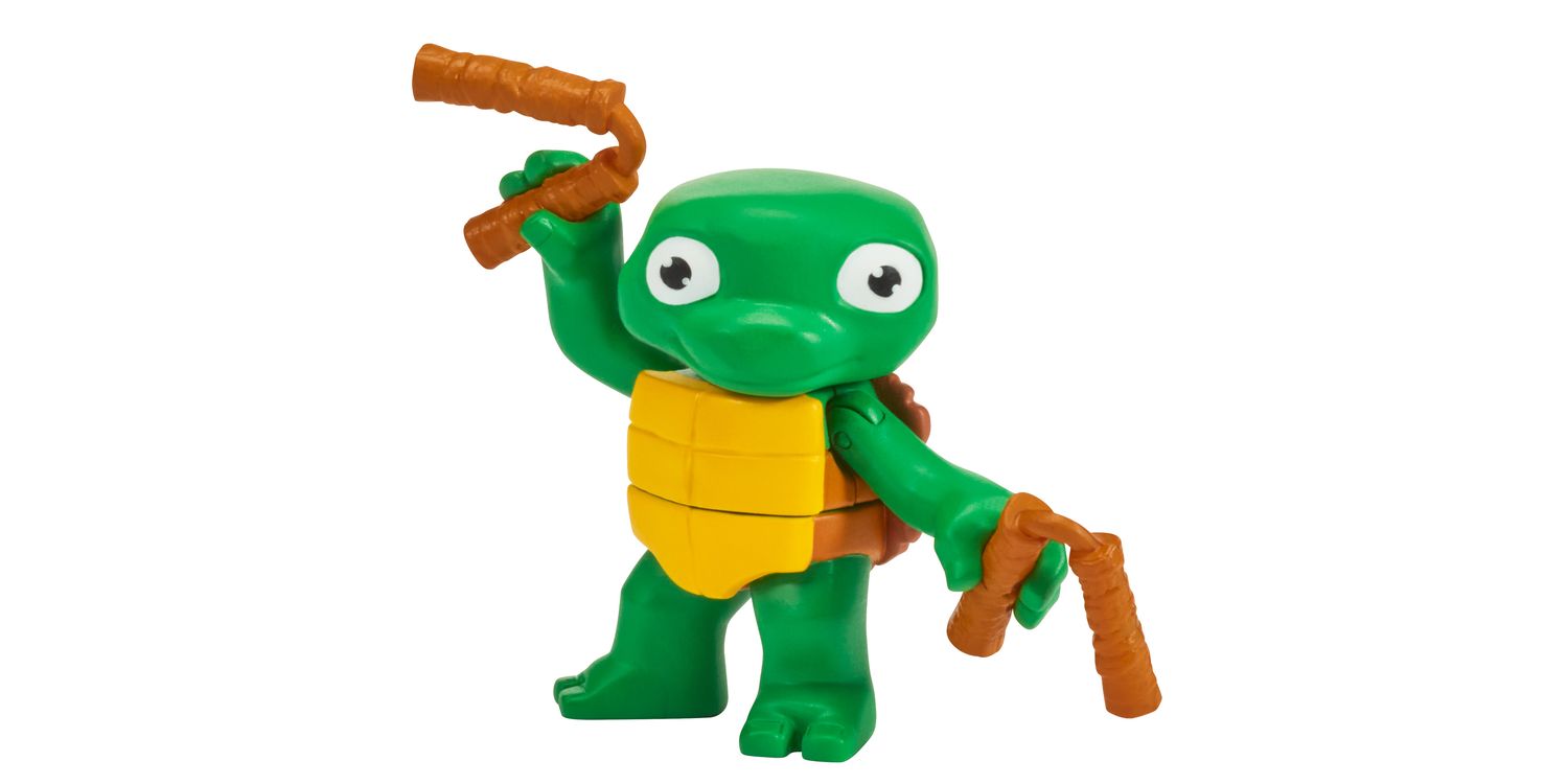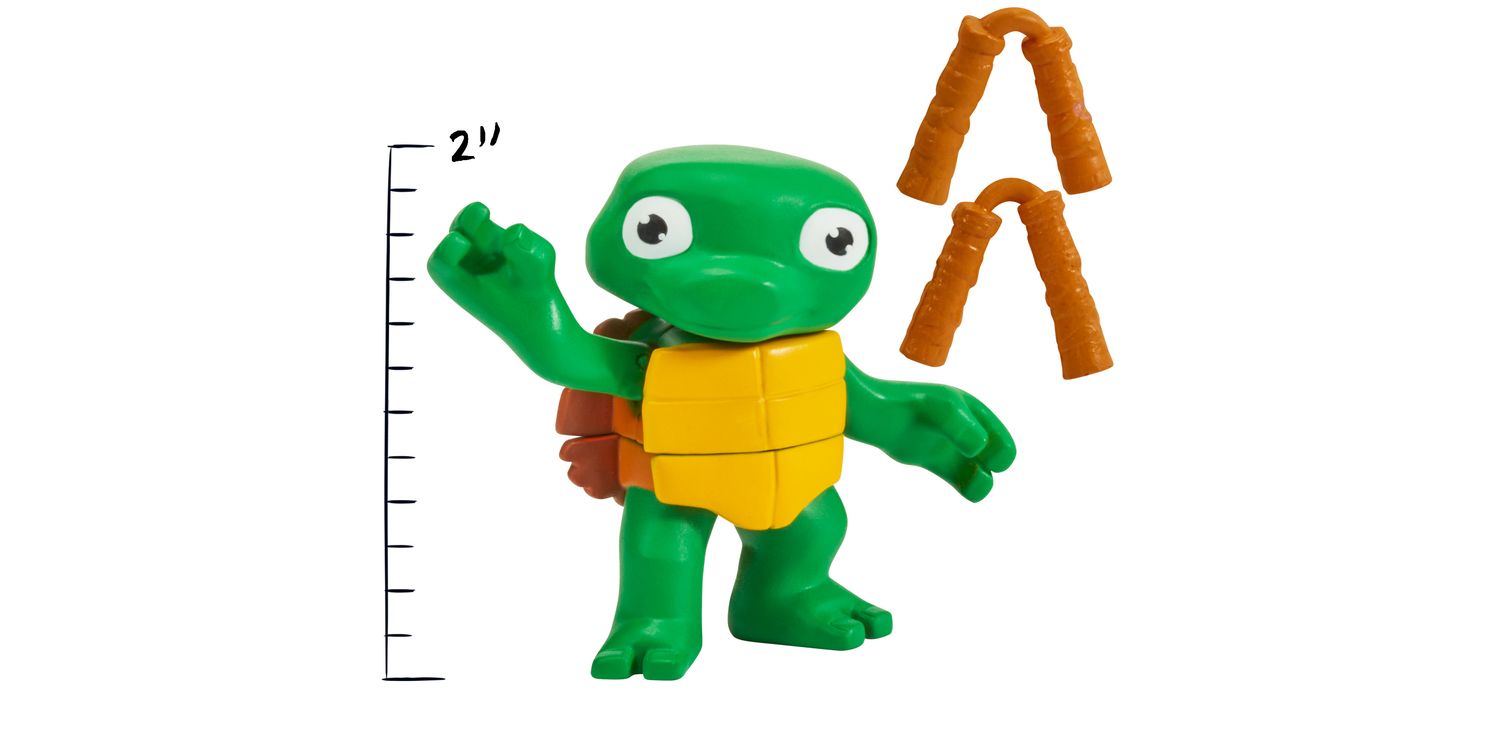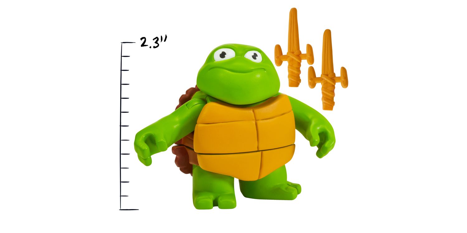 This Turtle Tots 2-pack includes 3-Inch Michelangelo and 3.5-Inch Raphael figures, as seen in the hit movie! Before they became ninjutsu experts, the Teenage Mutant Ninja Turtles were fumblin', bumblin' Turtle Tots who were always causing havoc and driving Splinter nuts! As the Turtle Tots matured, Master Sensei Splinter taught his young mutants the way of the ninja by watching martial arts videos. The tots learned quickly and Splinter even made them training weapons to perfect their ninja skills. By the time they reached their teenage years, they were quickly transformed into the Teenage Mutant Ninja Turtles! Set includes their iconic ninja weapons.